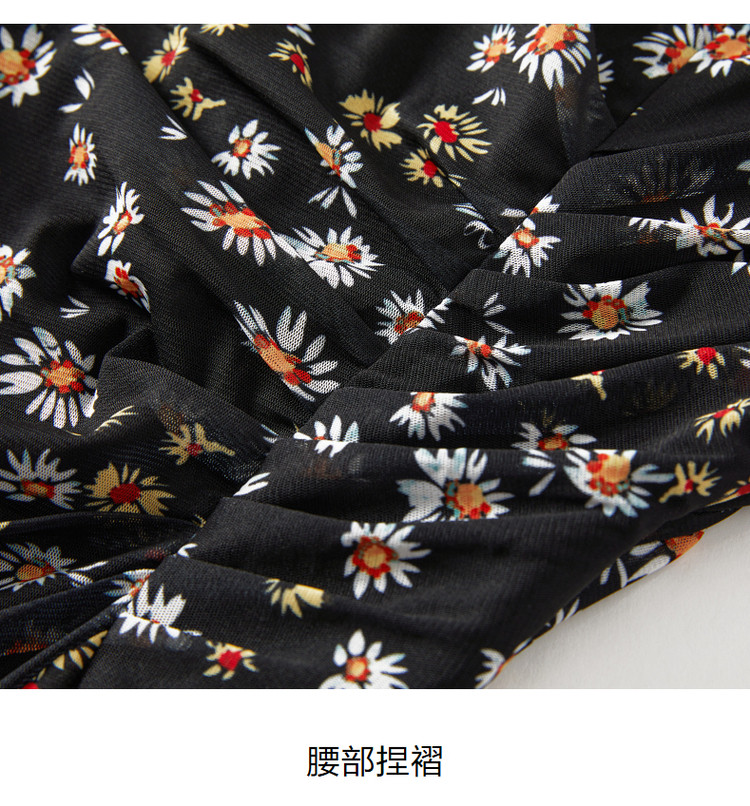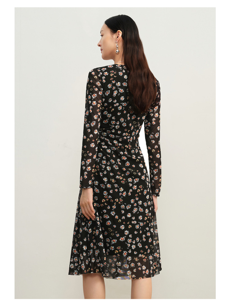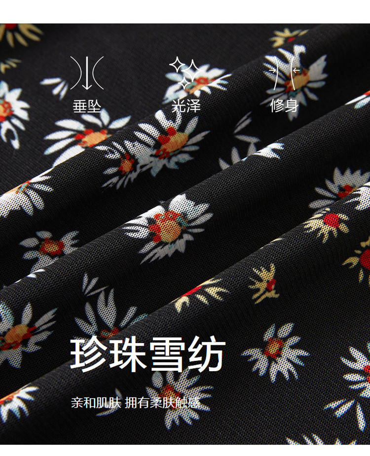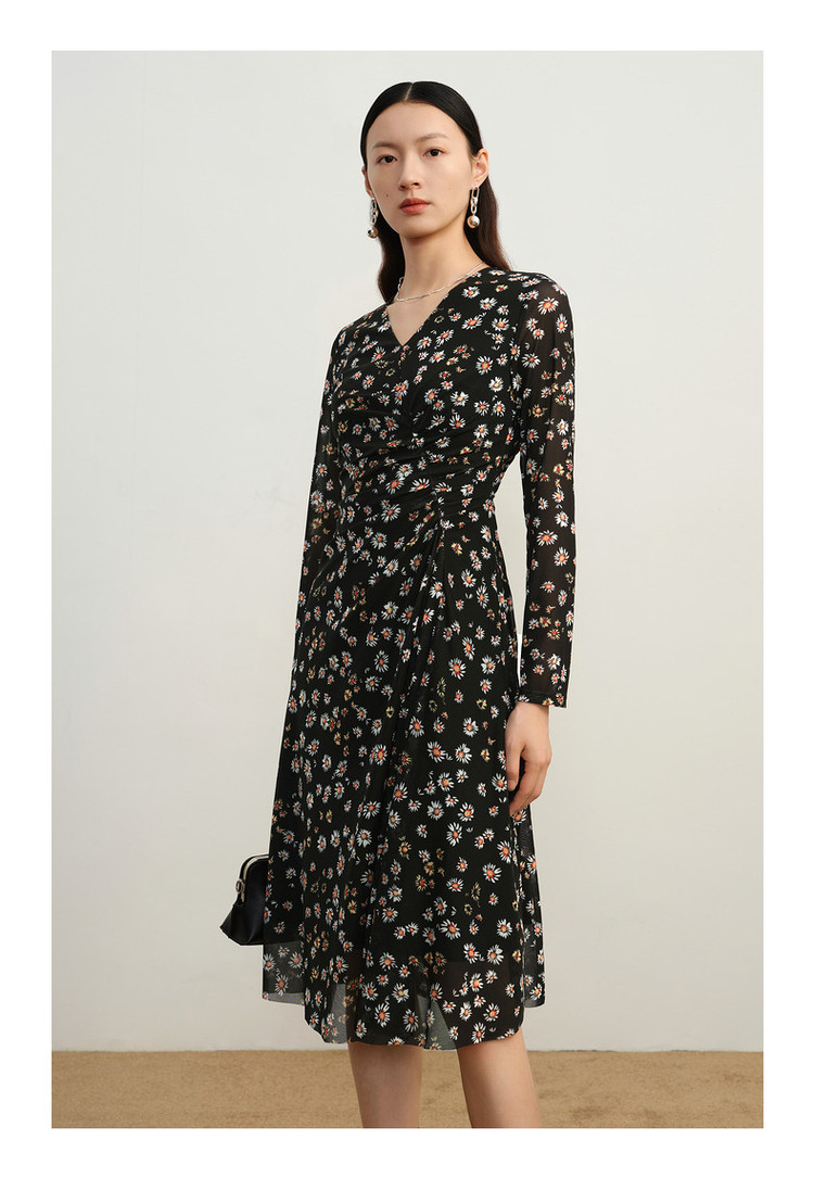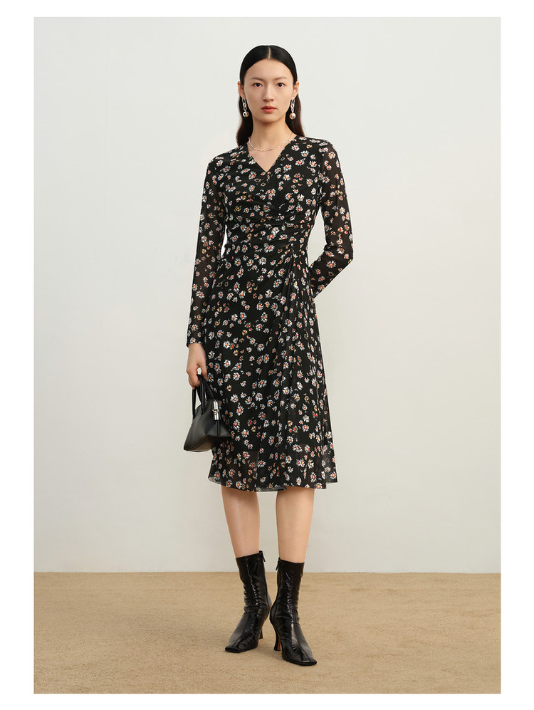 玖姿旗下安娜蔻系列雅致V领修身碎花沙罗面料连衣裙女秋季 100620