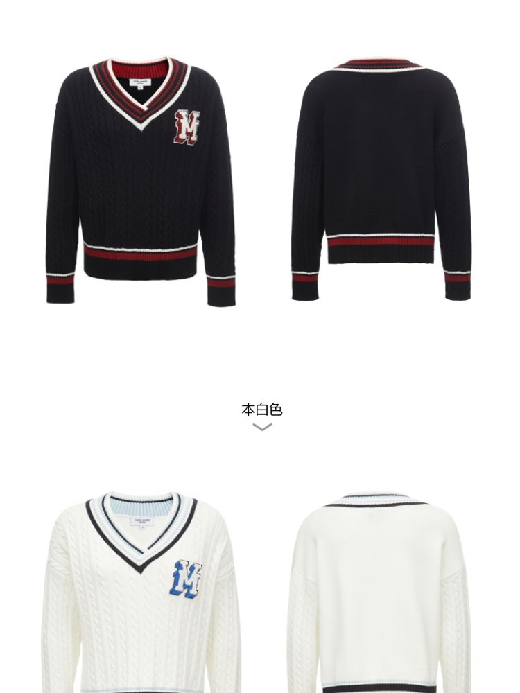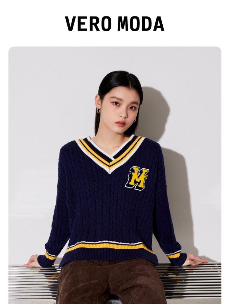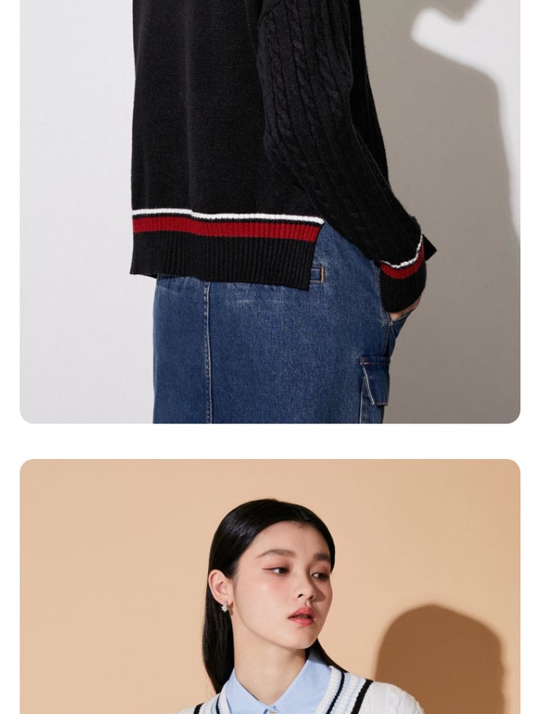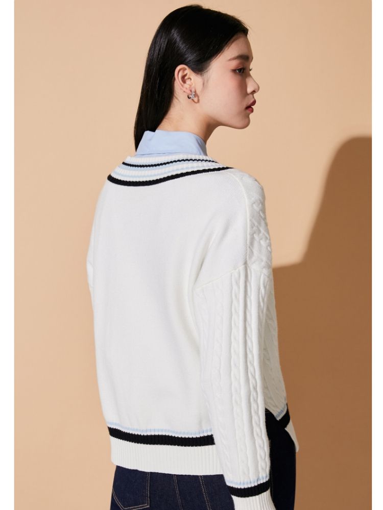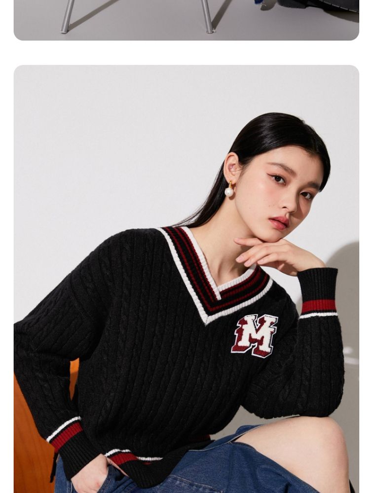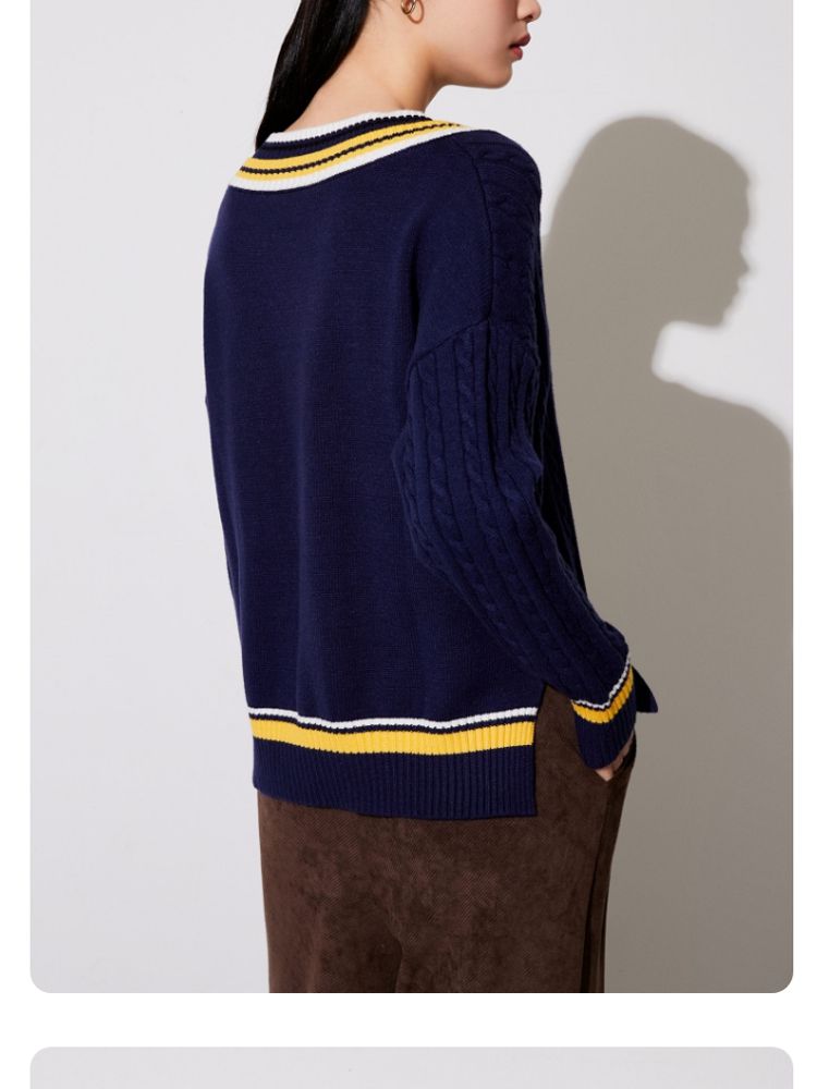 【学院风针织衫】春夏宽松绞花套头V领拼色毛衣百搭 273233