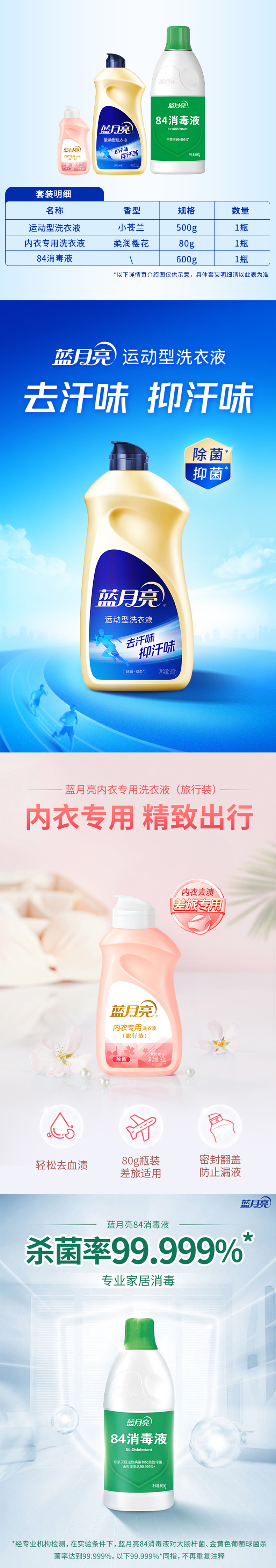 商品名称:蓝月亮洗护消毒除菌套装 运动洗衣液500g+内衣洗衣液80g+84消毒液600g