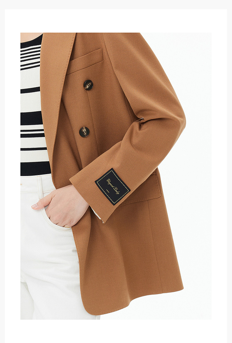 冬季零压感绵羊毛双排扣气质通勤驼色毛呢外套大衣 851355