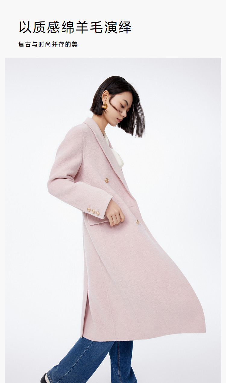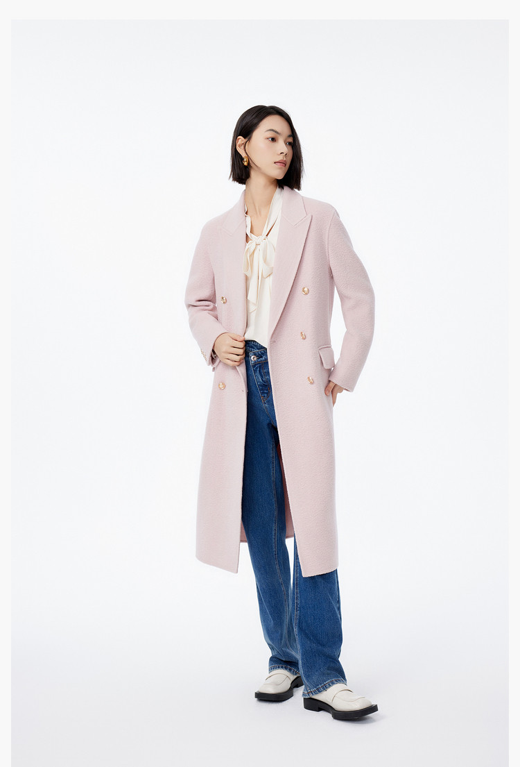 冬季绵羊毛复古双排扣气质通勤长款毛呢外套大衣女 035675