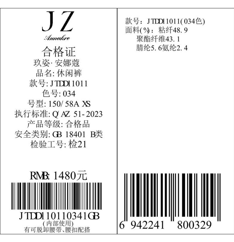 商品名称:玖姿旗下安娜蔻系列通勤干练阔腿裤宽松长裤女冬季 429452