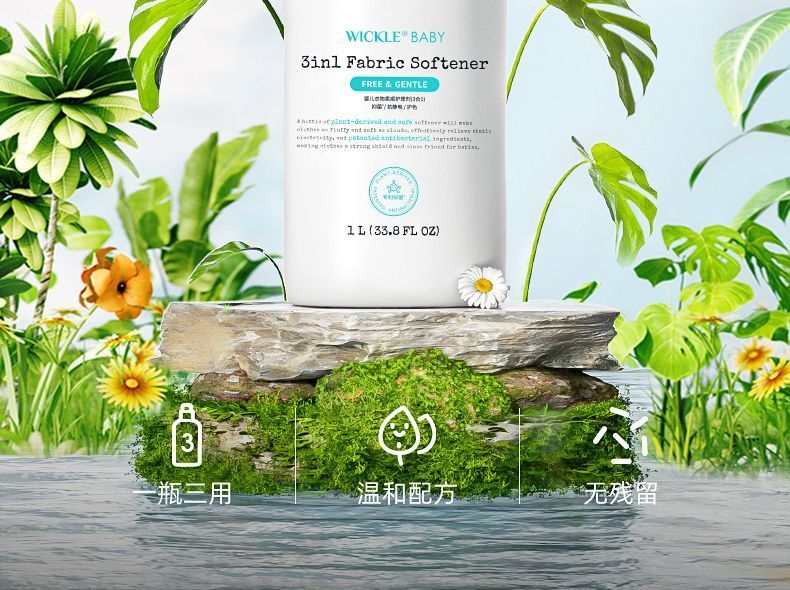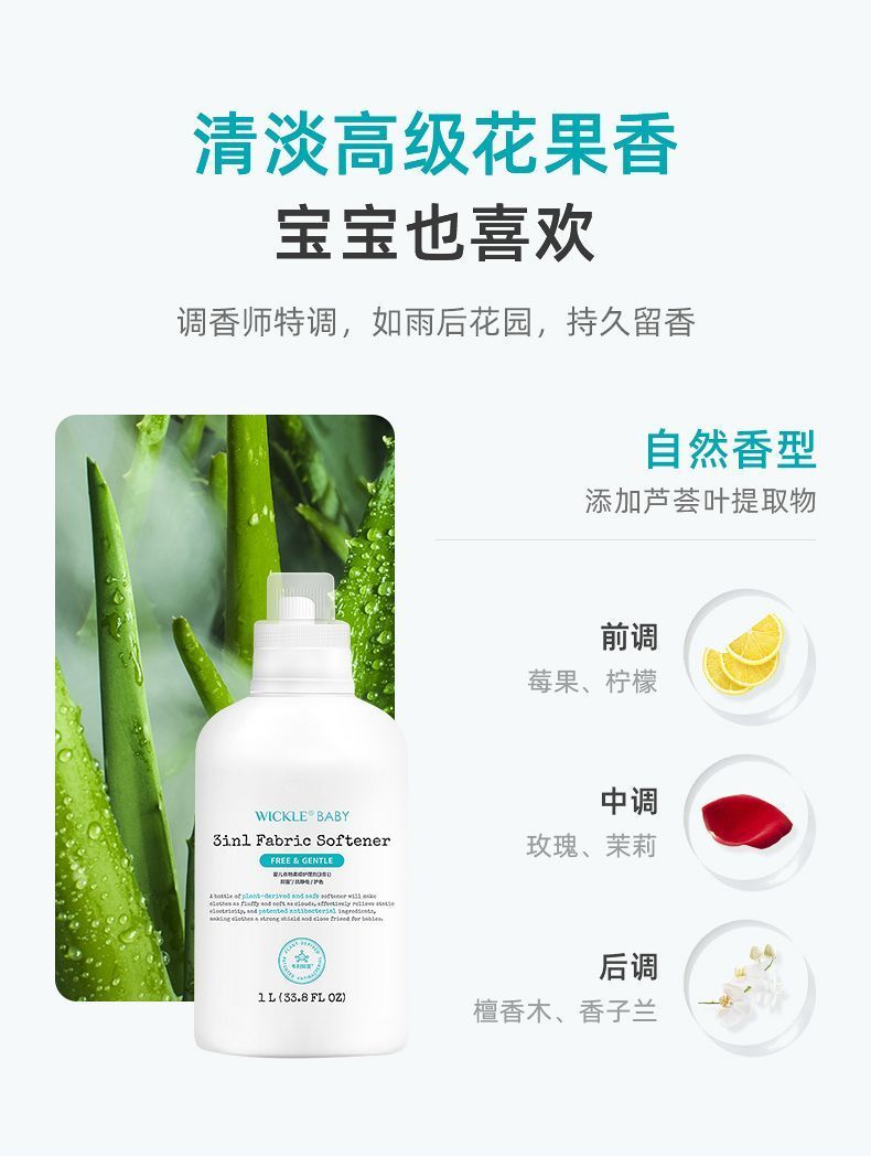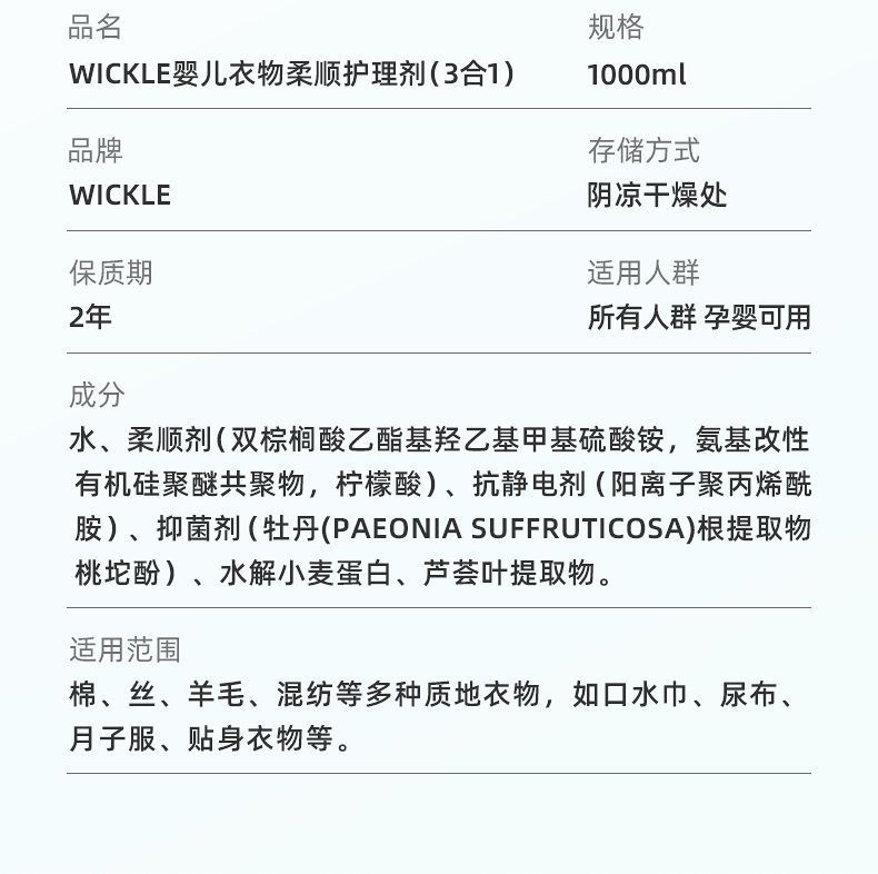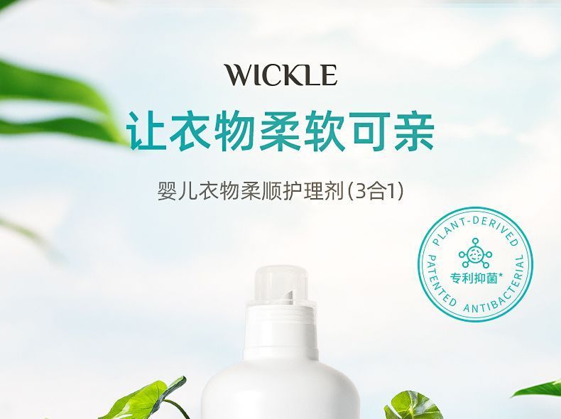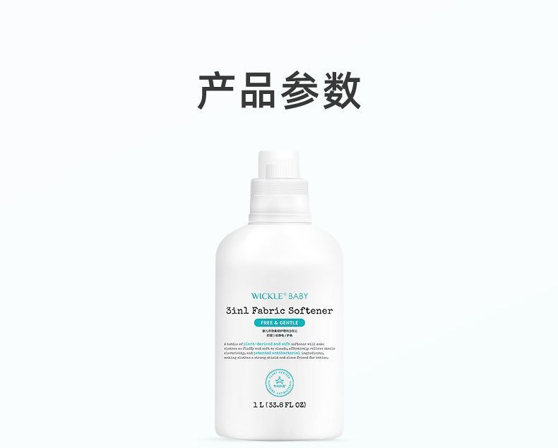 商品名称:wickle 宝宝儿童专用衣物抑菌3合1柔顺剂(1L*1瓶)