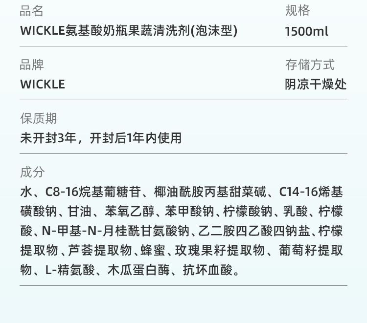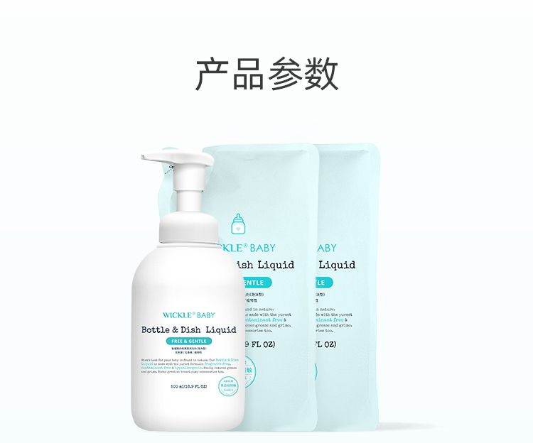 商品名称:wickle 宝宝专用奶瓶果蔬玩具清洗剂(500ml*1瓶+500ml*2袋+50ml便携)