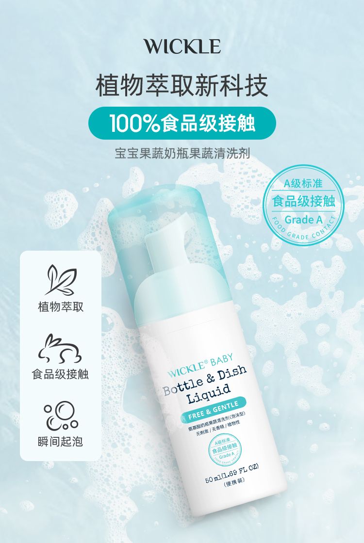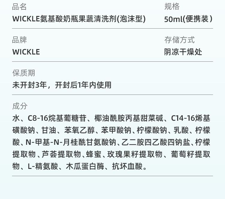 商品名称:wickle 宝宝专用奶瓶果蔬清洗剂便携装(50ml*1瓶)
