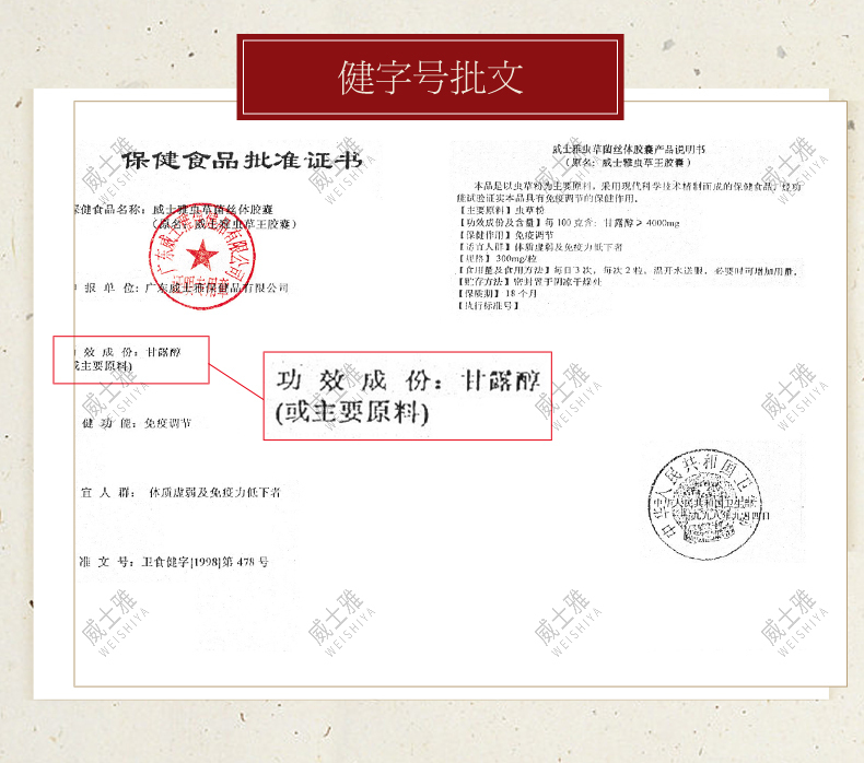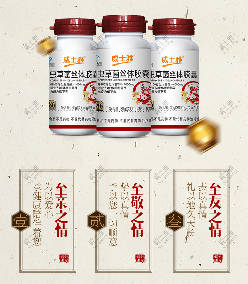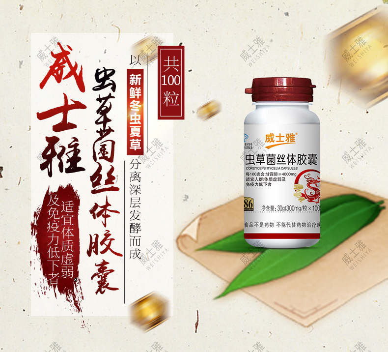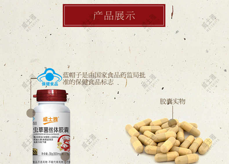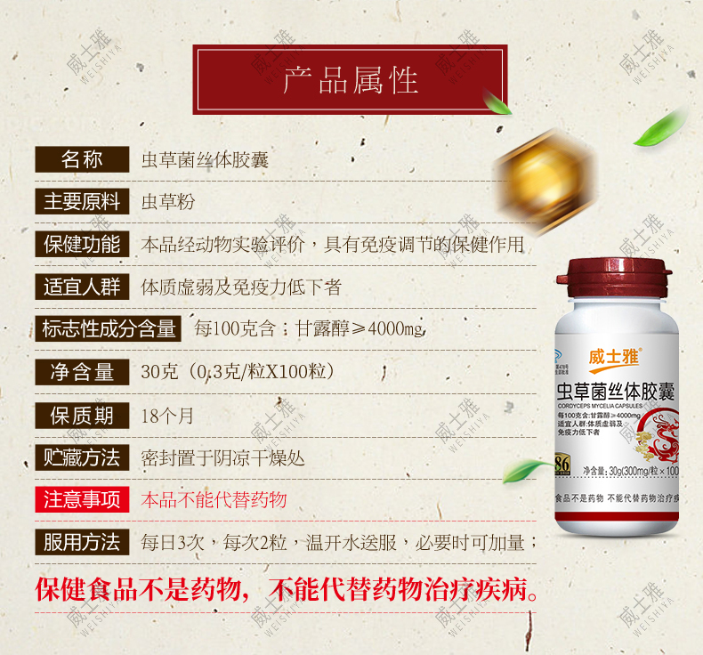 商品名称:威士雅虫草菌丝体胶囊抗疲劳增强胶囊300mg/粒×100粒O301