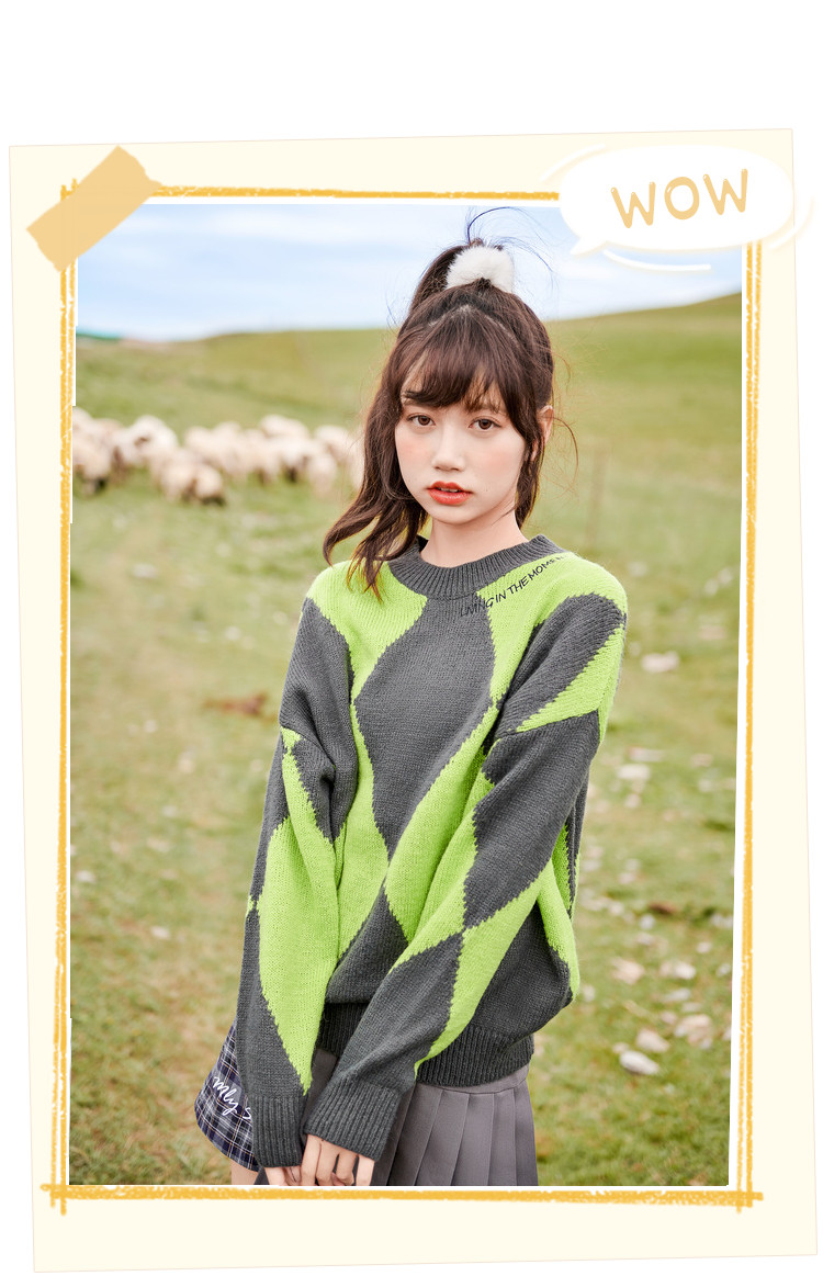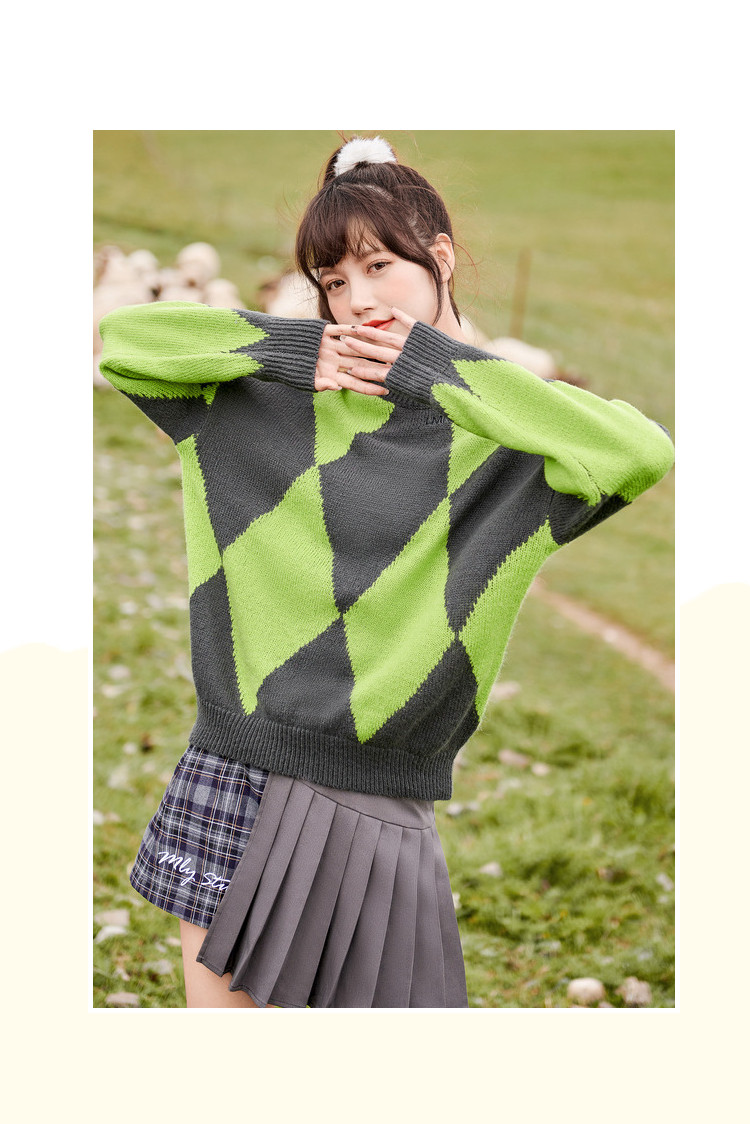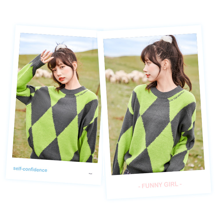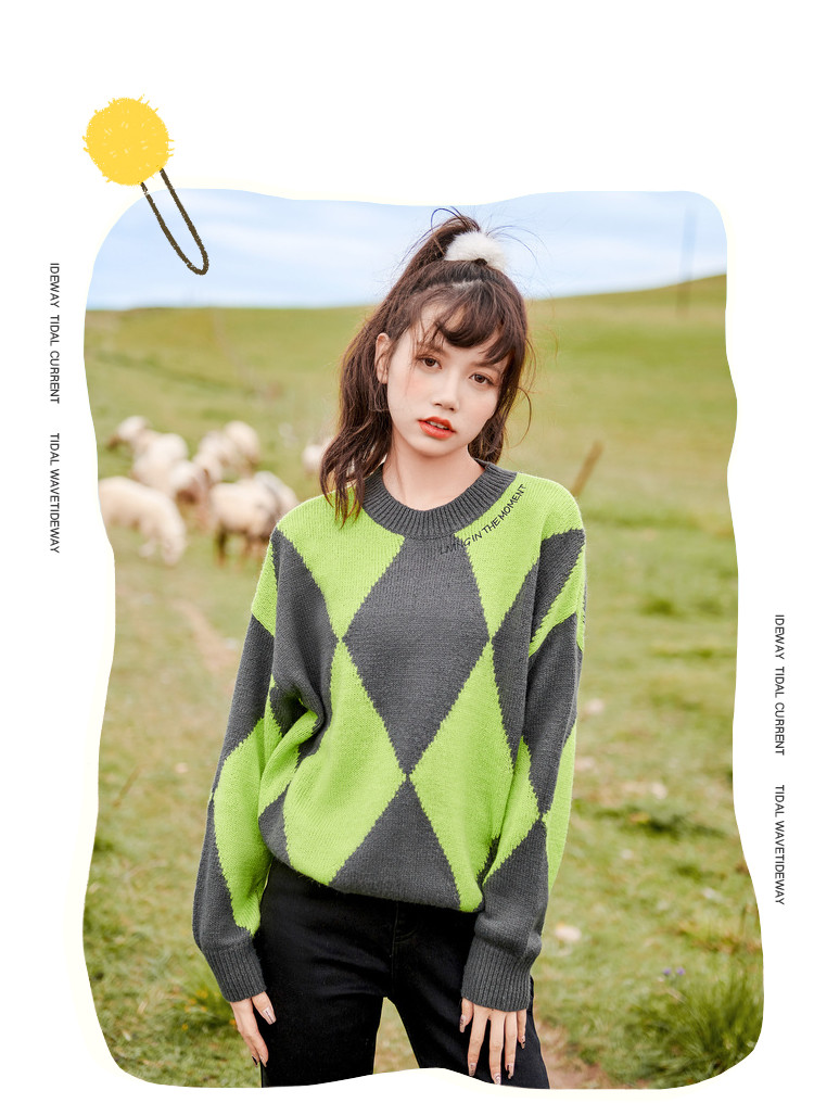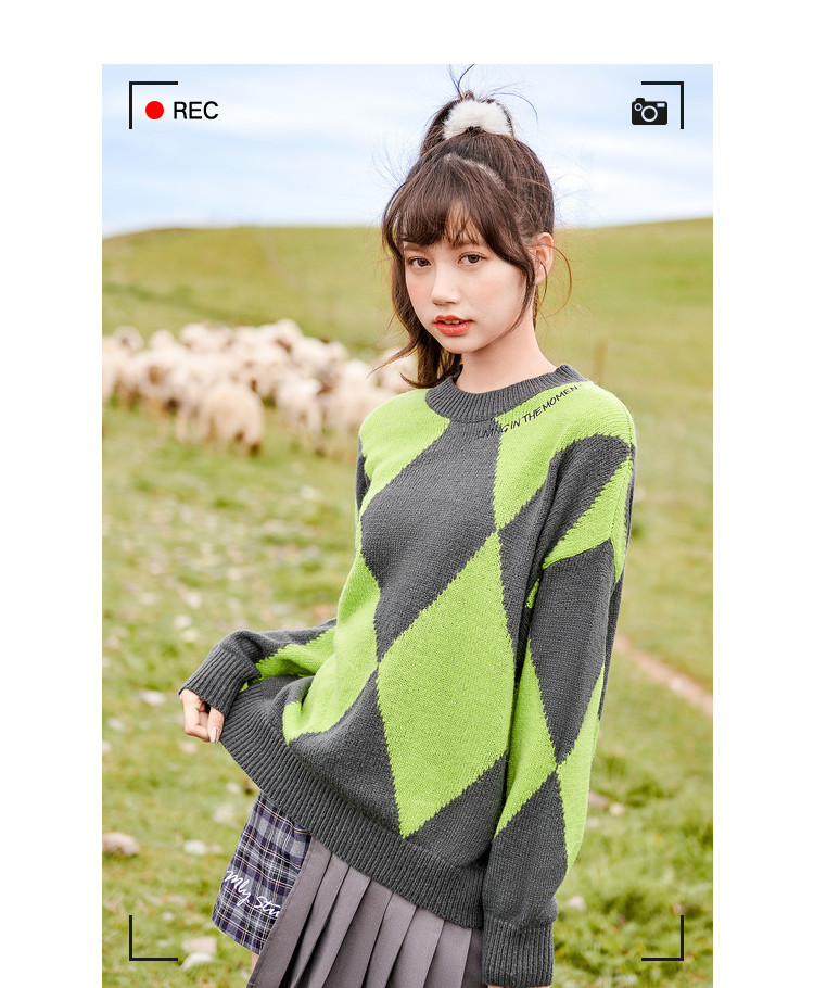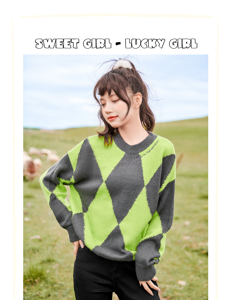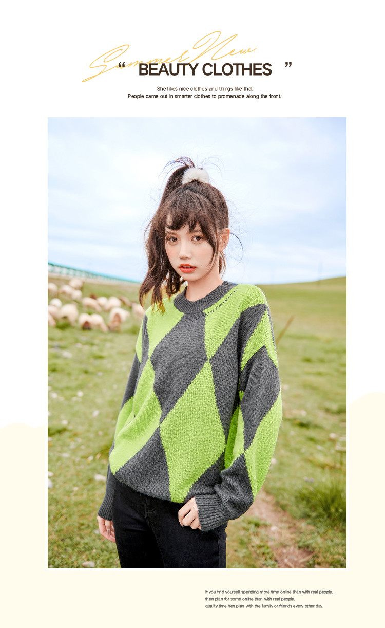 商品名称:冬复古慵懒风毛衣女撞色菱格长袖保暖套头上衣潮 051284