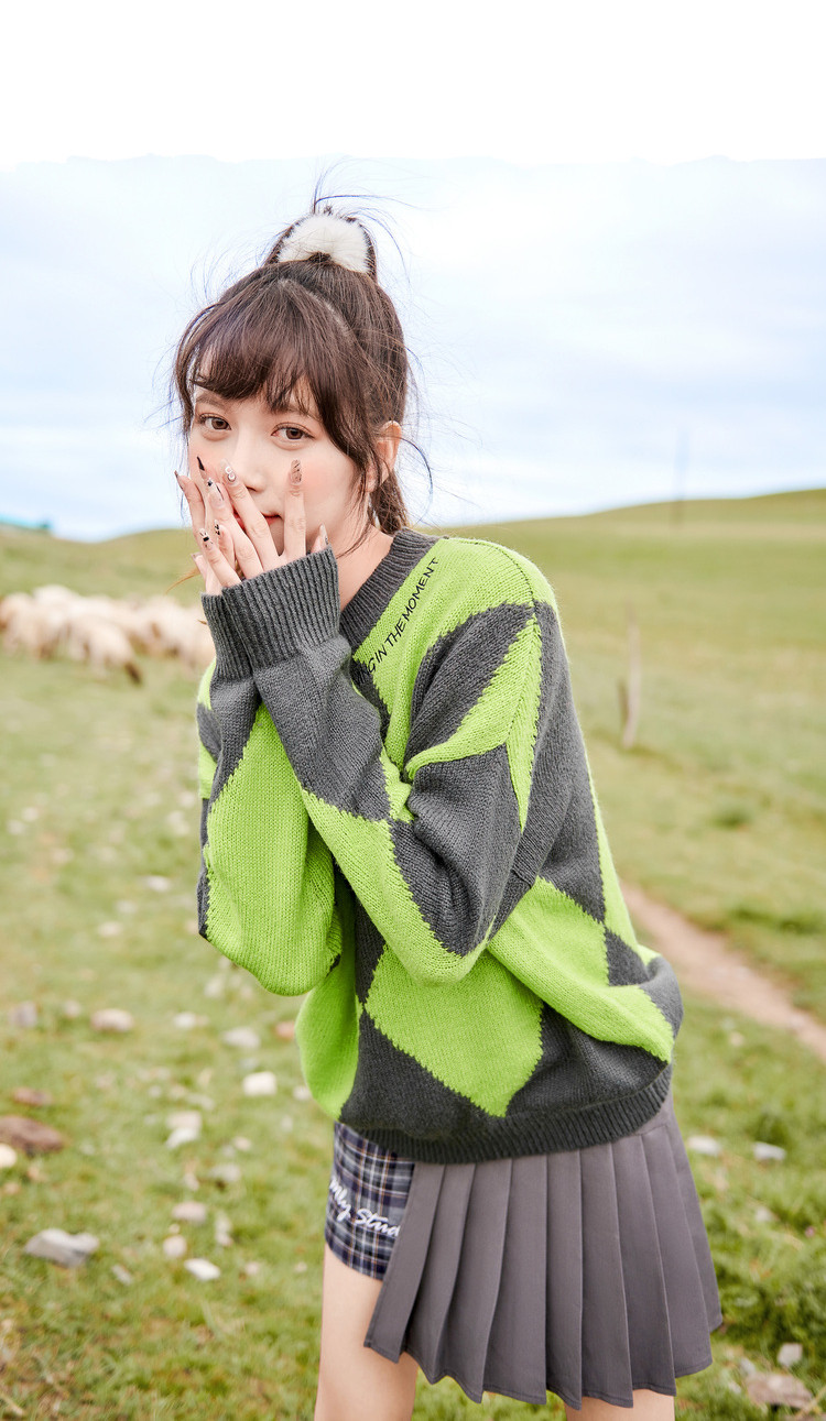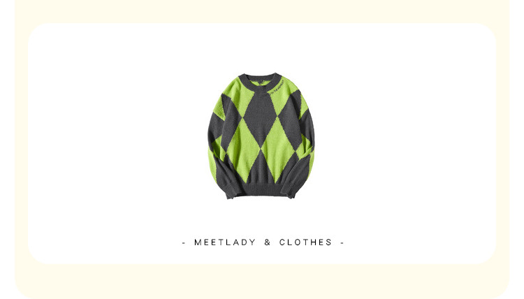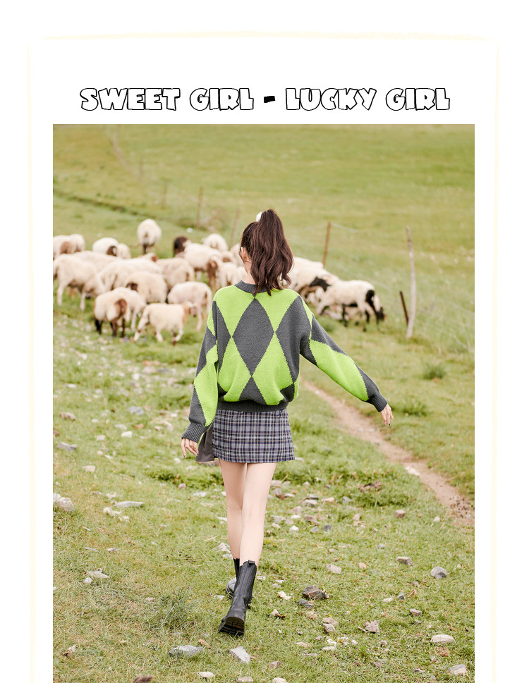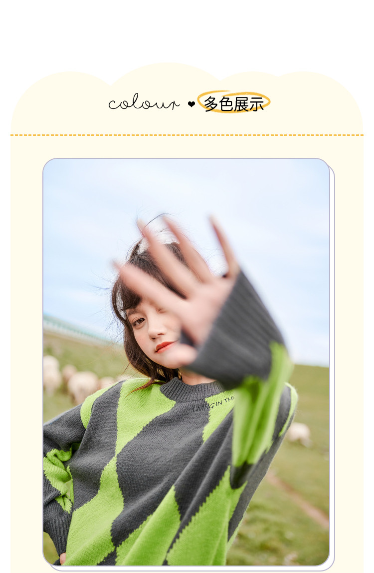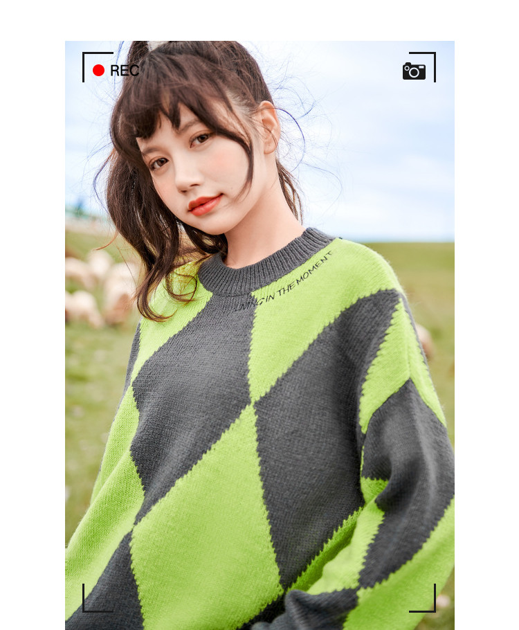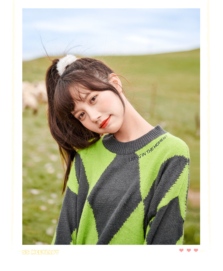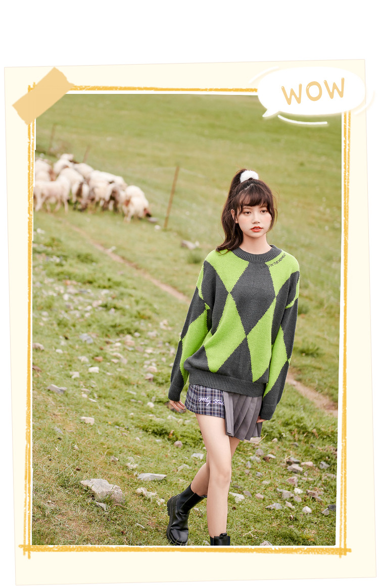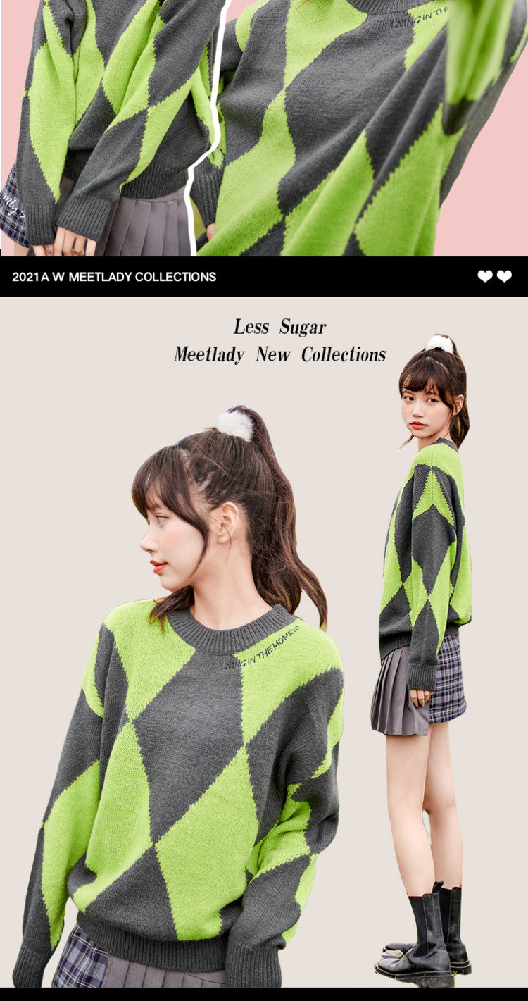 商品名称:冬复古慵懒风毛衣女撞色菱格长袖保暖套头上衣潮 051284