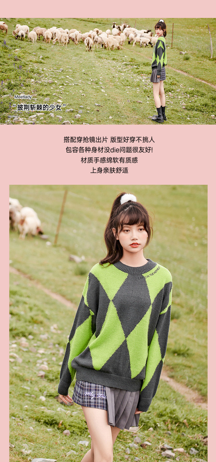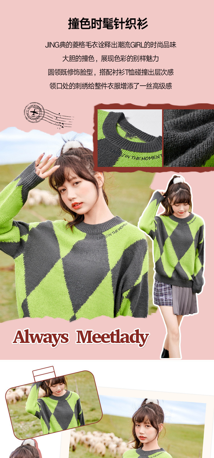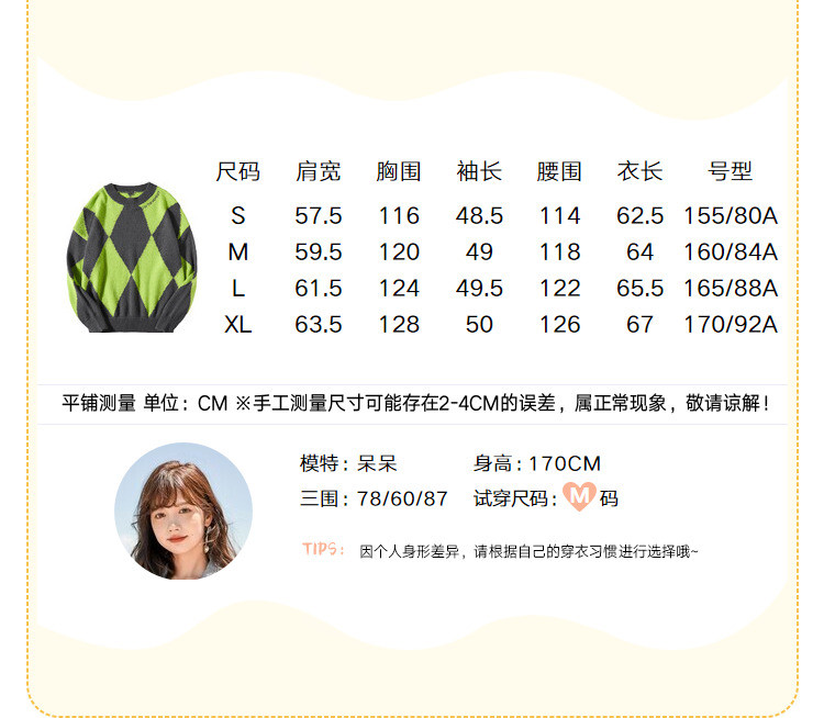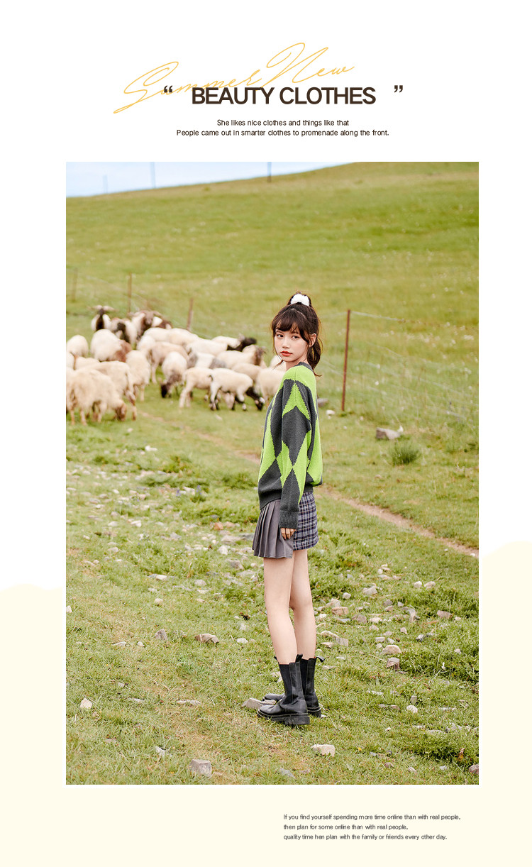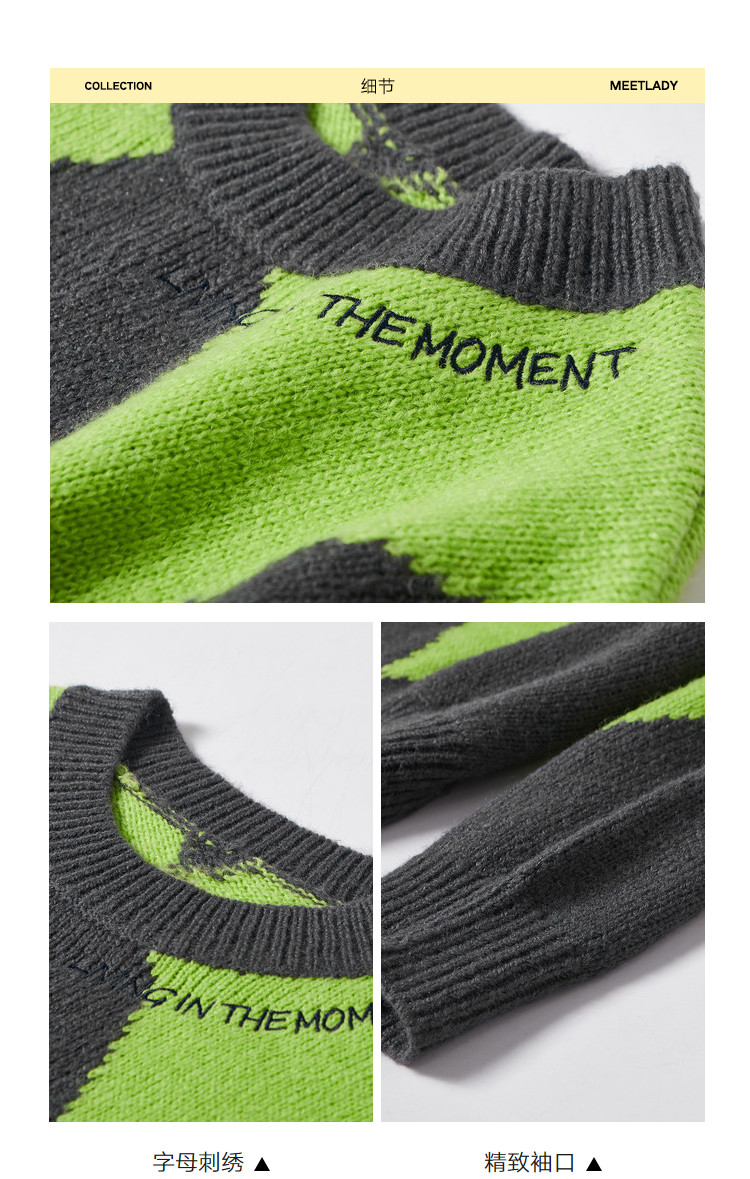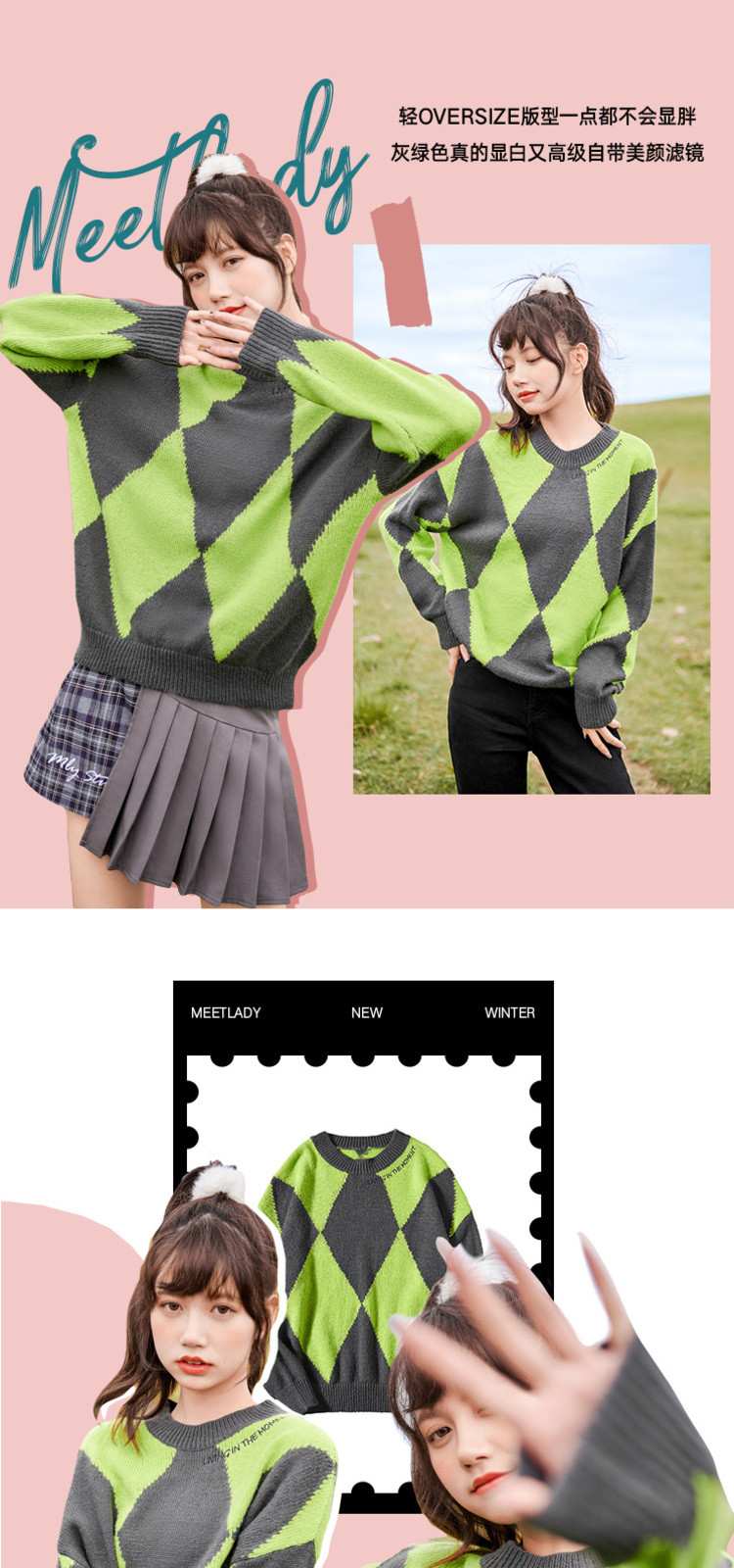 商品名称:冬复古慵懒风毛衣女撞色菱格长袖保暖套头上衣潮 051284