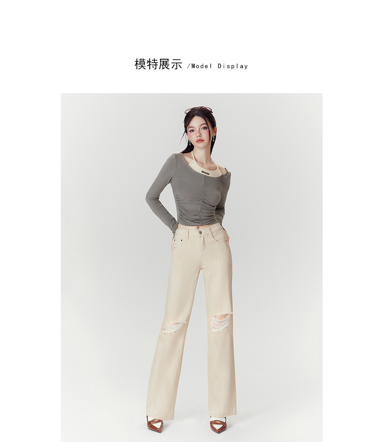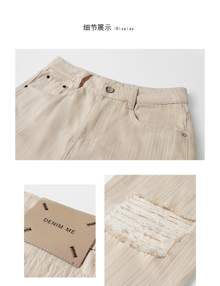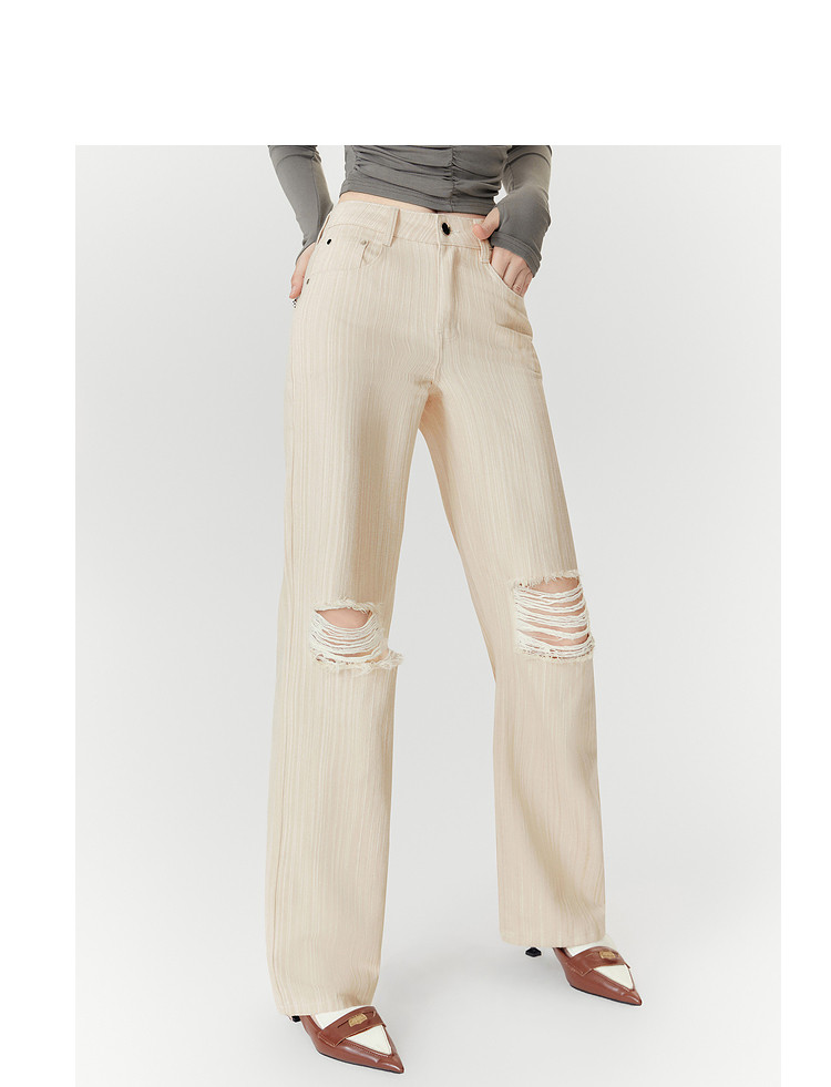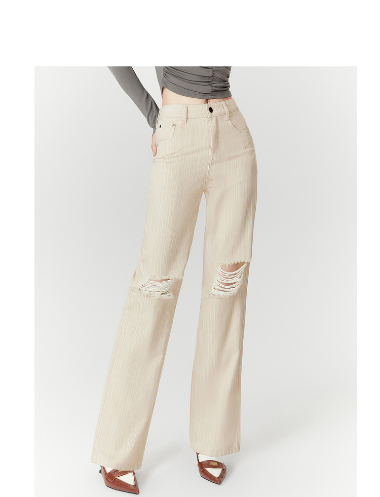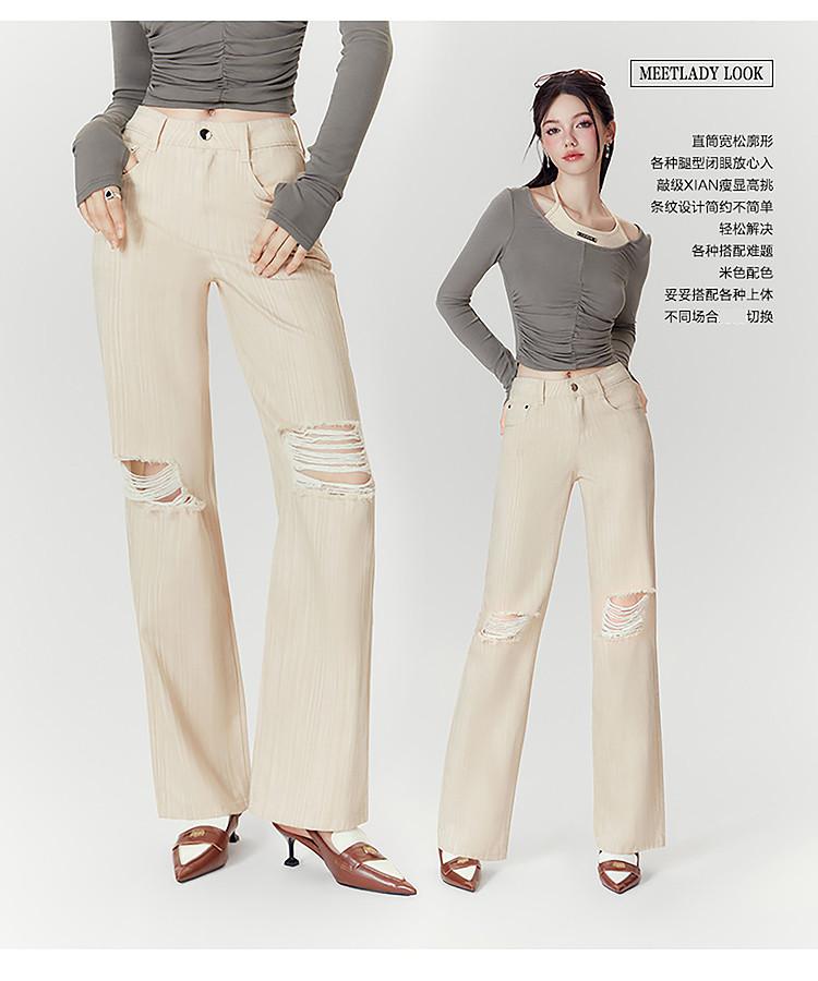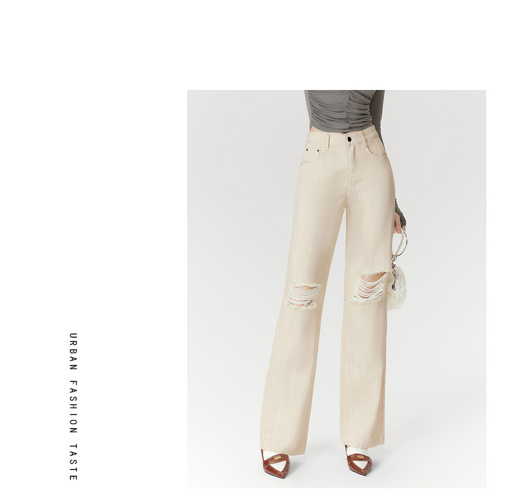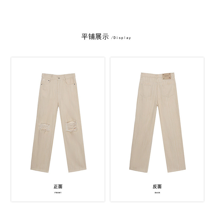 商品名称:春秋高腰显瘦条纹破洞卡其色牛仔裤女百搭直筒裤 869140