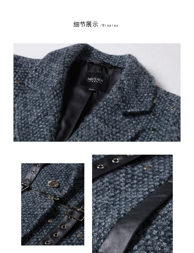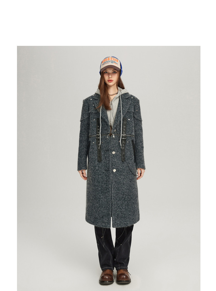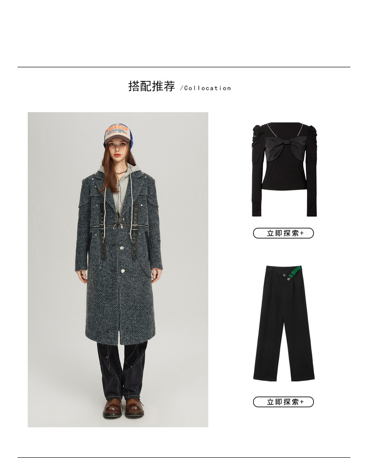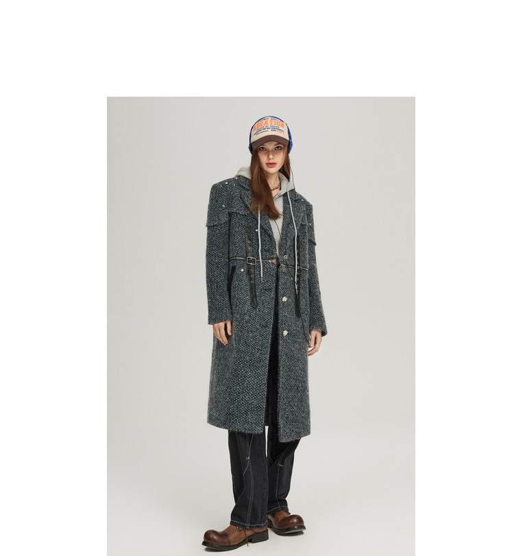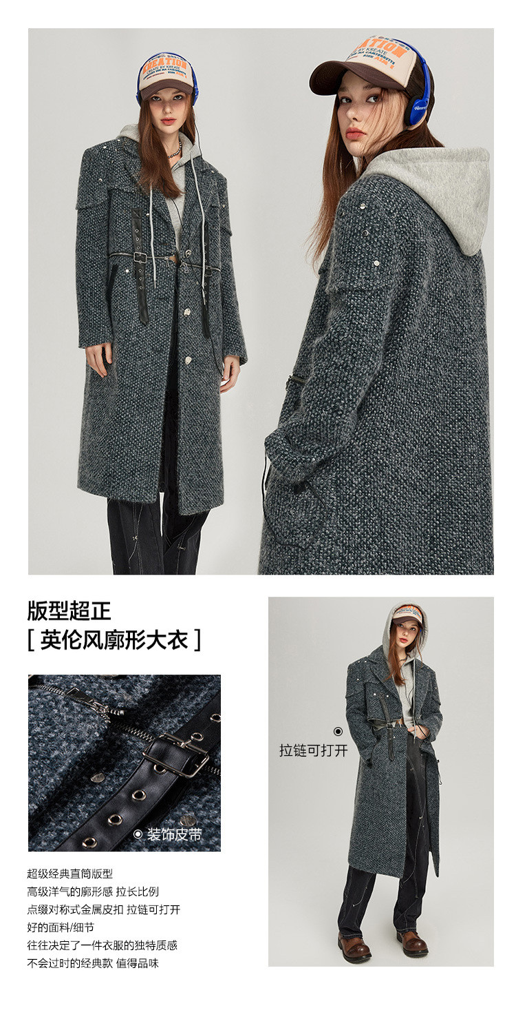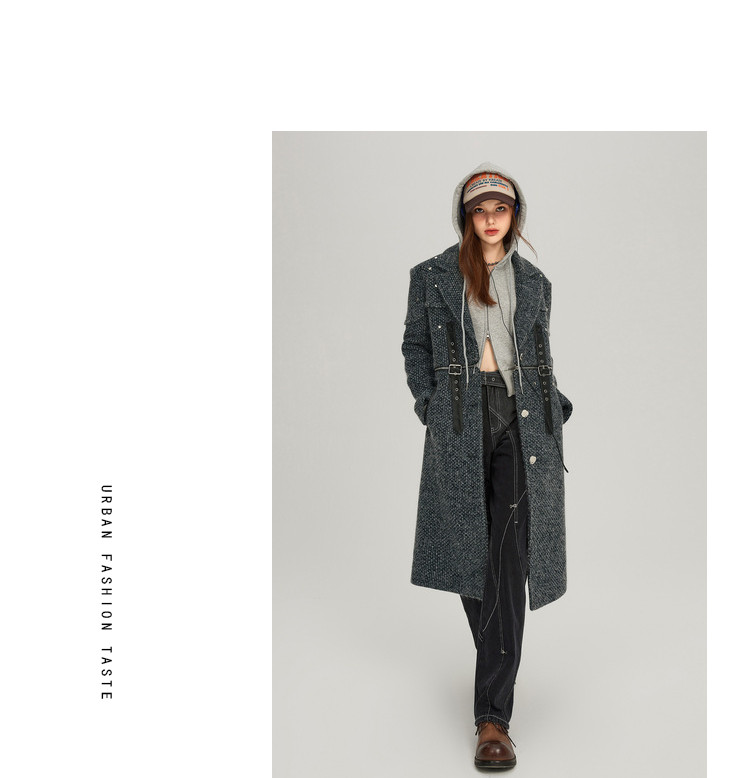 商品名称:冬季皮扣长款毛呢大衣女轻奢潮流质感外套 206356