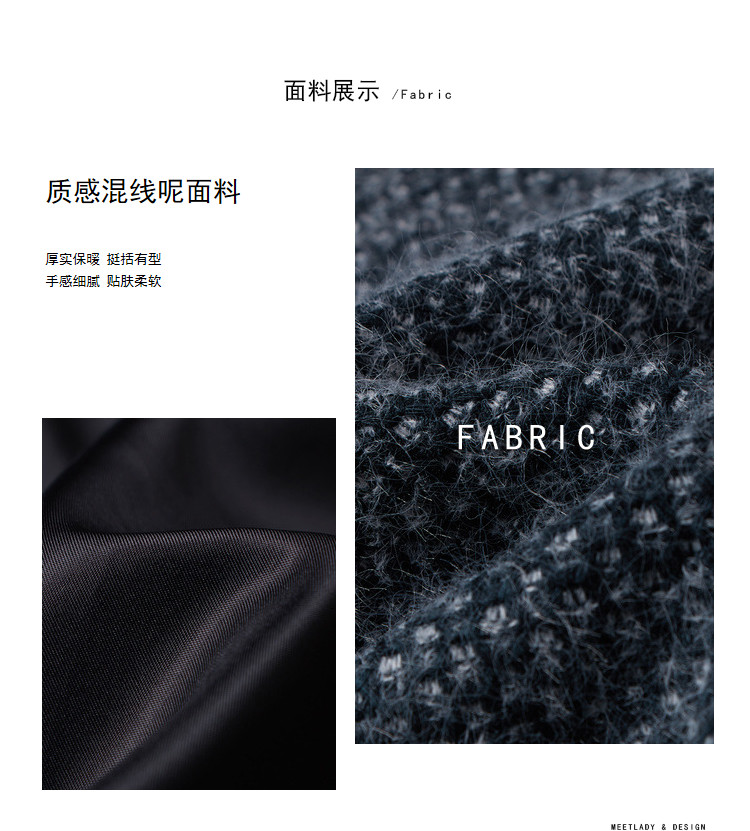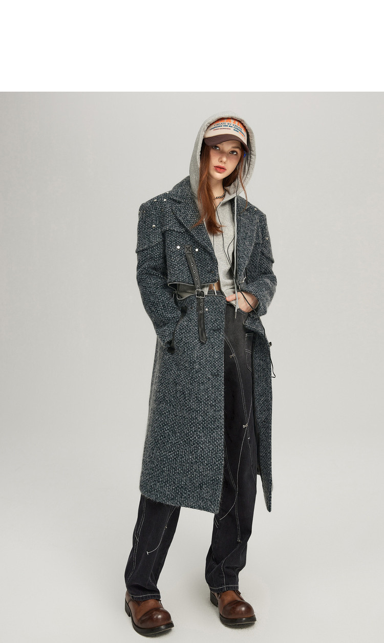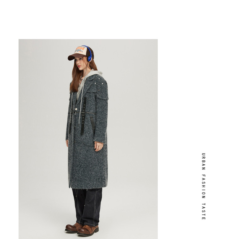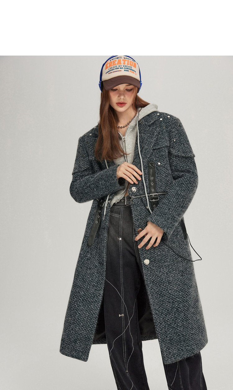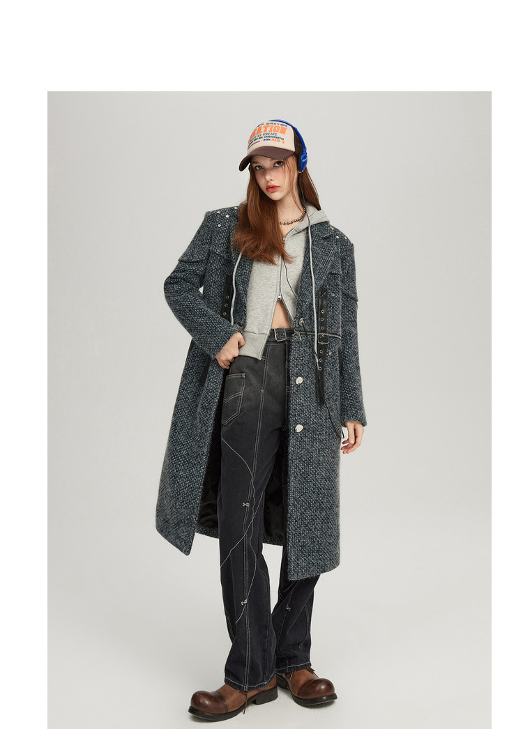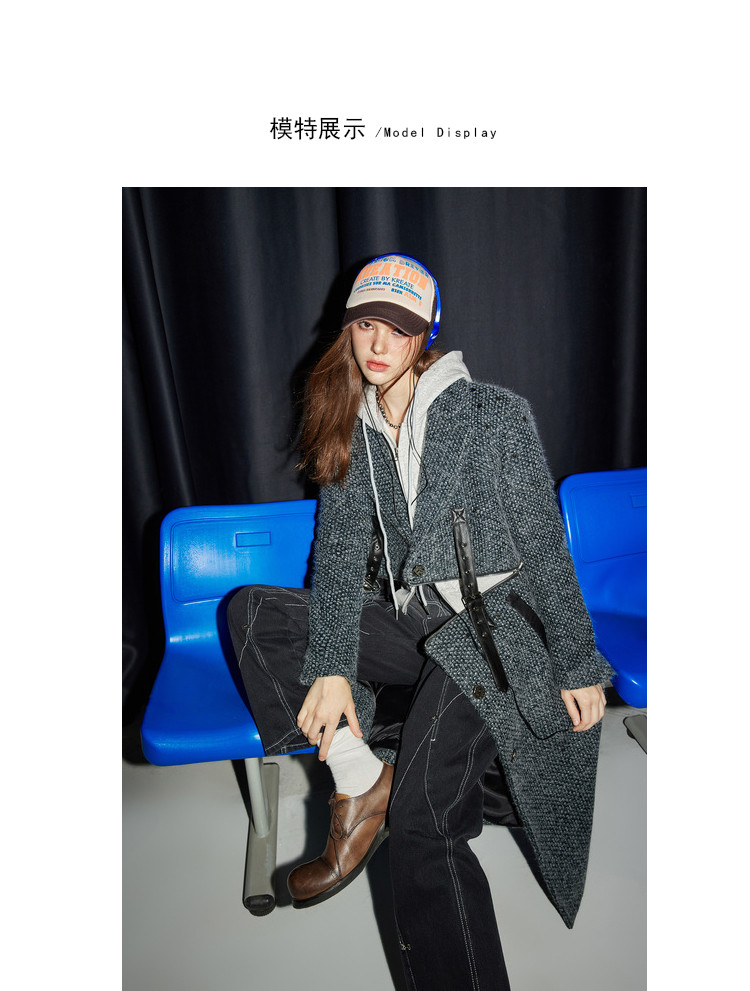 商品名称:冬季皮扣长款毛呢大衣女轻奢潮流质感外套 206356