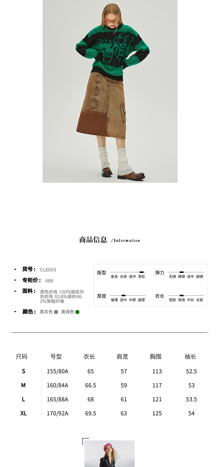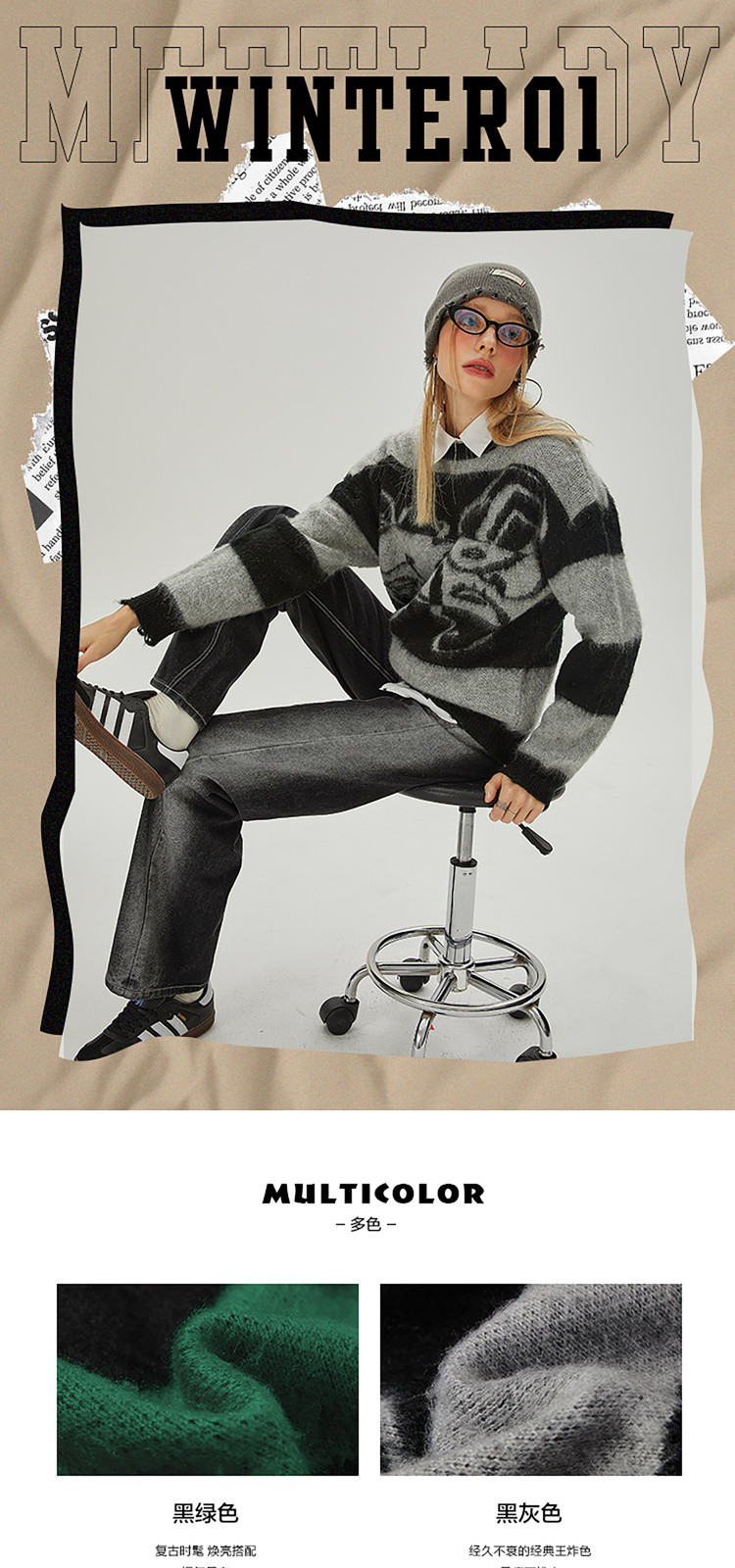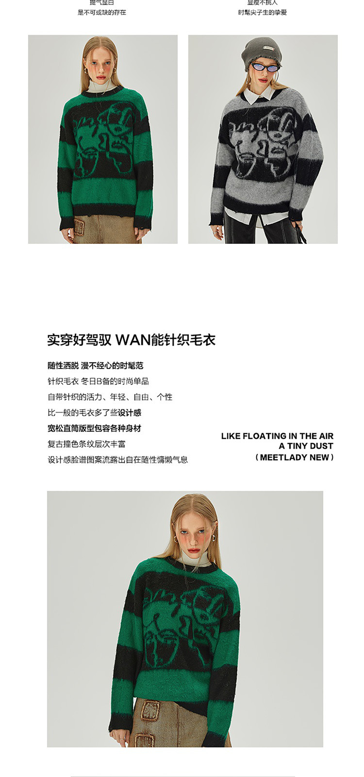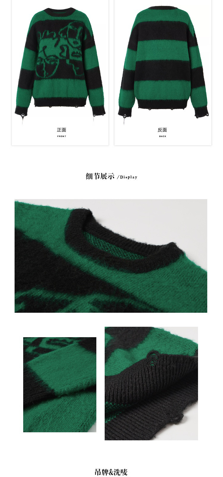 商品名称:【圆领破洞】冬撞色条纹慵懒复古毛衣设计感小众图案上衣 671828