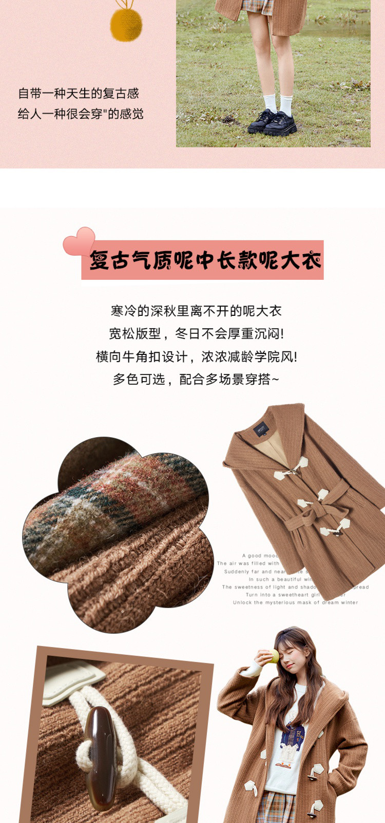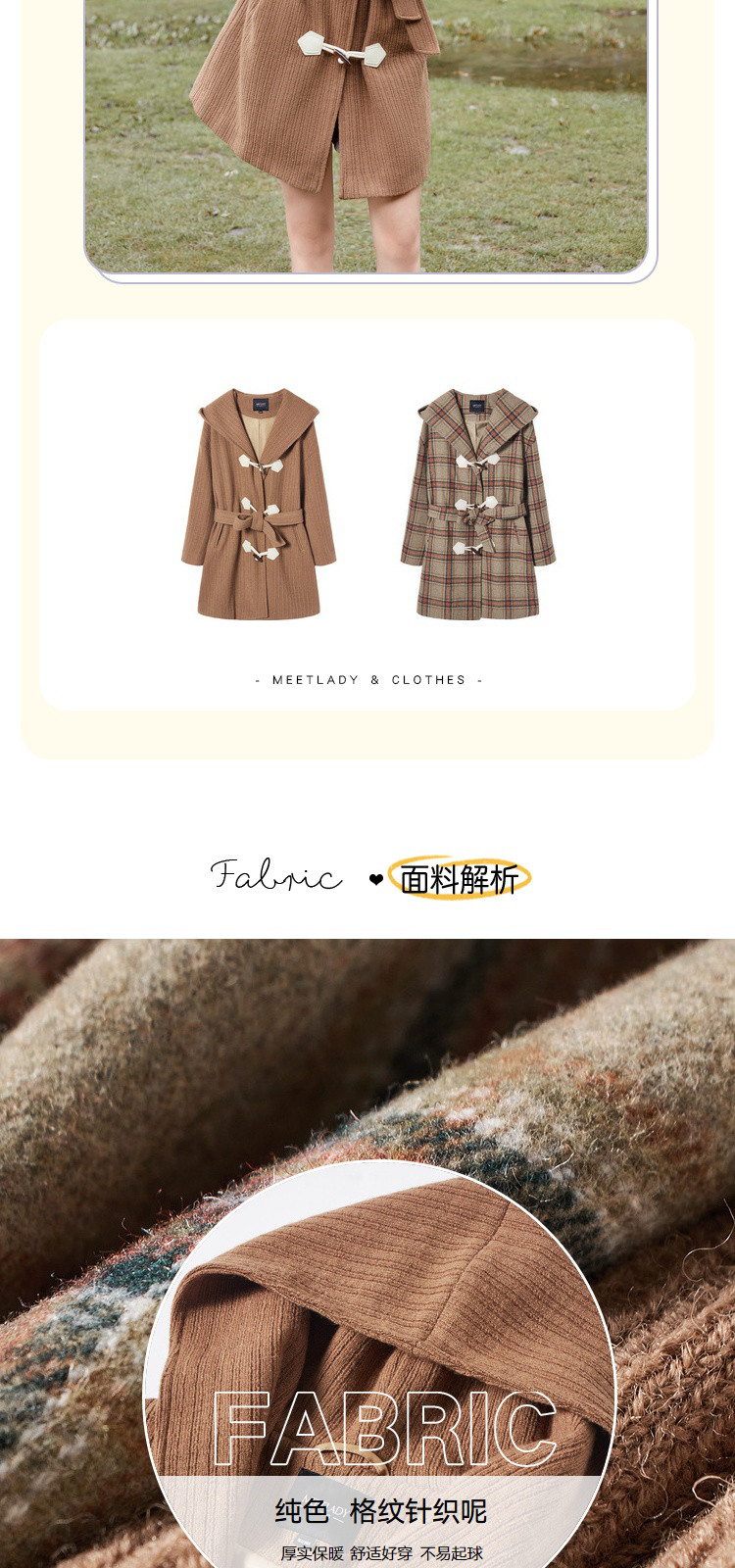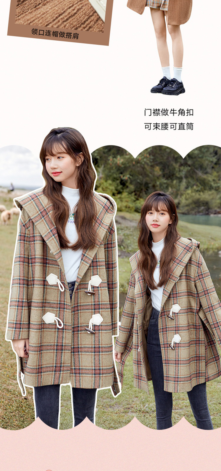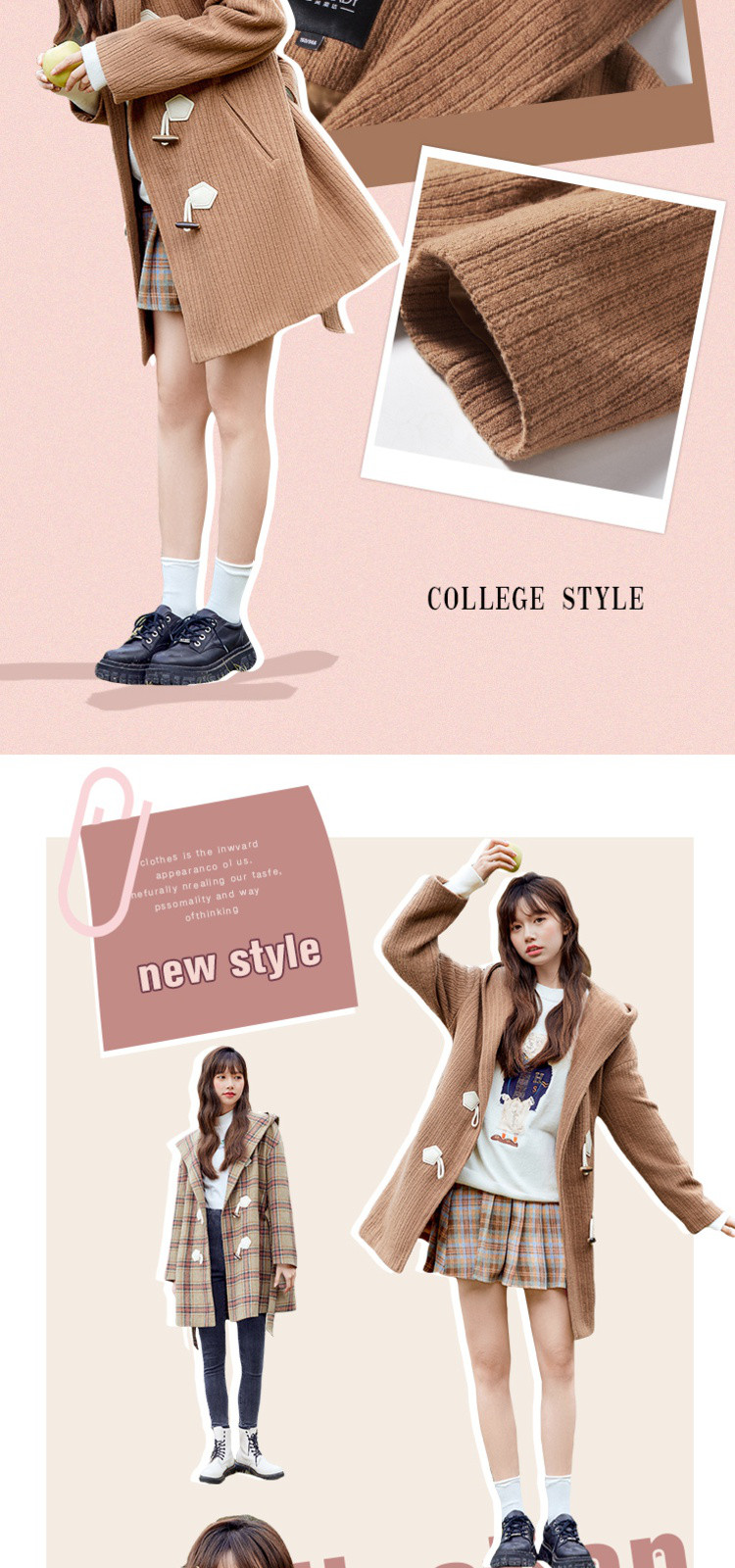 商品名称:冬法式复古收腰连帽牛角扣呢大衣女中长款毛呢外套 822356