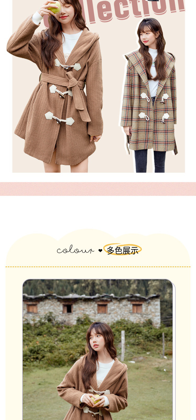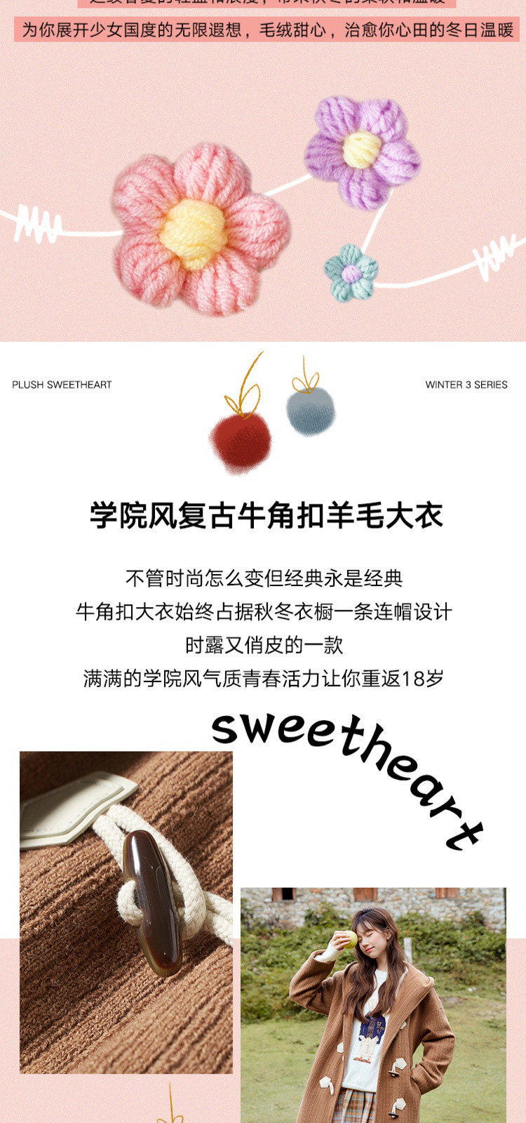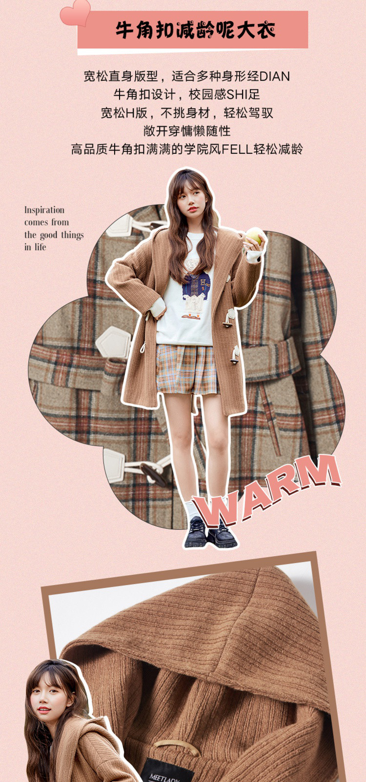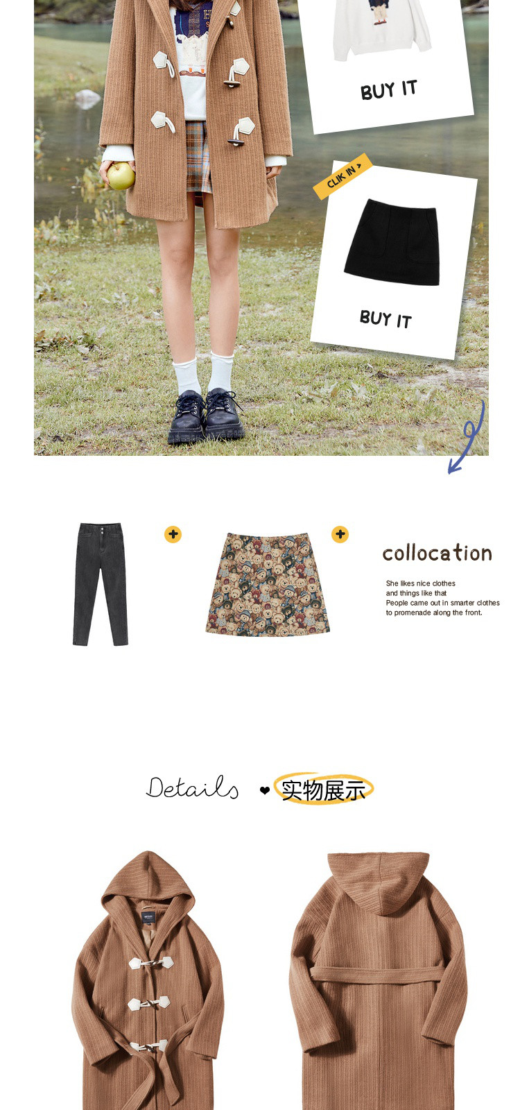 商品名称:冬法式复古收腰连帽牛角扣呢大衣女中长款毛呢外套 822356