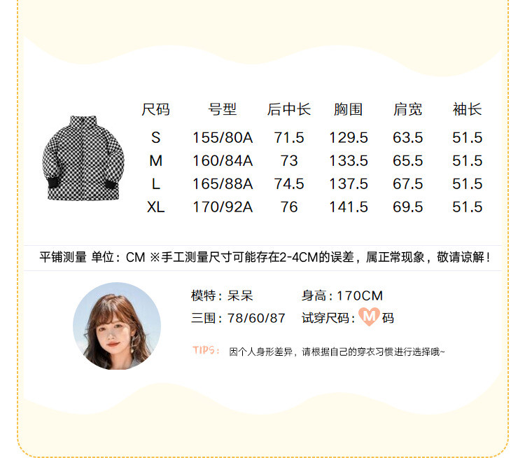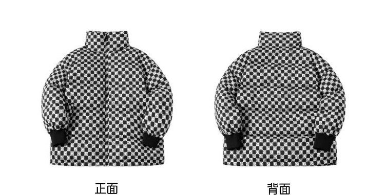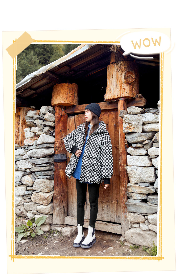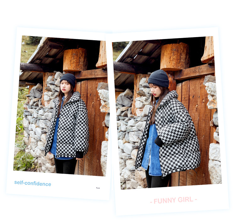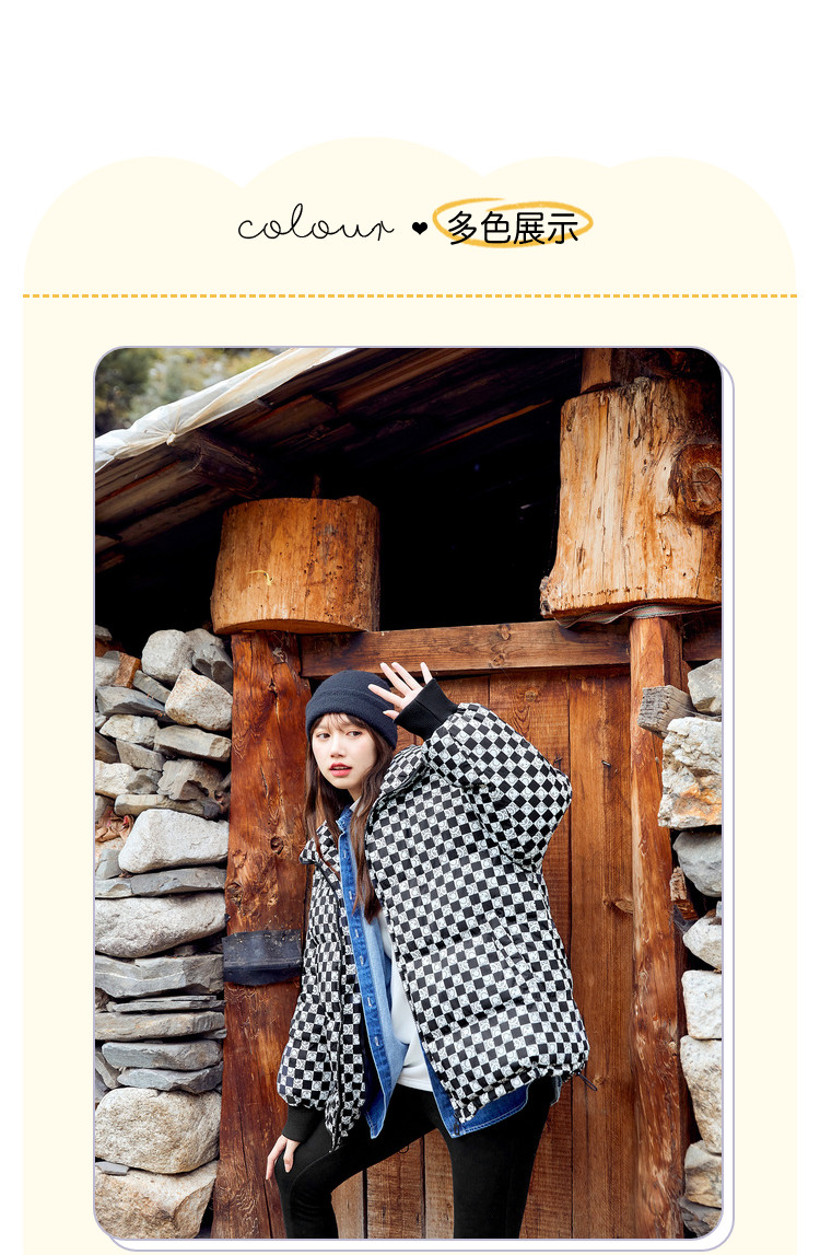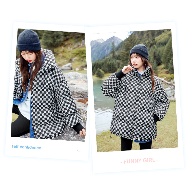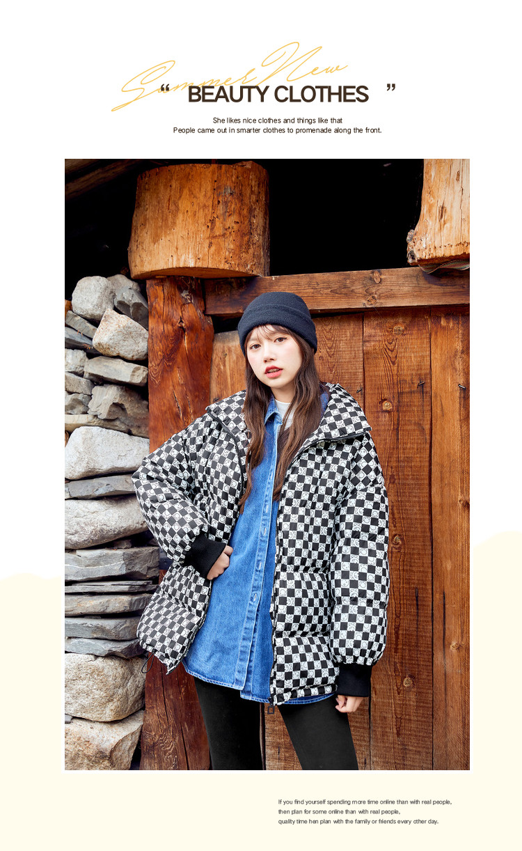 商品名称:冬季热卖格纹羽绒服女时尚宽松白鸭绒长袖加绒保暖外套潮流款 068884