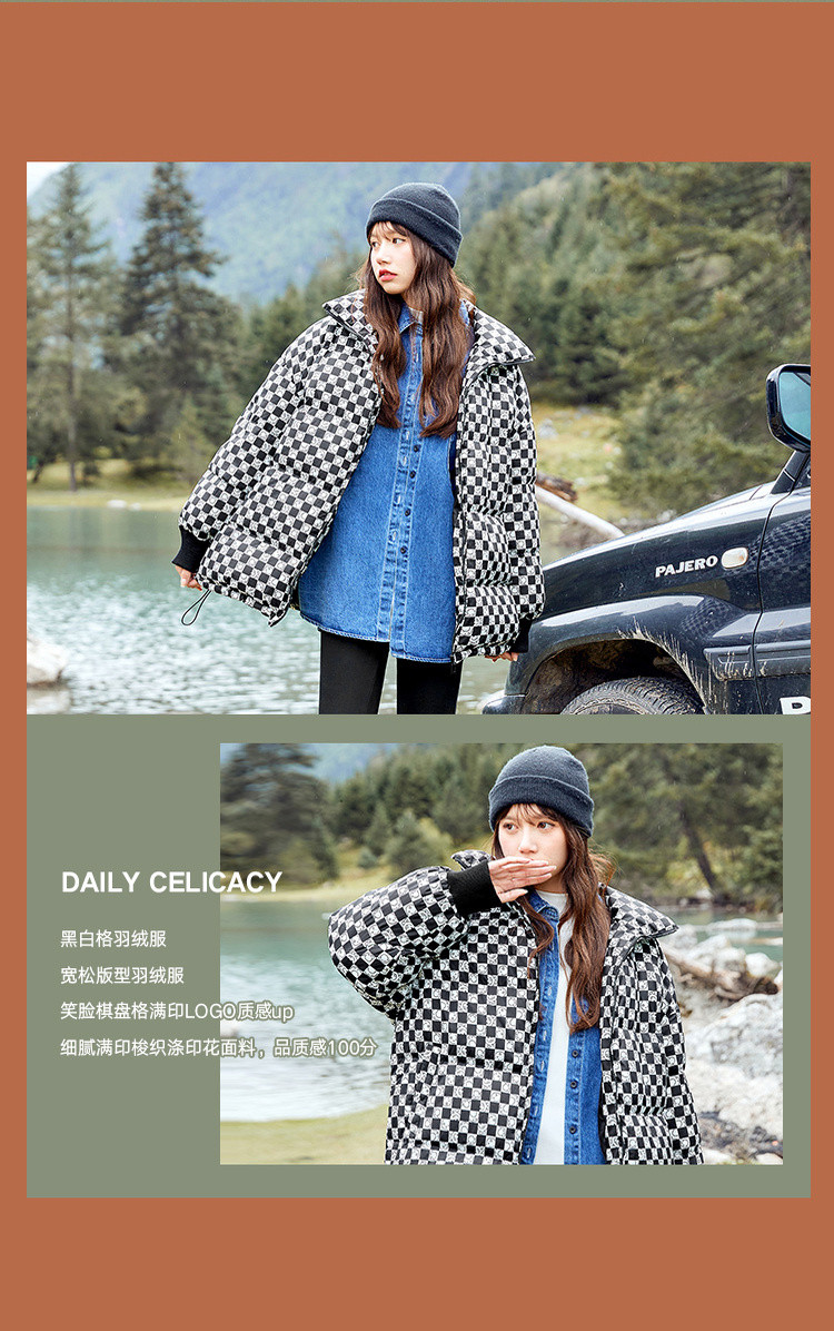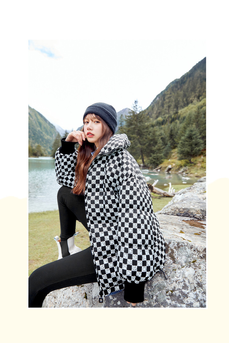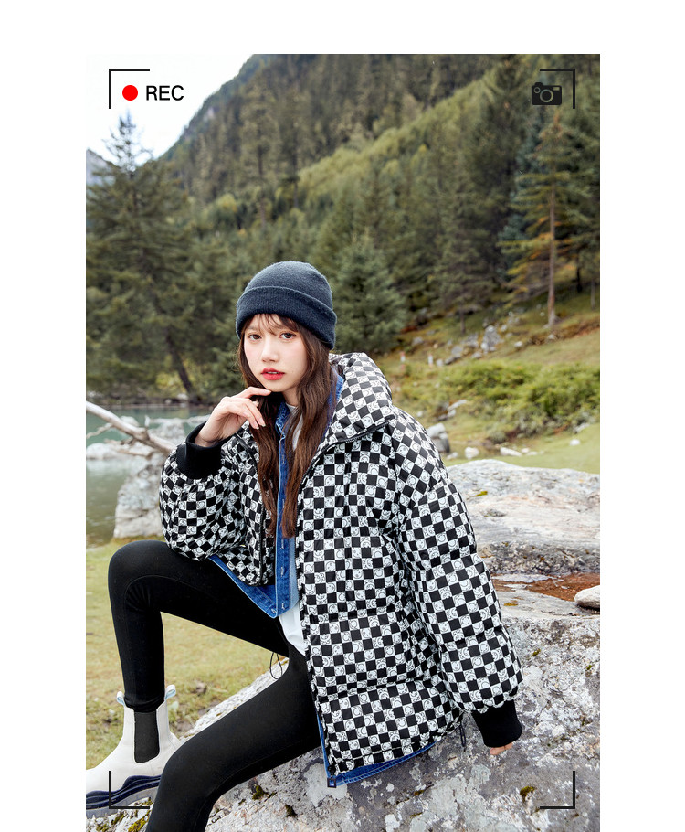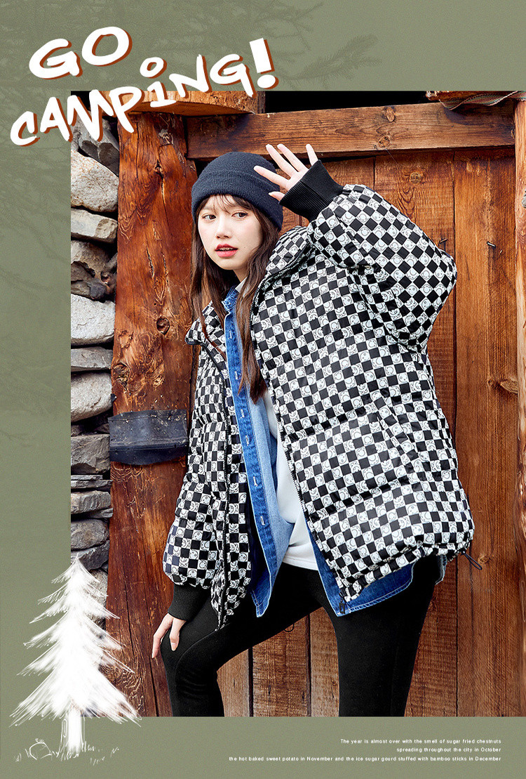 冬季热卖格纹羽绒服女时尚宽松白鸭绒长袖加绒保暖外套潮流款 068884