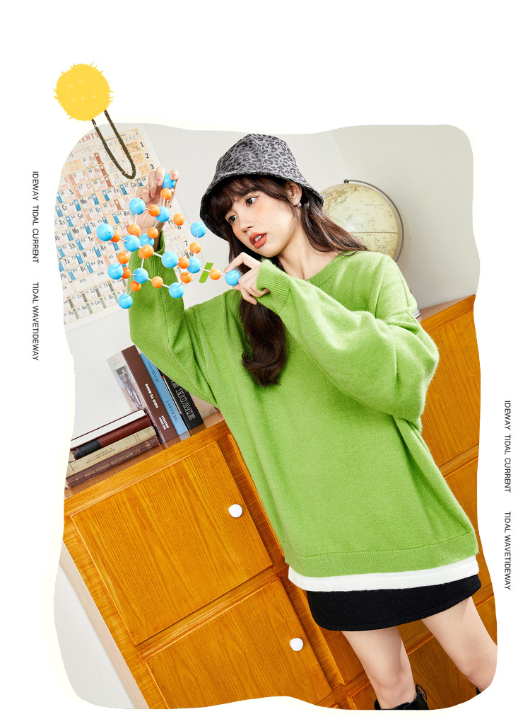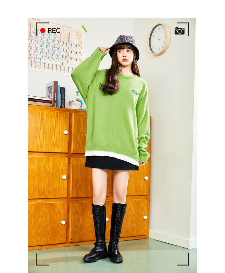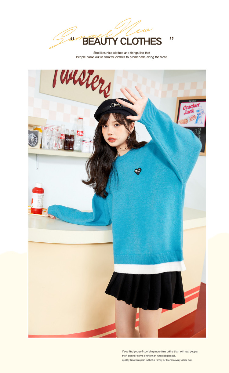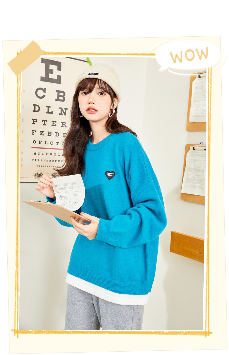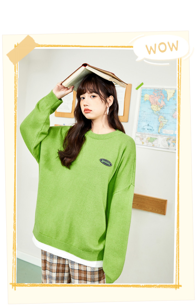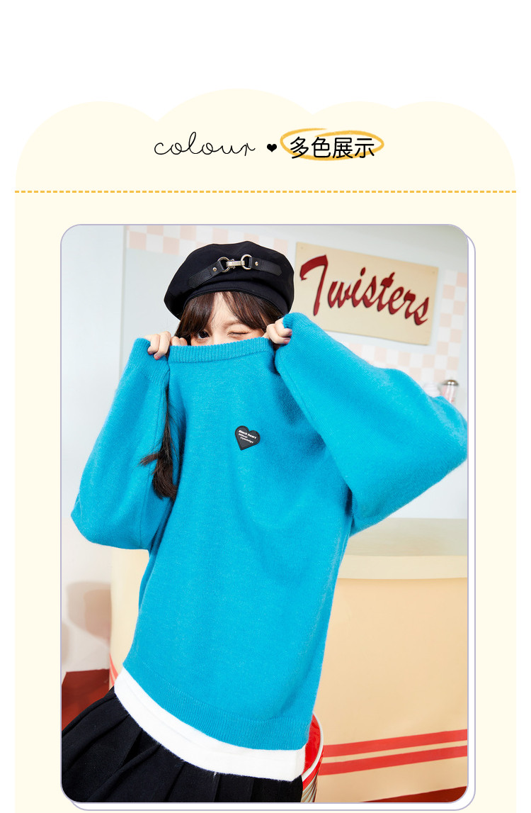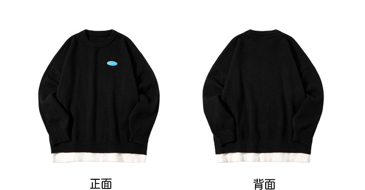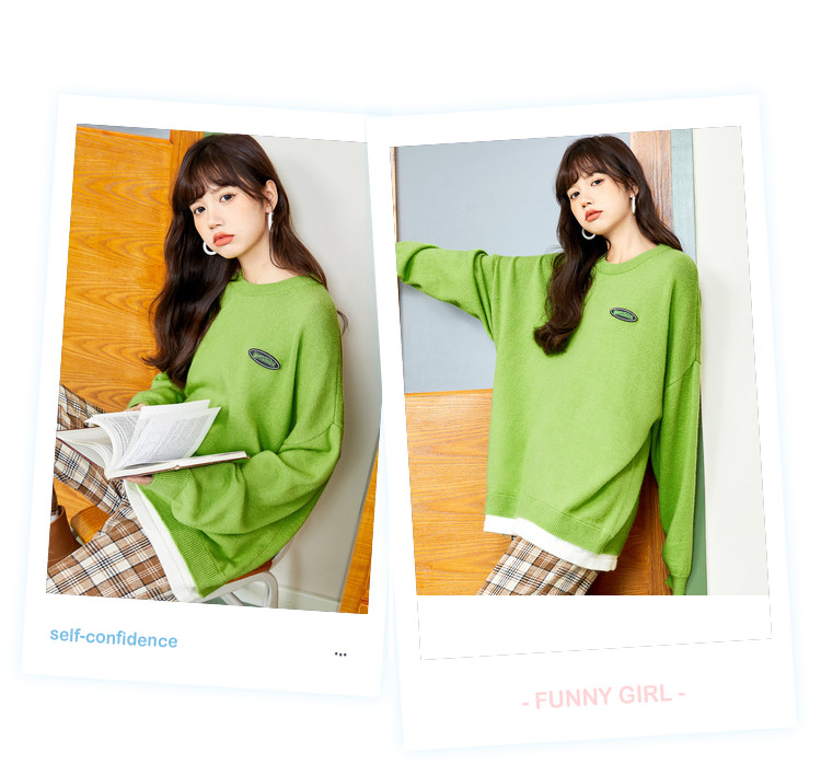 冬圆领套头毛衣女假两件拼接宽松长袖保暖针织衫 840404