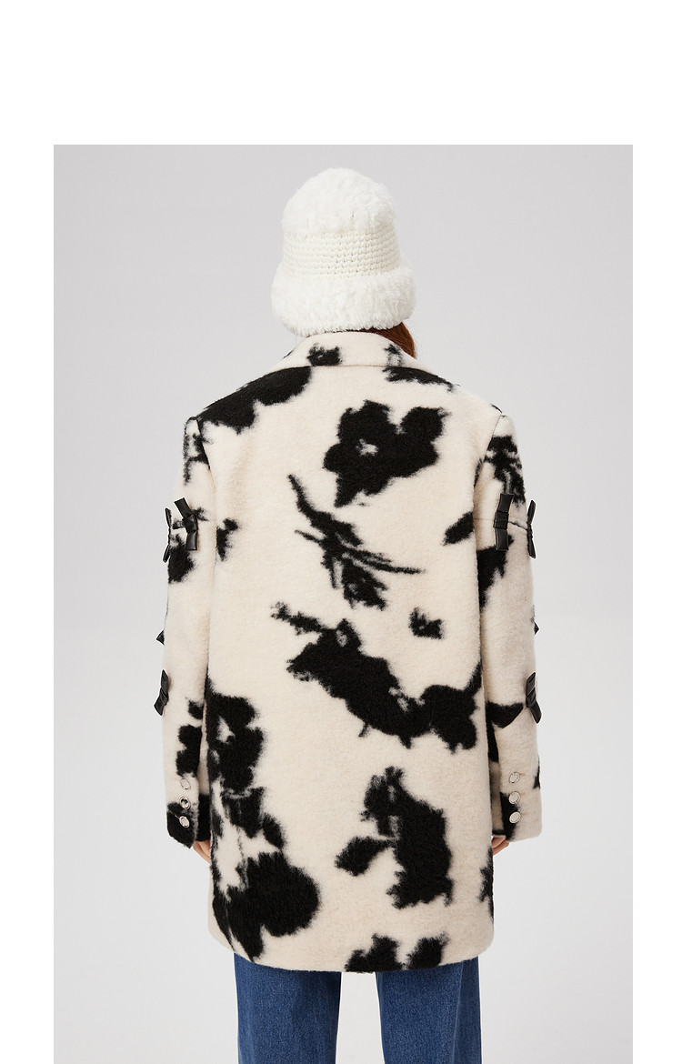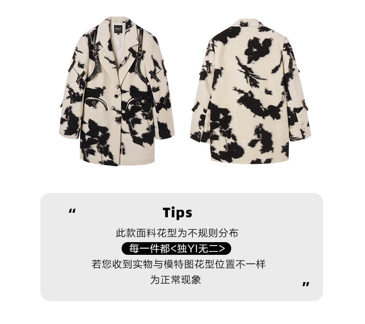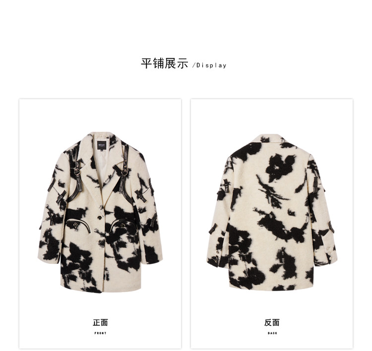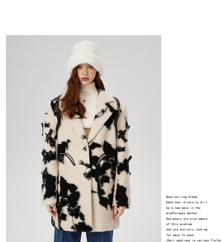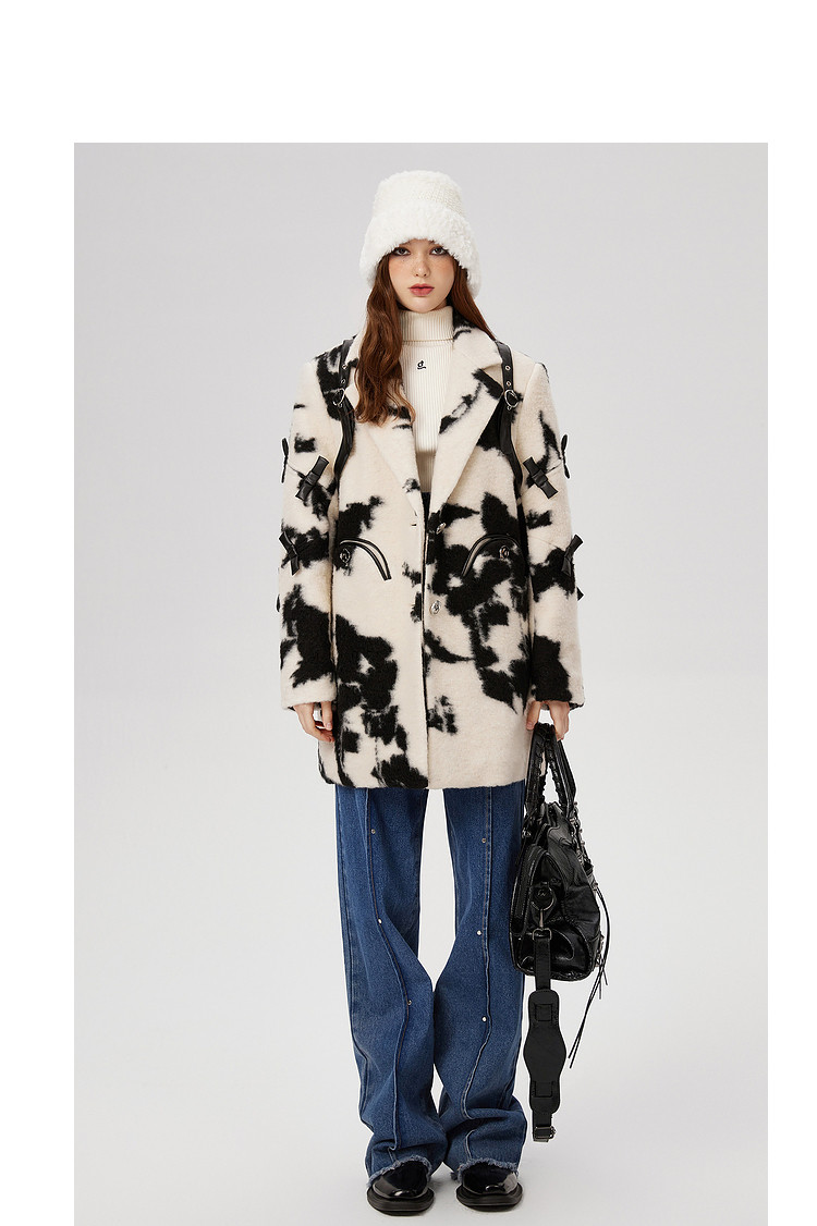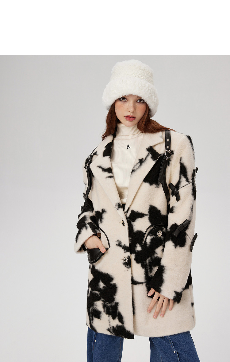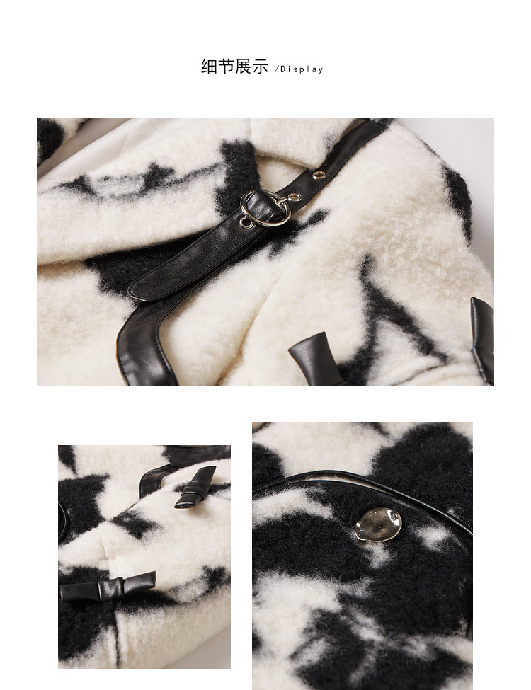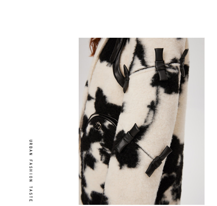 商品名称:冬季黑白花纹蝴蝶结毛呢大衣女设计感小众保暖外套 520596