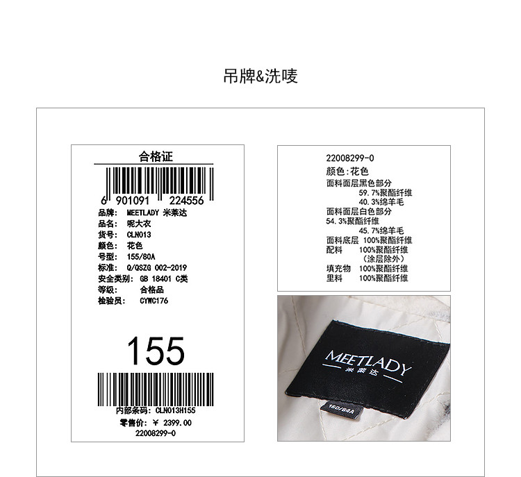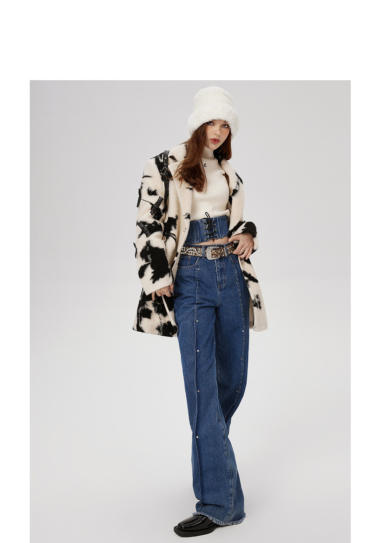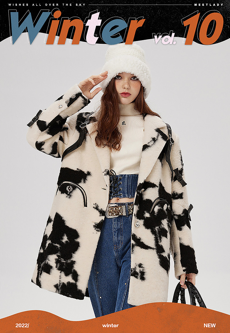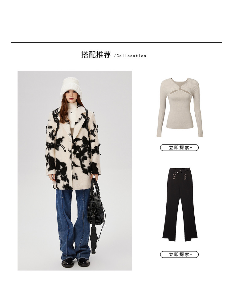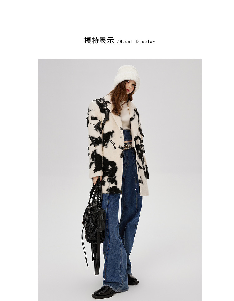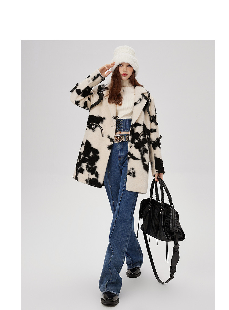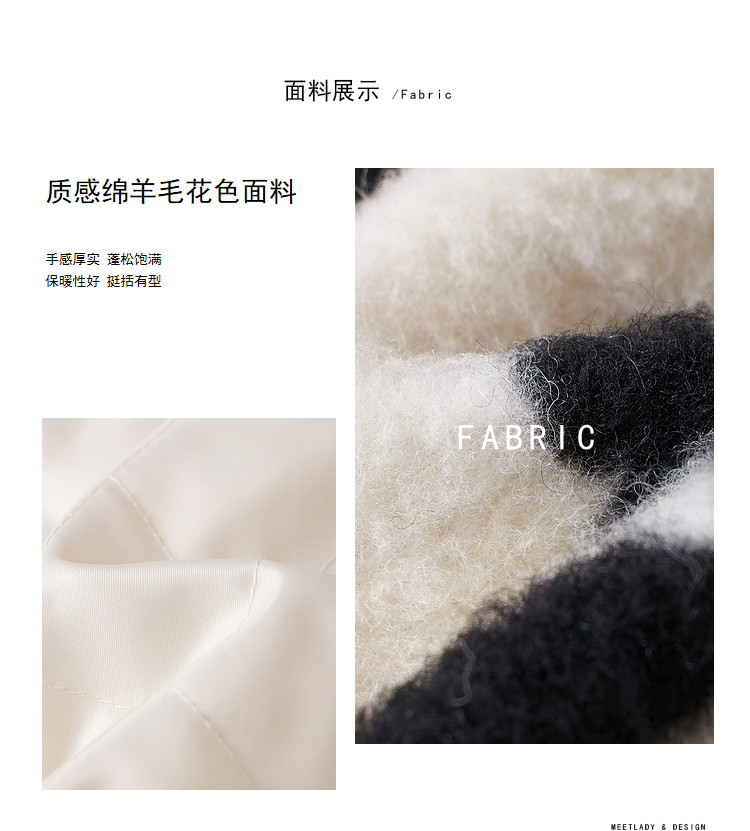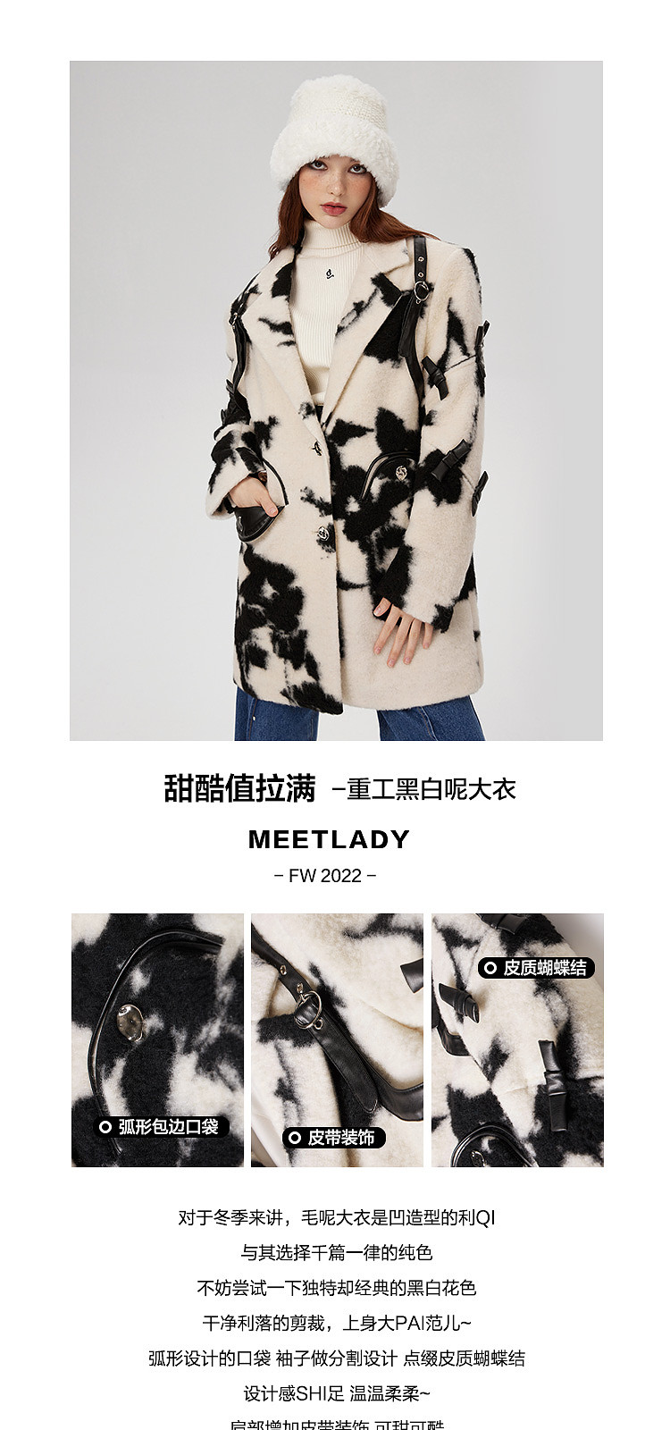 商品名称:冬季黑白花纹蝴蝶结毛呢大衣女设计感小众保暖外套 520596