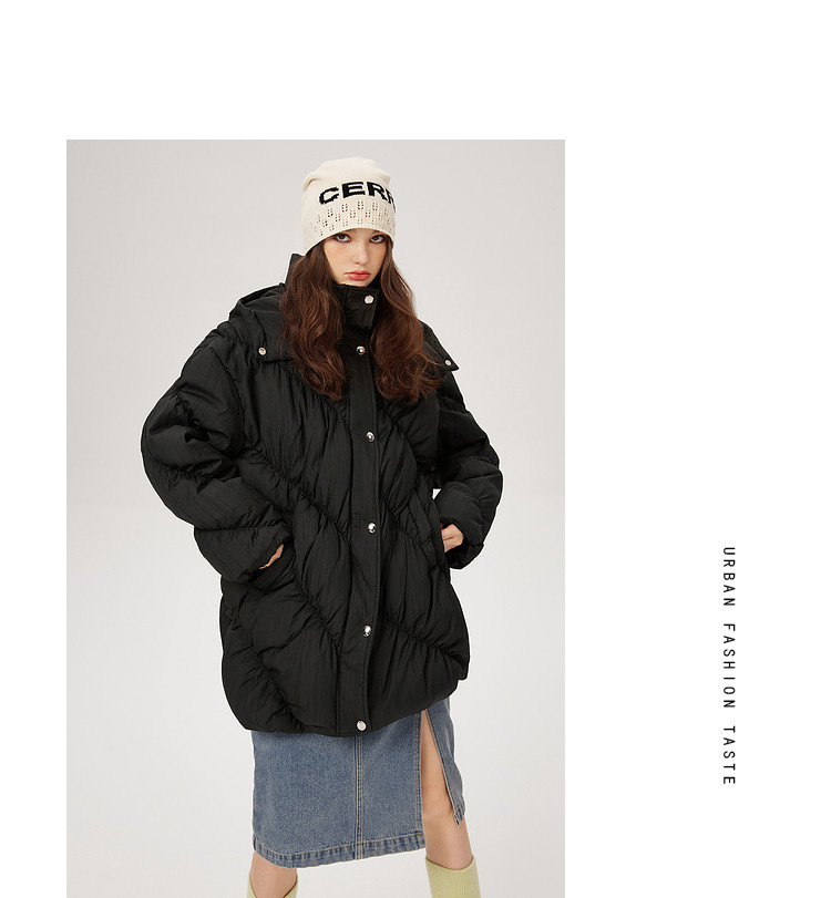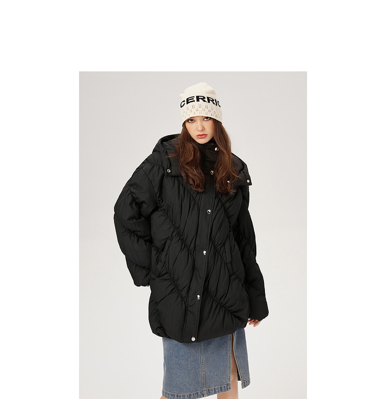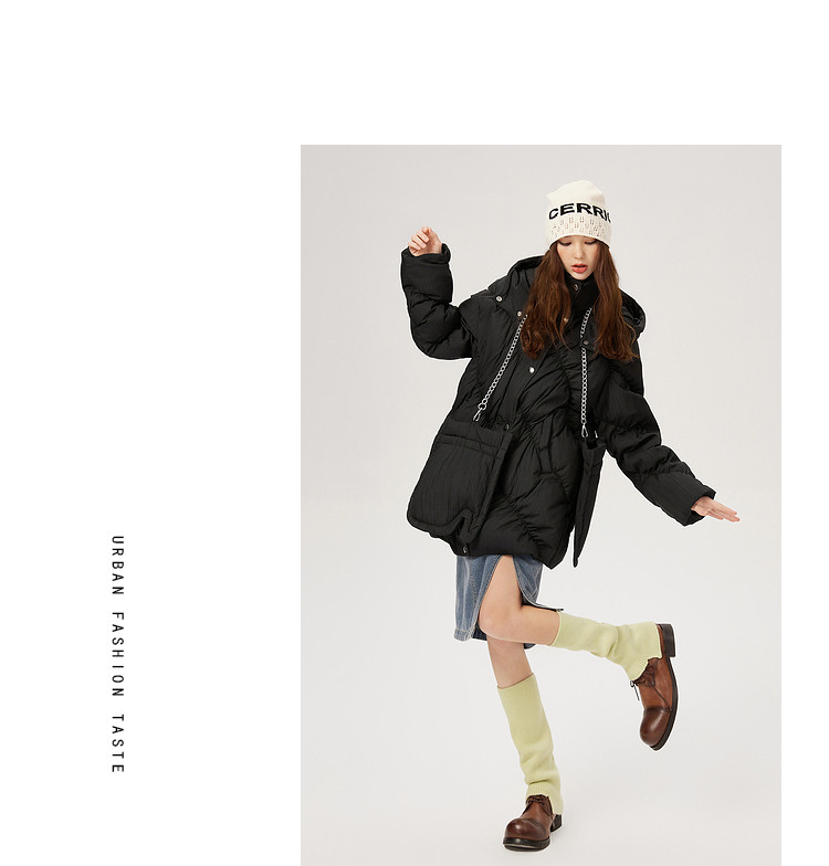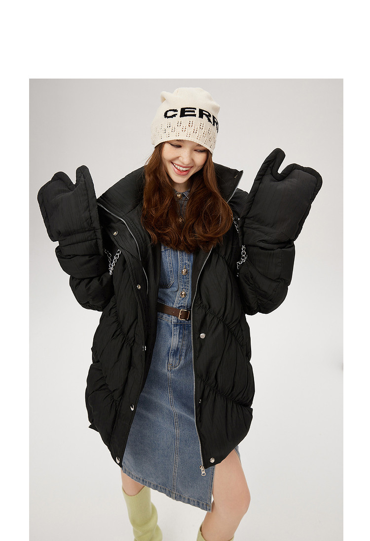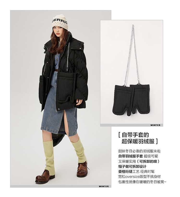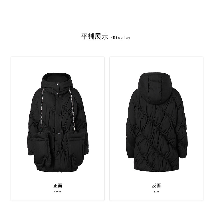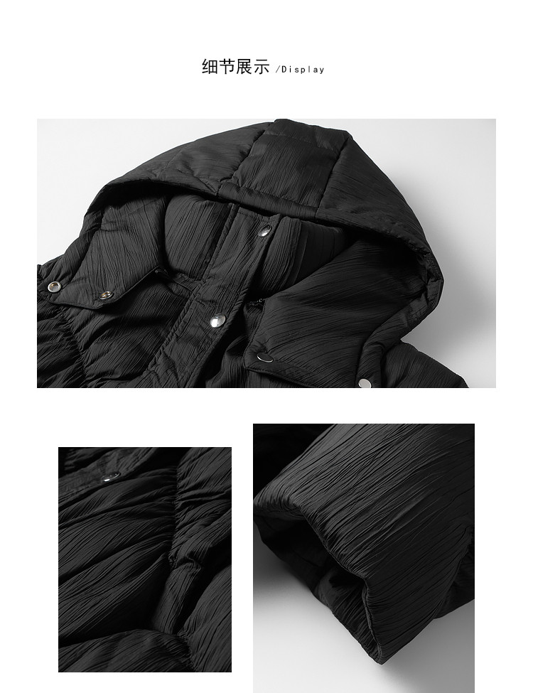 商品名称:【内送手套】冬季热卖菱格连帽轻薄加厚保暖羽绒服女冬季中长外套 525524