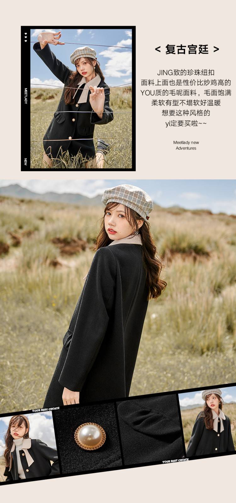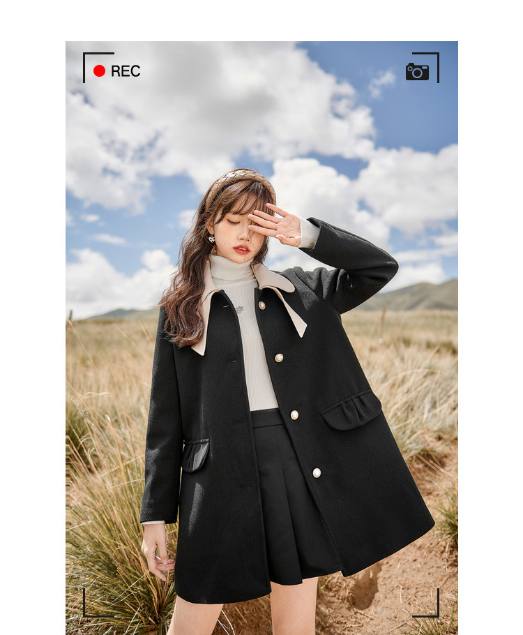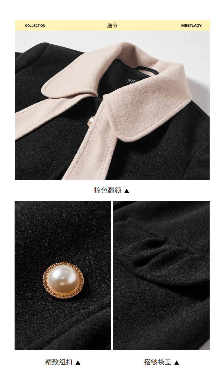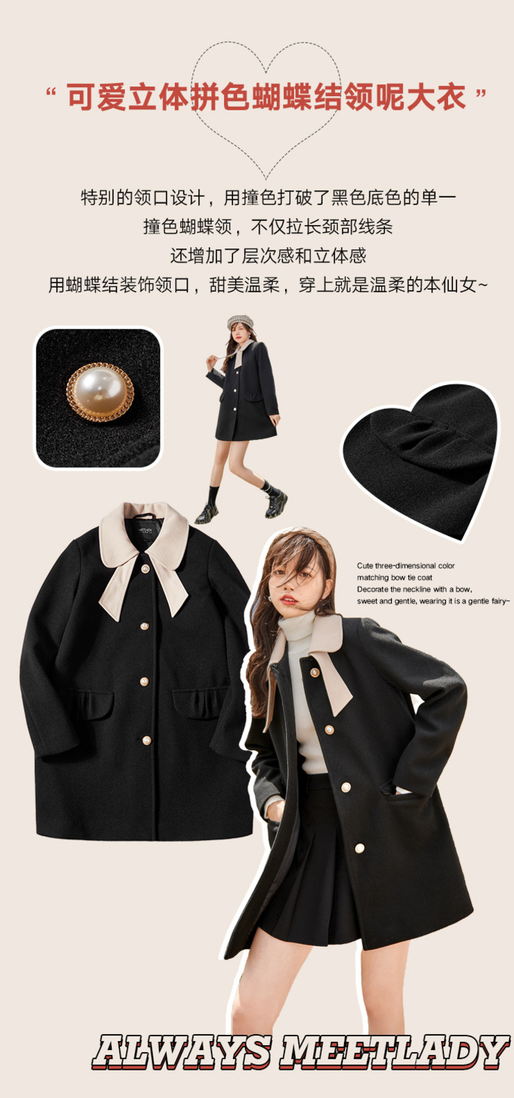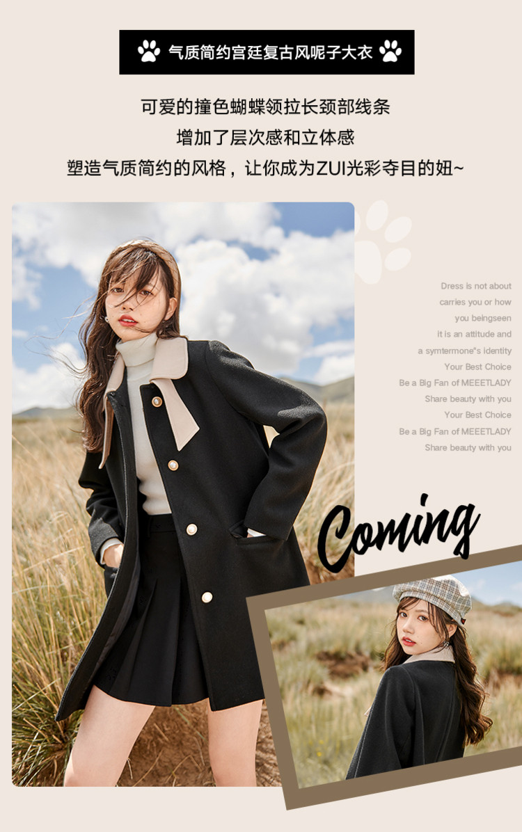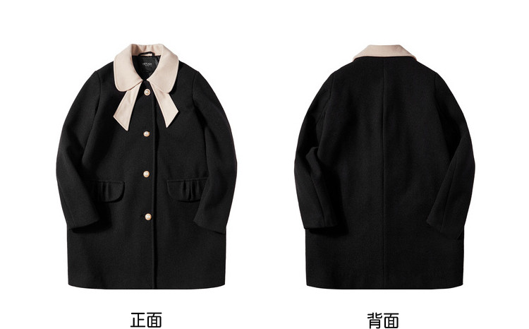 商品名称:冬装撞色蝴蝶翻领呢大衣女简约加厚长袖中长款外套 487188