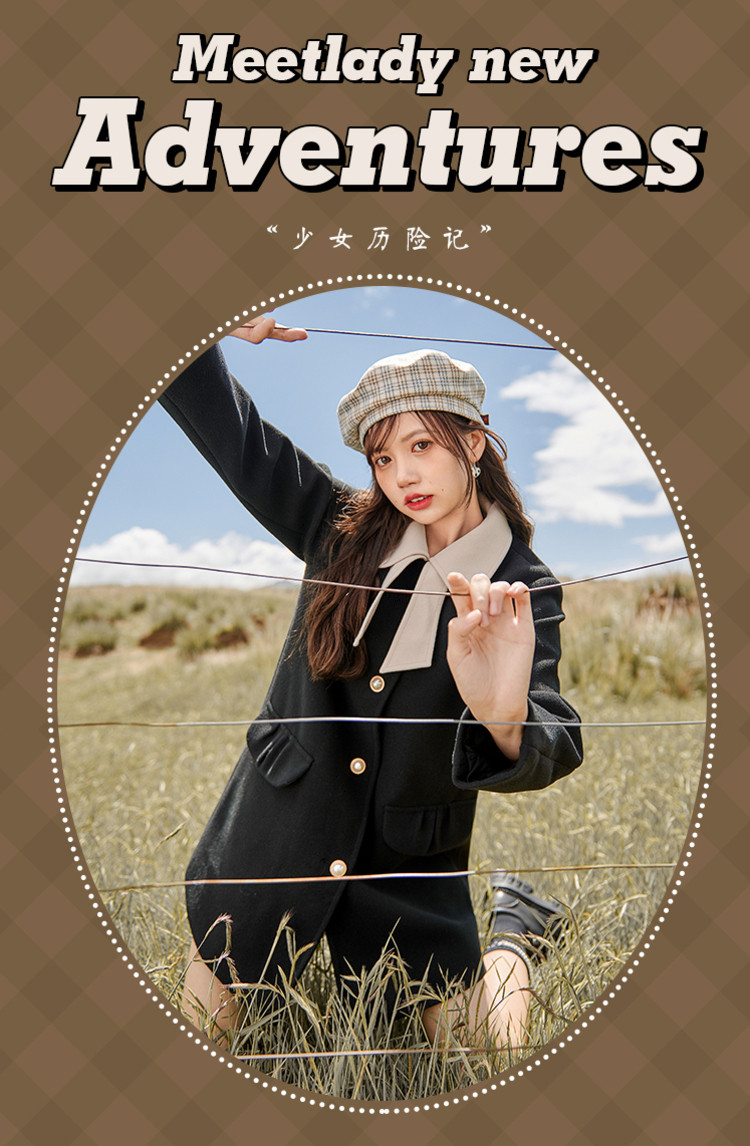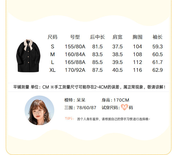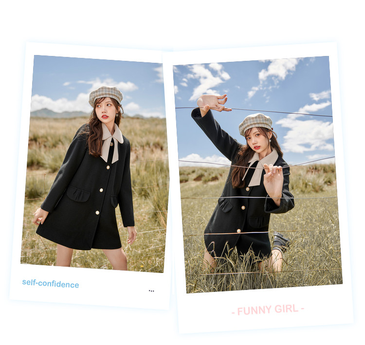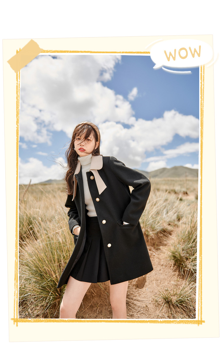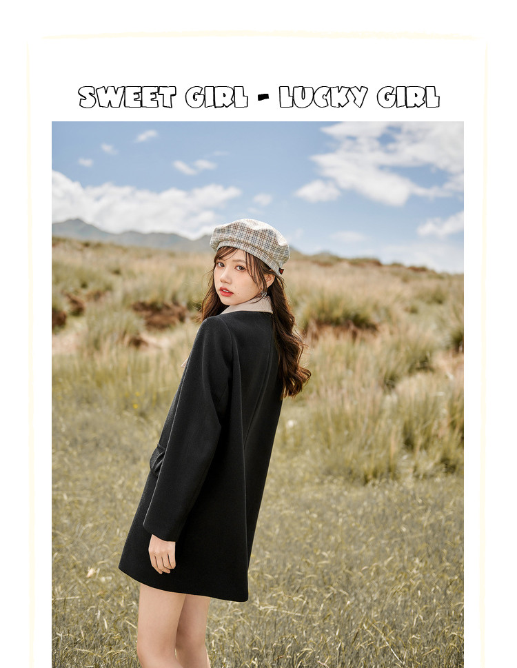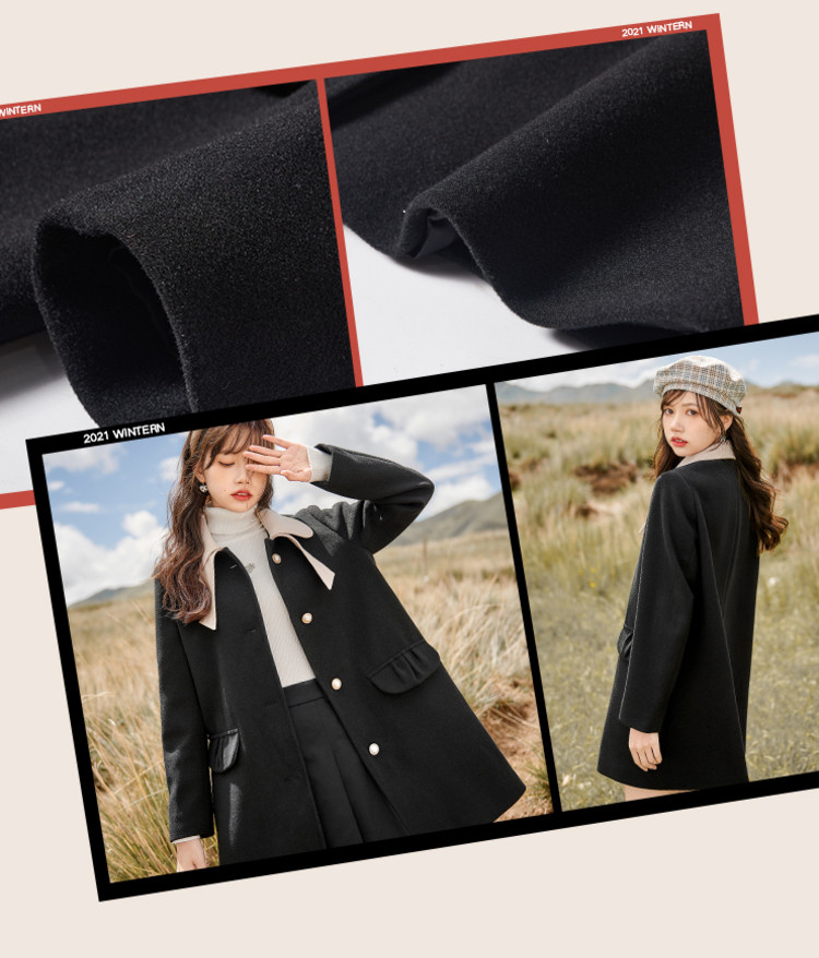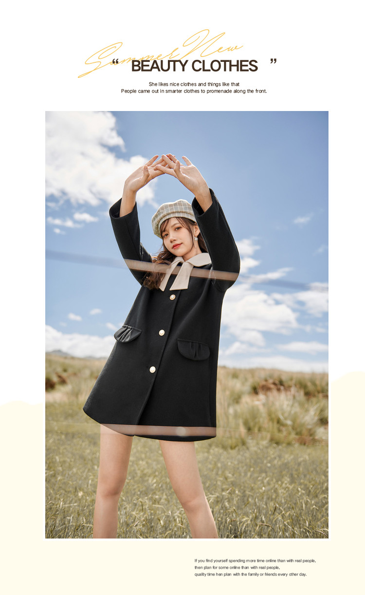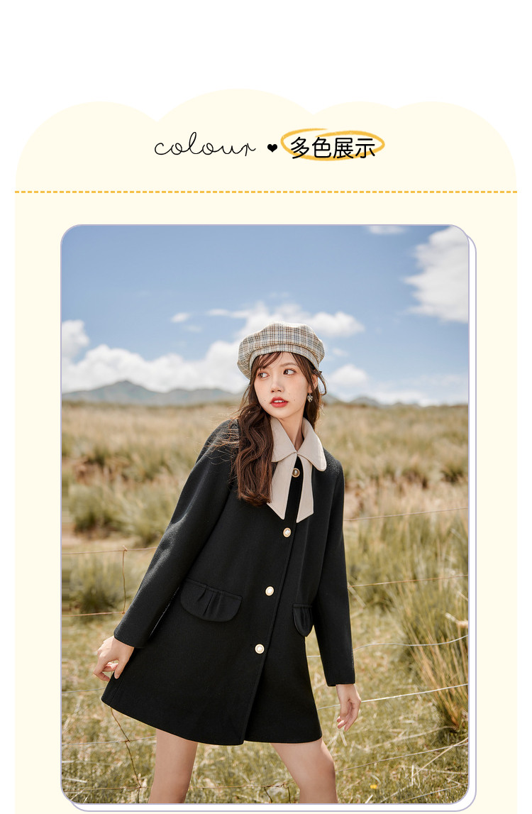商品名称:冬装撞色蝴蝶翻领呢大衣女简约加厚长袖中长款外套 487188