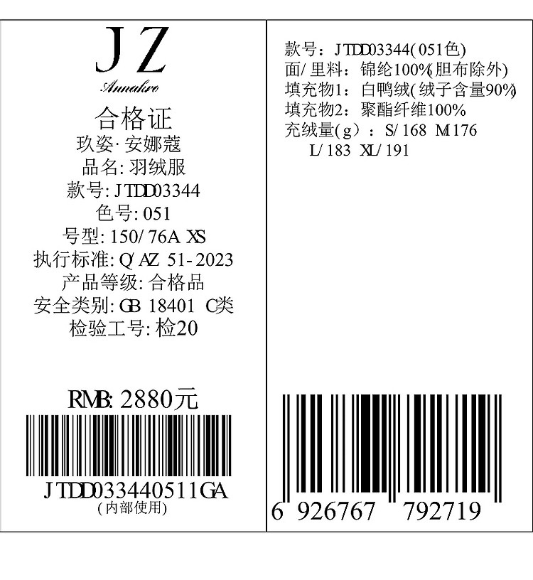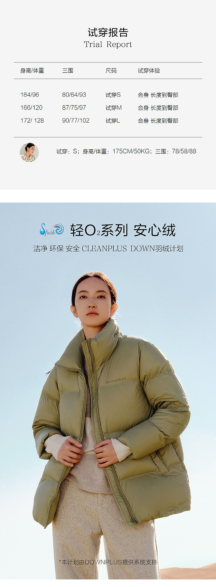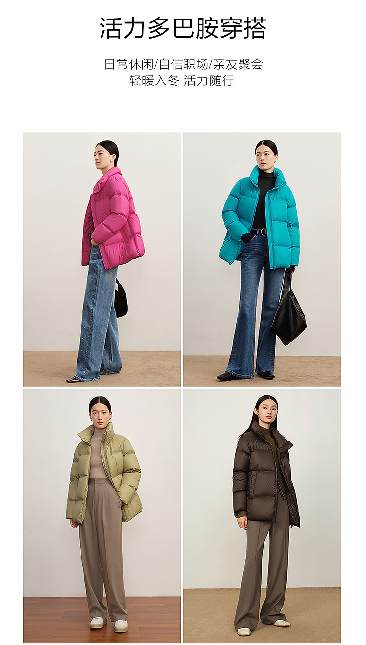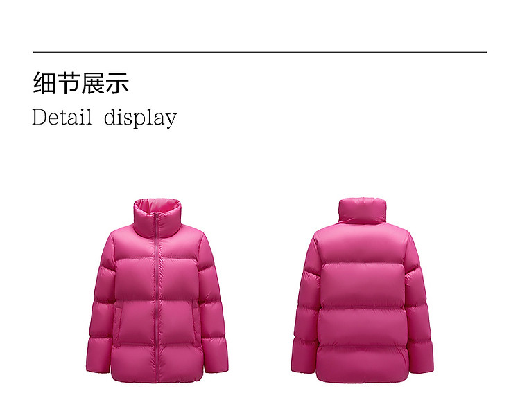 商品名称:玖姿旗下安娜蔻系列通勤休闲立领直筒一手长白鸭绒羽绒女冬季 653388