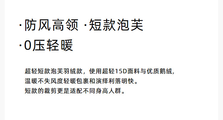 商品名称:【冬季轻薄鹅绒】小个子女外套极简超轻泡芙短款羽绒服 317083