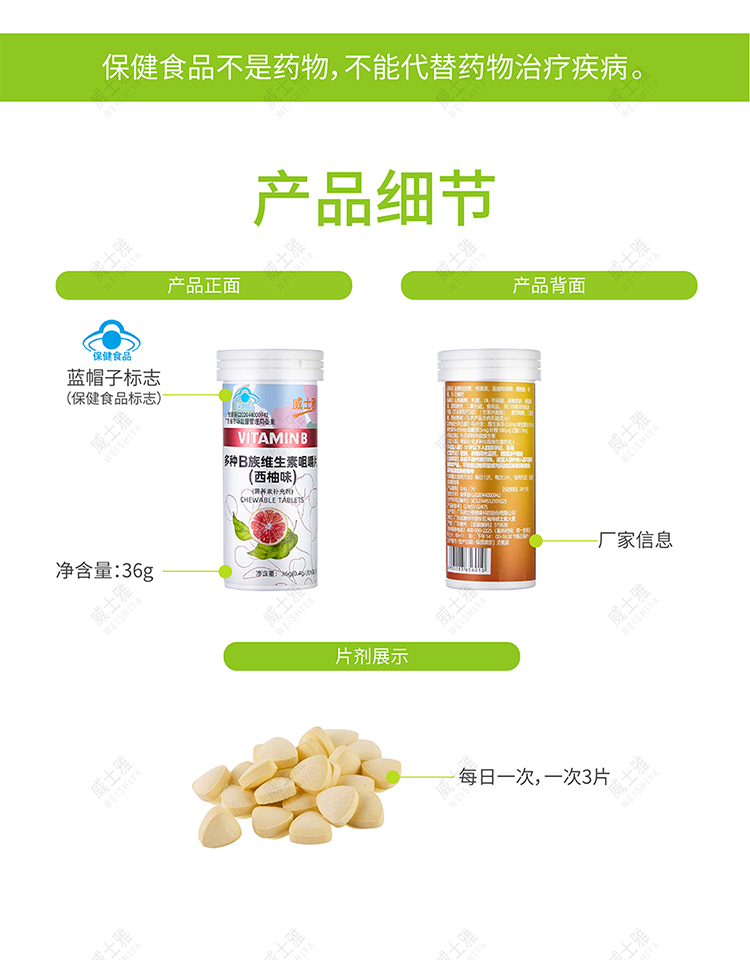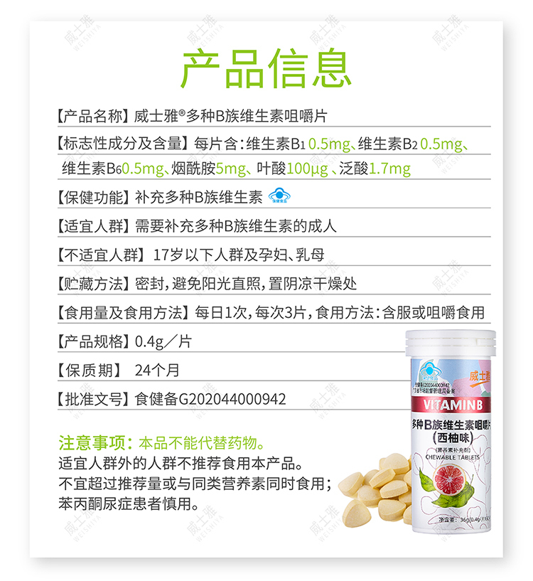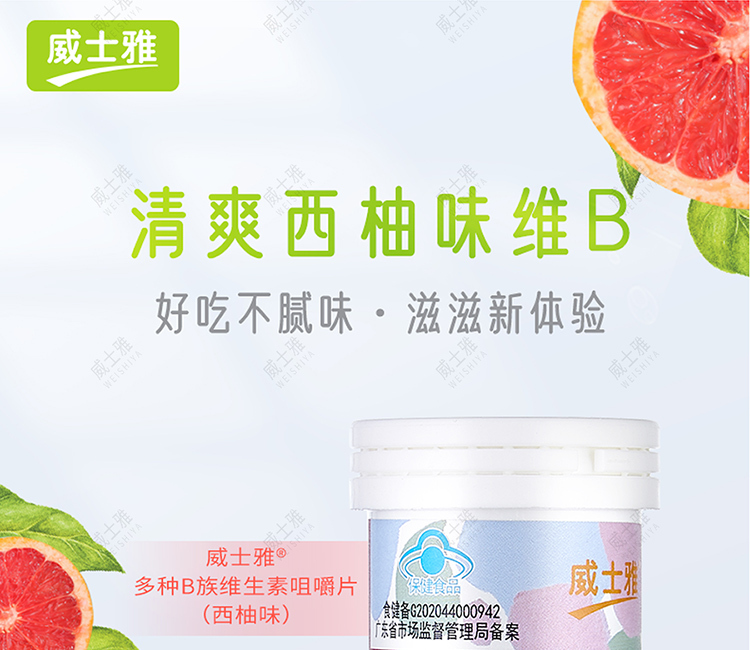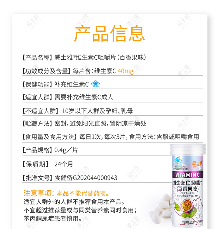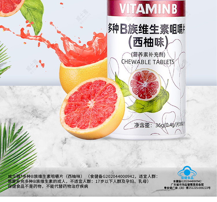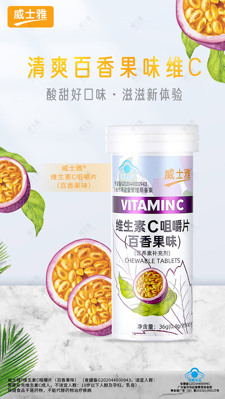 商品名称:威士雅维生素C咀嚼片百香果西柚组B族维生素咀嚼片90片/瓶 两瓶装