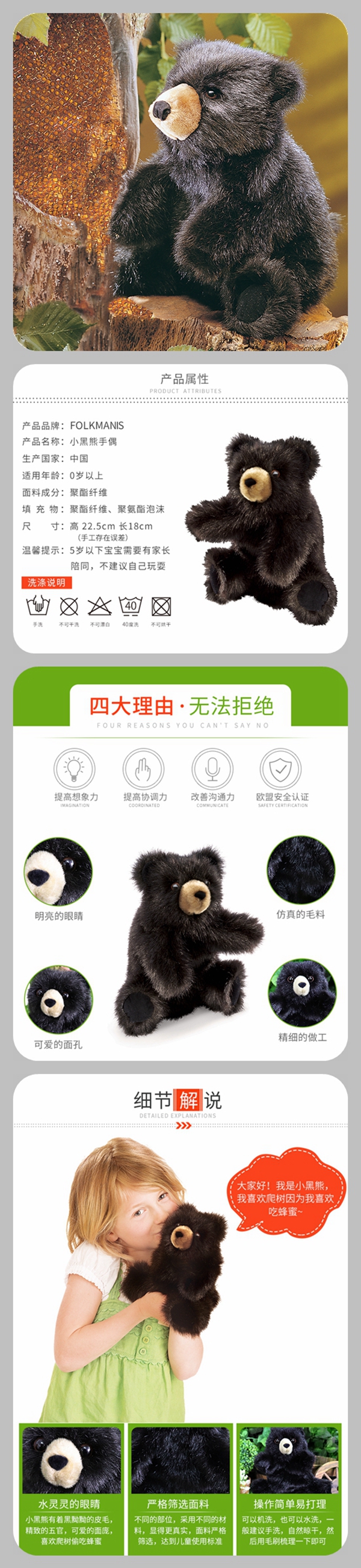 商品名称:福克曼尼斯/FOLKMANIS 仿真互动教育黑熊宝宝手偶