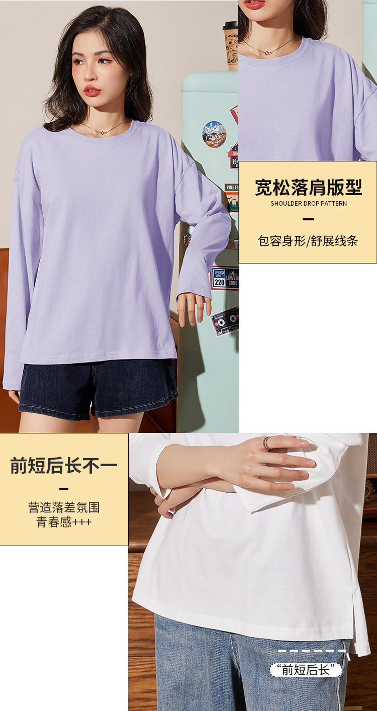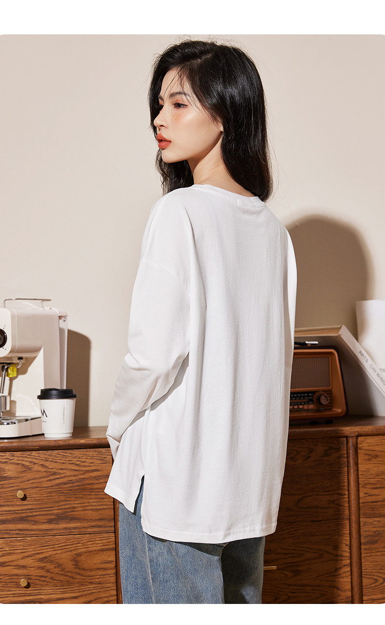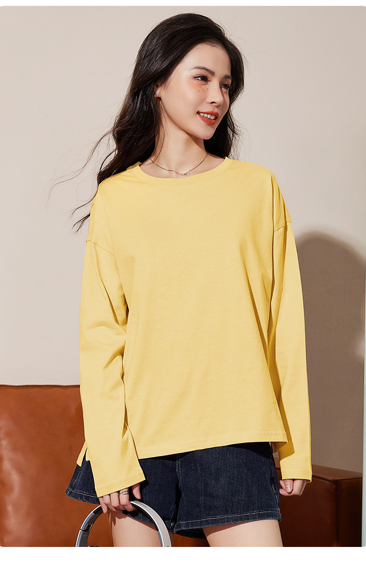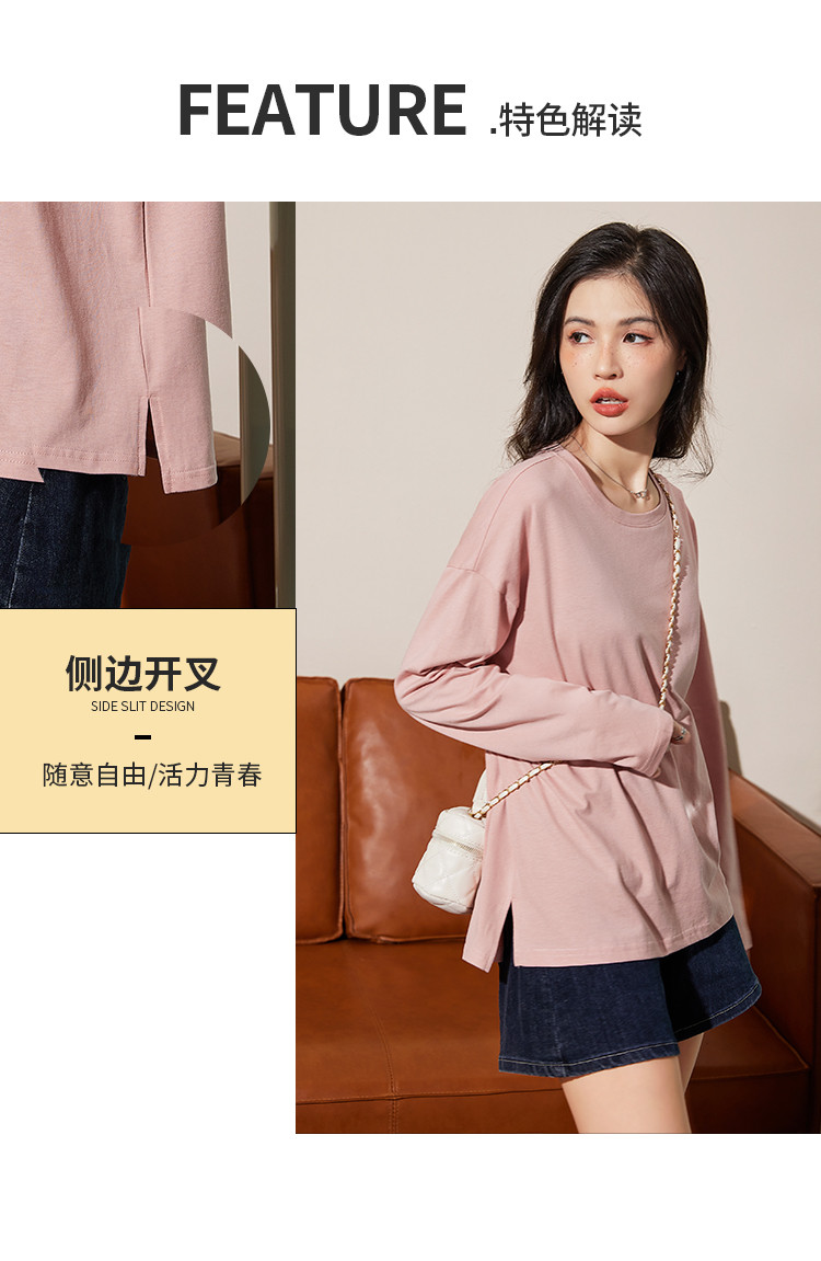 米子旗春秋季款圆领女士T恤纯色下摆开叉长袖上衣女 701722