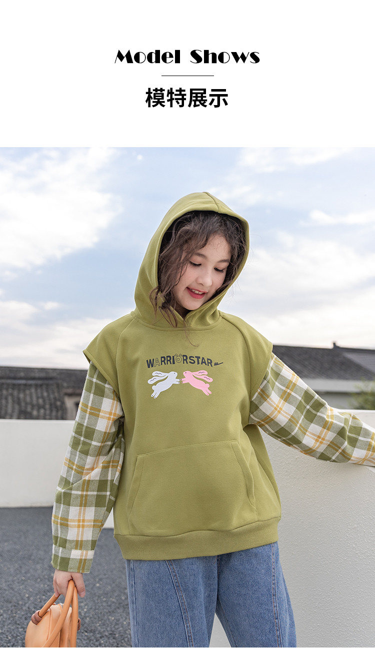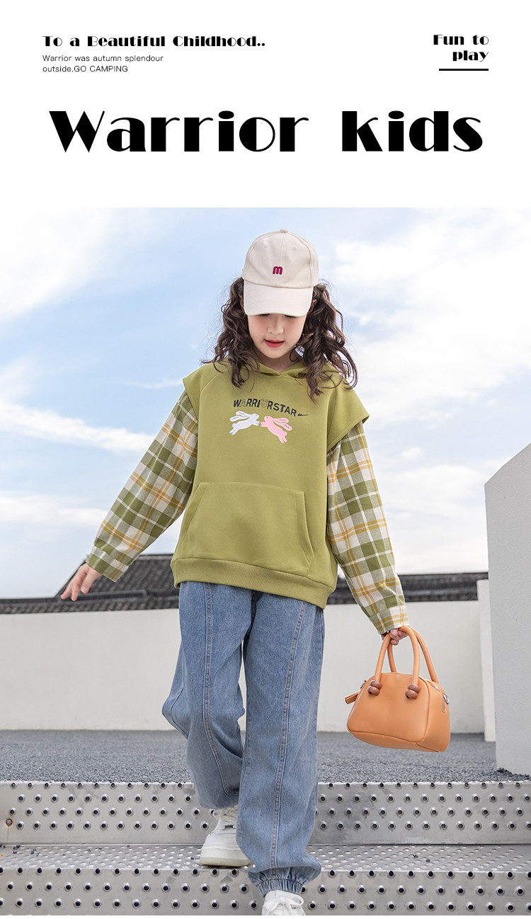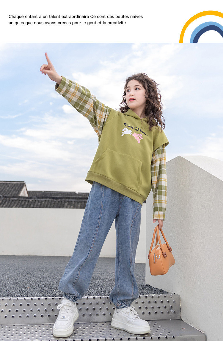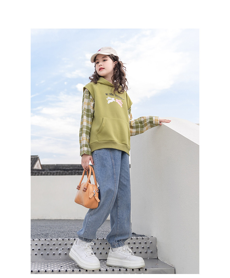 商品名称:【加绒可选】春季女童假两件连帽卫衣+收脚牛仔裤儿童套装 596755