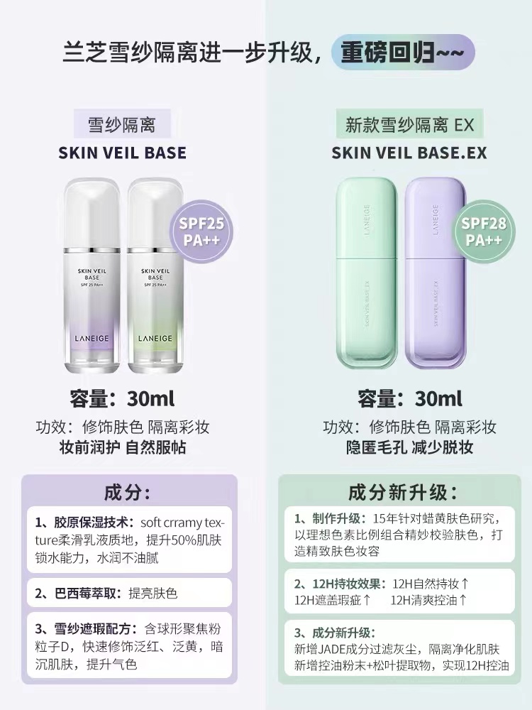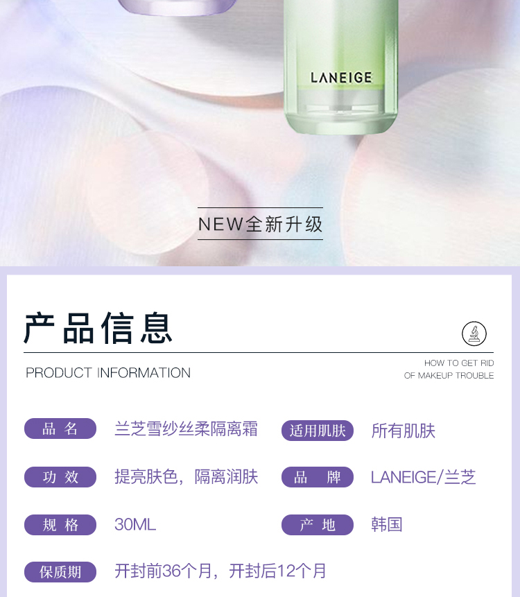 商品名称:Laneige/兰芝 雪纱防晒隔离霜 30ml(新旧包装随机发)