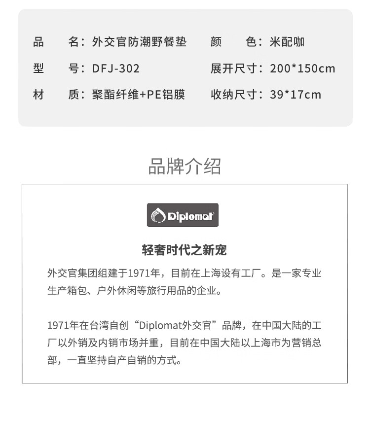 商品名称:外交官DFJ-302防潮野餐垫-米配咖