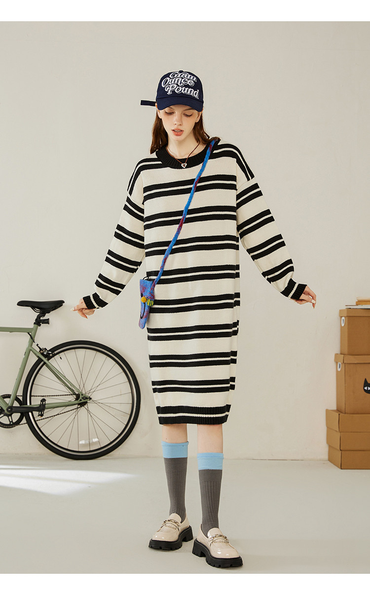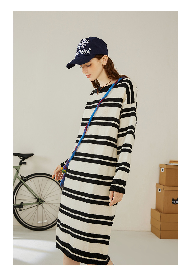 新撞色条纹设计圆领长袖中长款上衣休闲百搭连衣裙 499741
