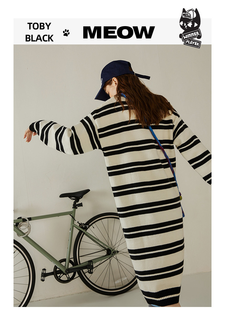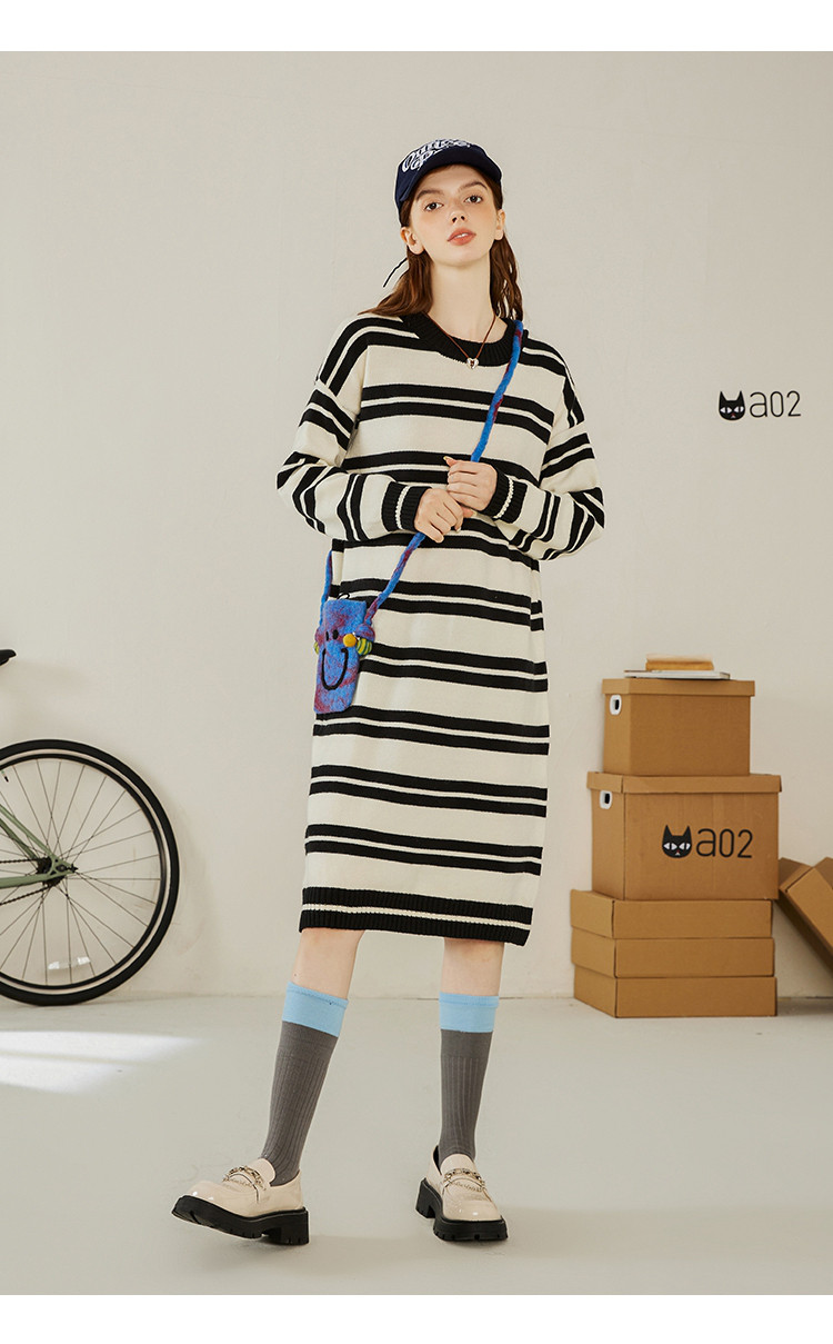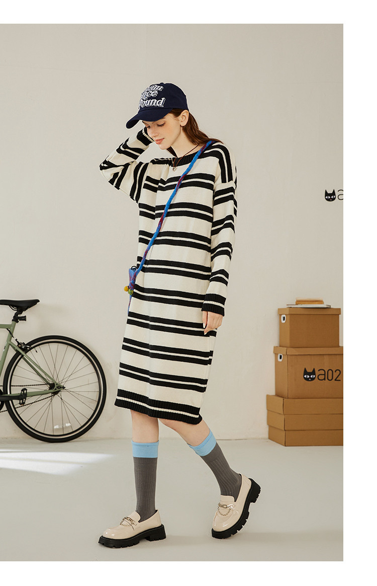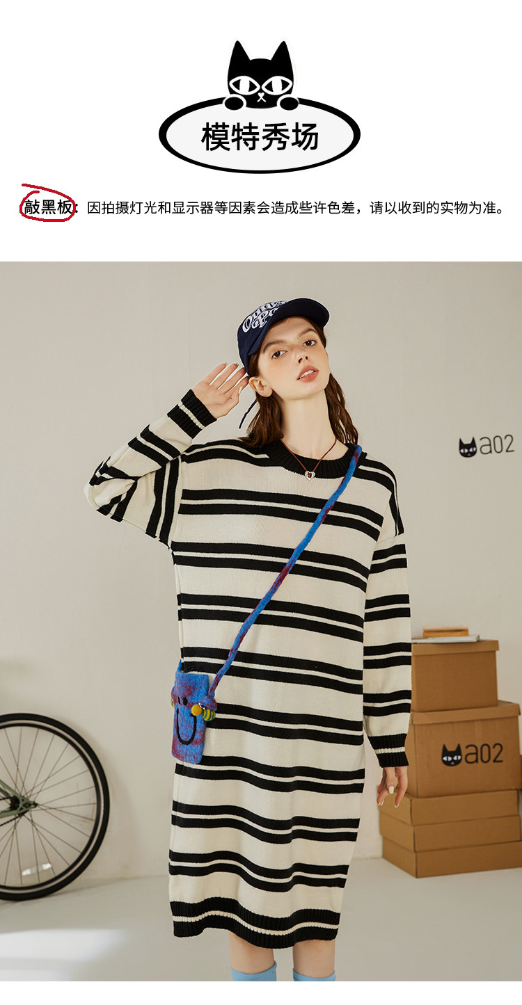 商品名称:新撞色条纹设计圆领长袖中长款上衣休闲百搭连衣裙 499741