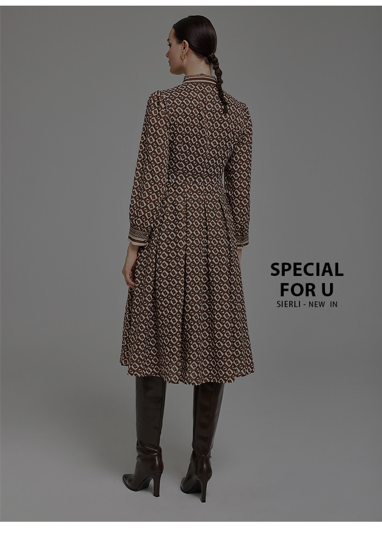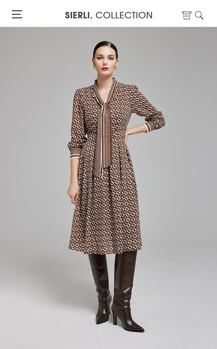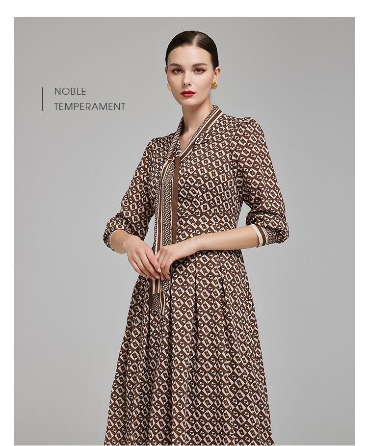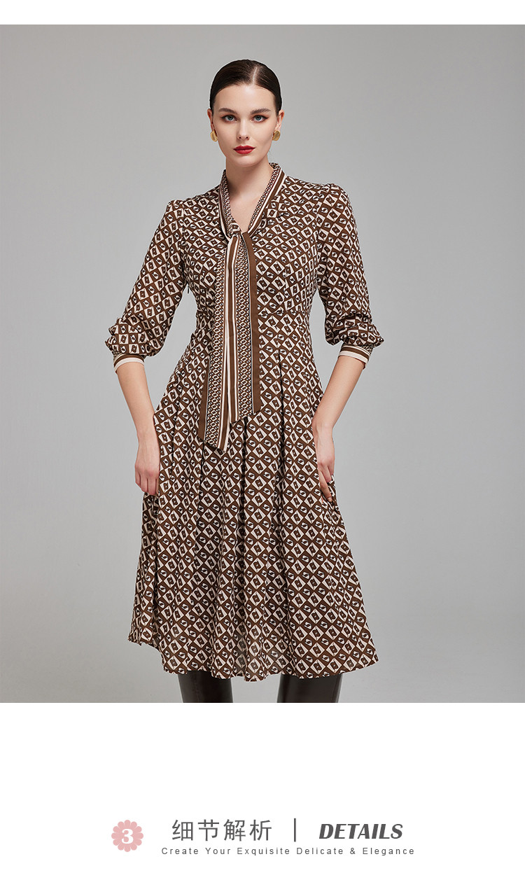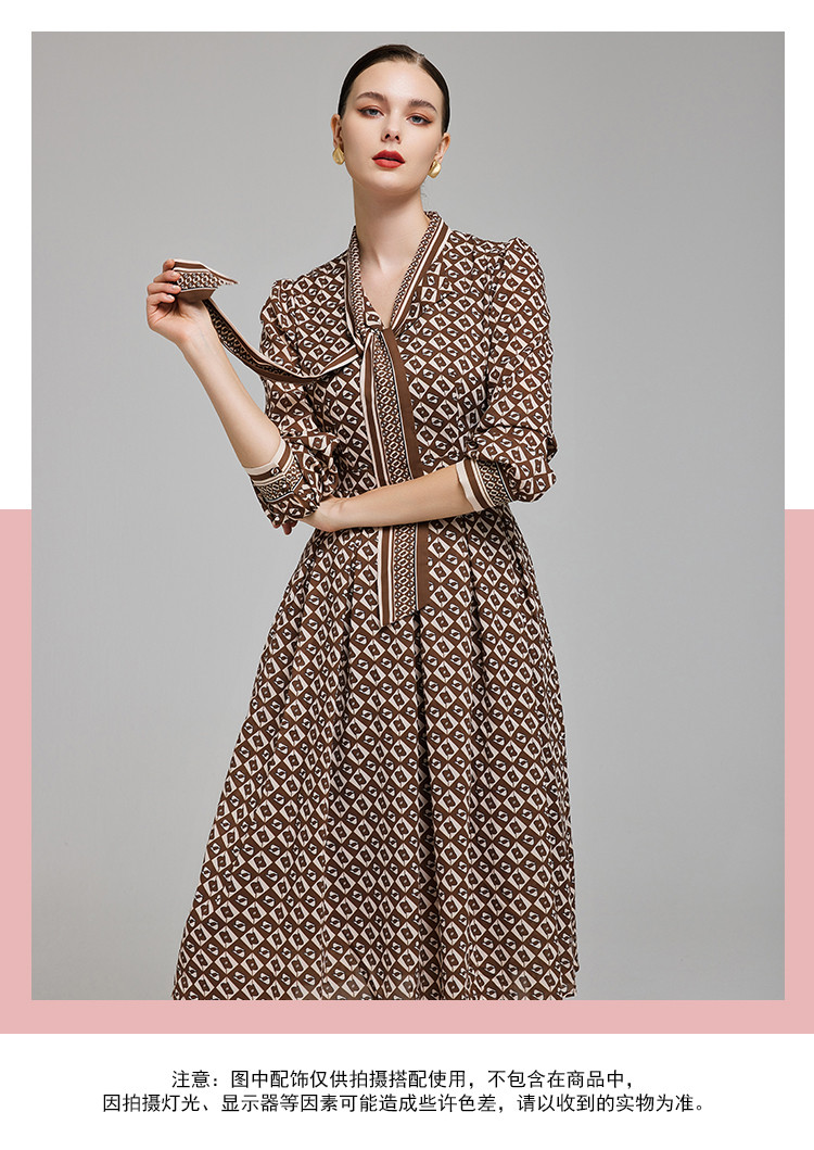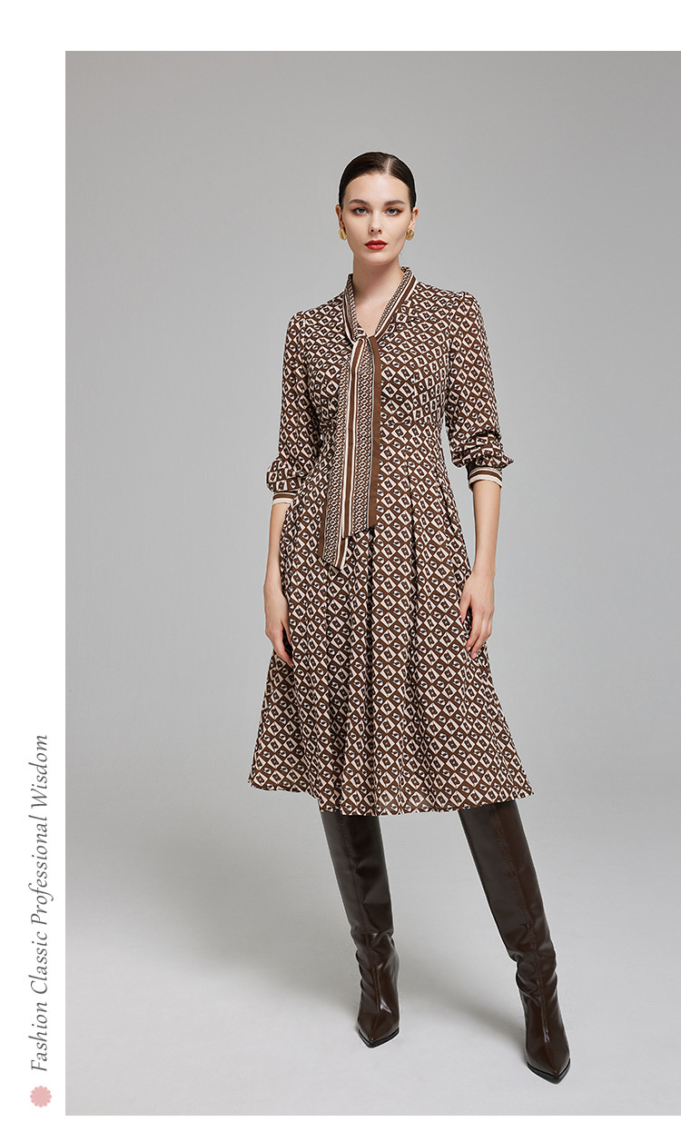 定位印花版飘带蝴蝶结下摆收褶通勤白领气质春秋季节连衣裙 089695