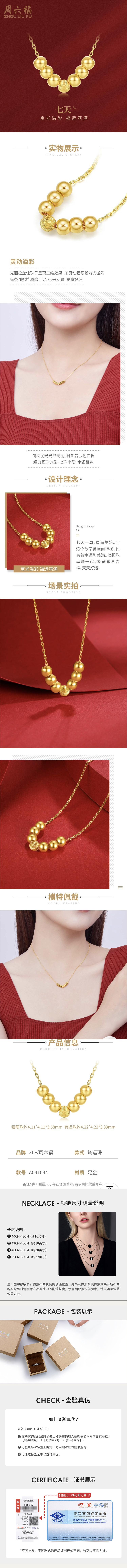 商品名称:周六福足金亮面车花七天转运珠金珠吊坠项链