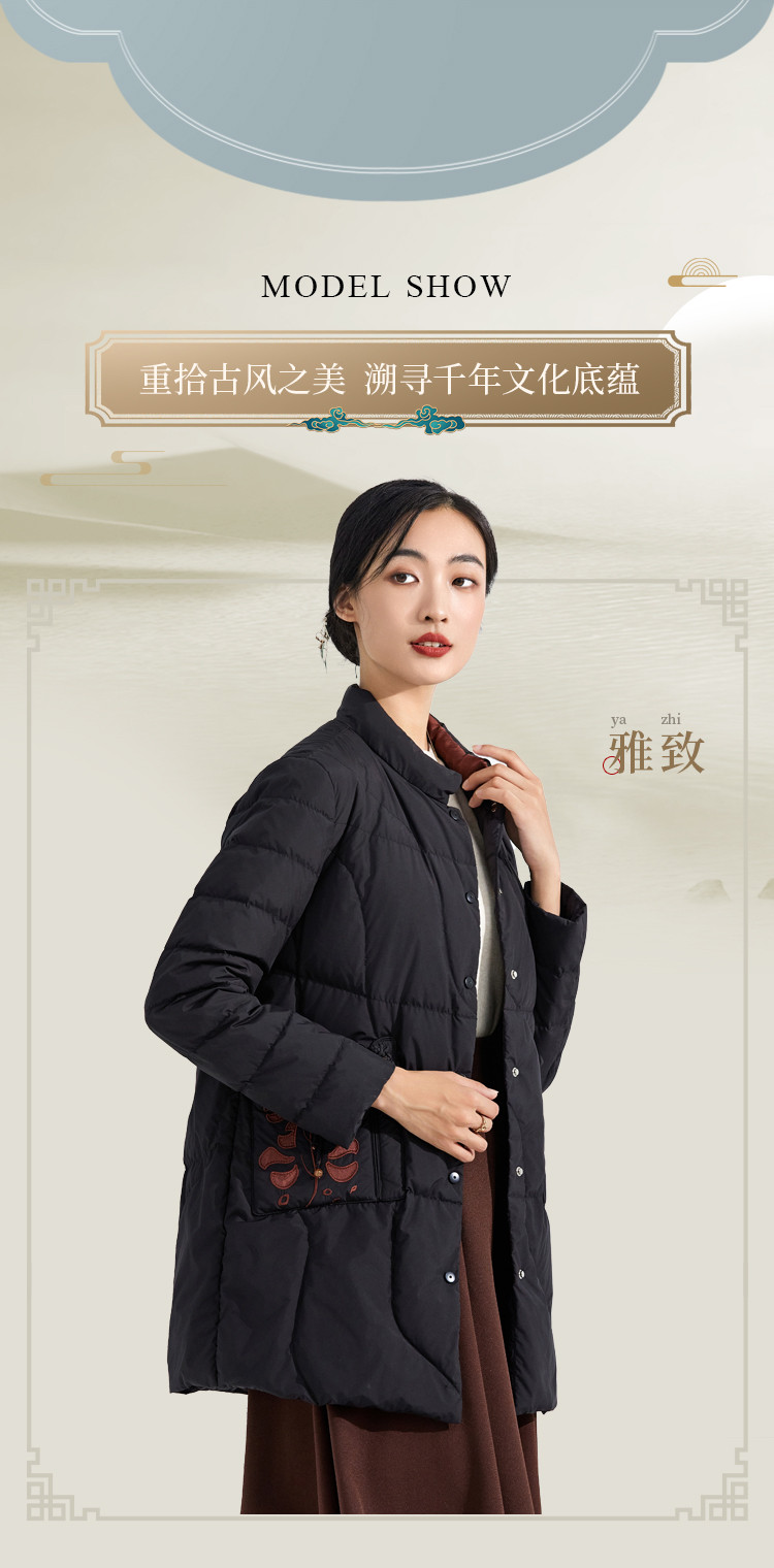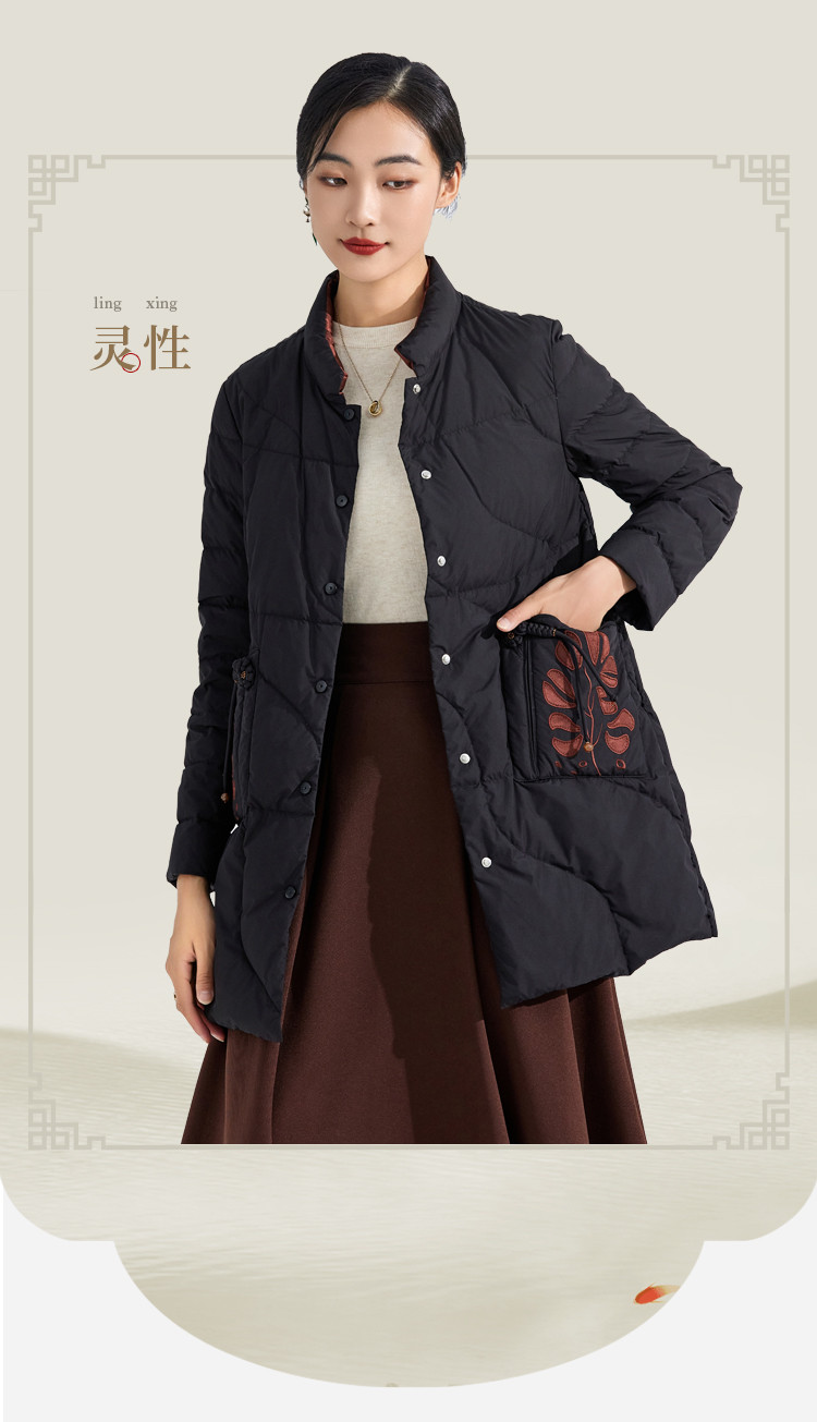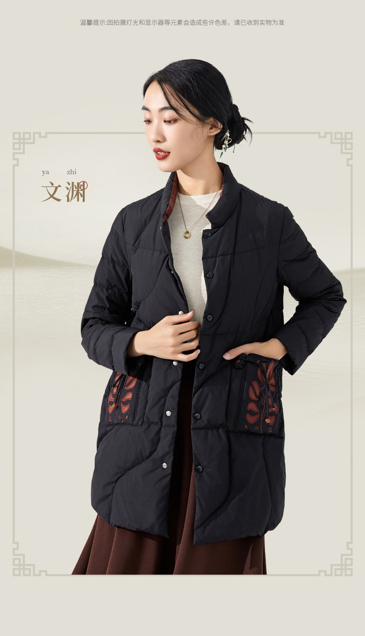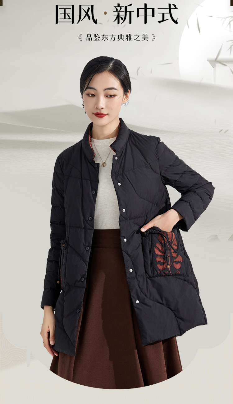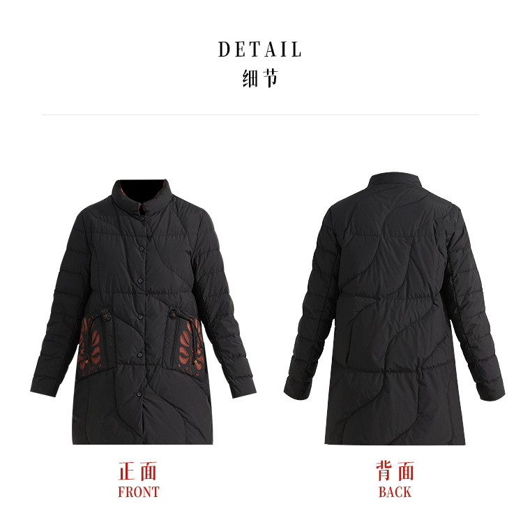 商品名称:【鹅绒】切线设计轻薄小立领女式单排扣中长款羽绒服 402655