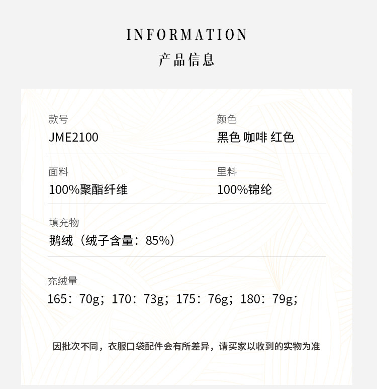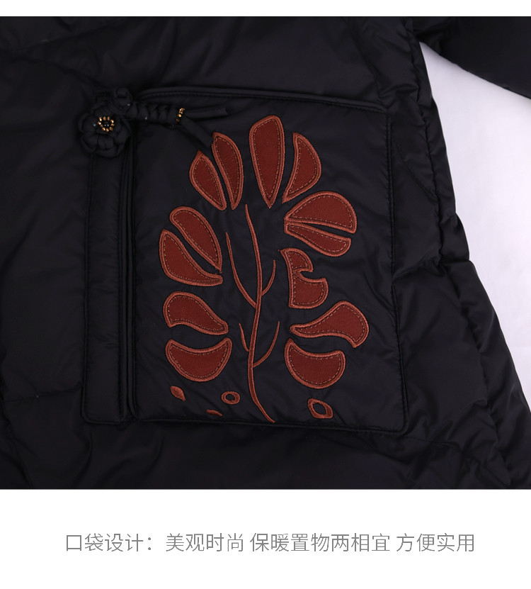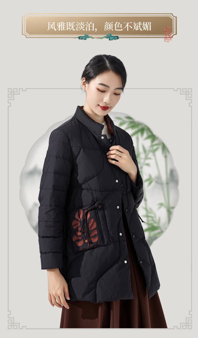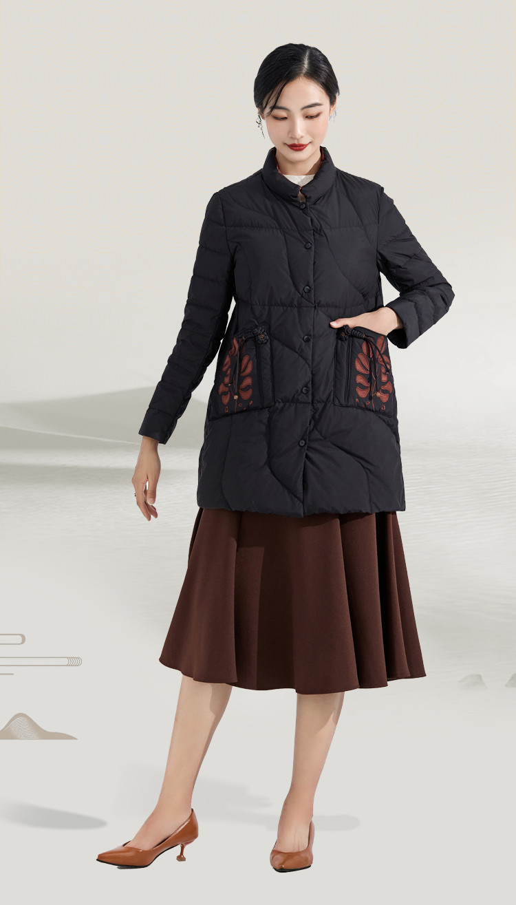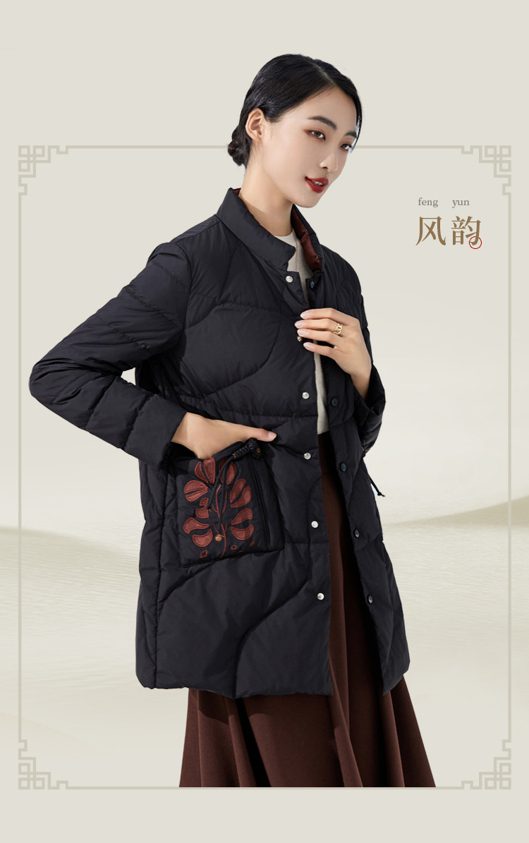 商品名称:【鹅绒】切线设计轻薄小立领女式单排扣中长款羽绒服 402655