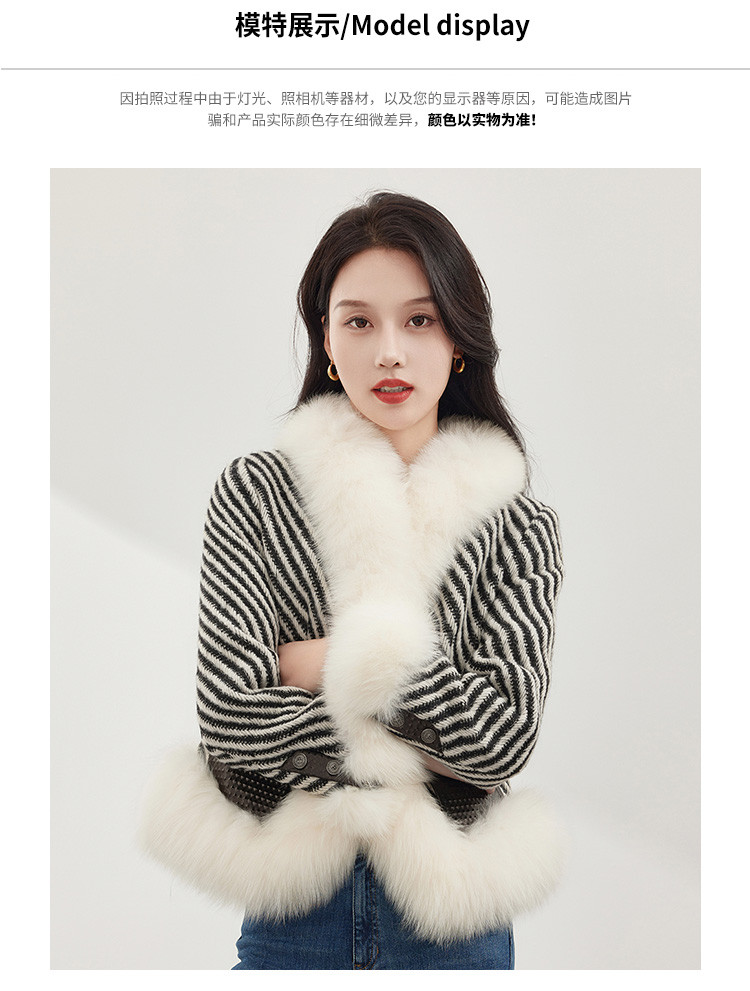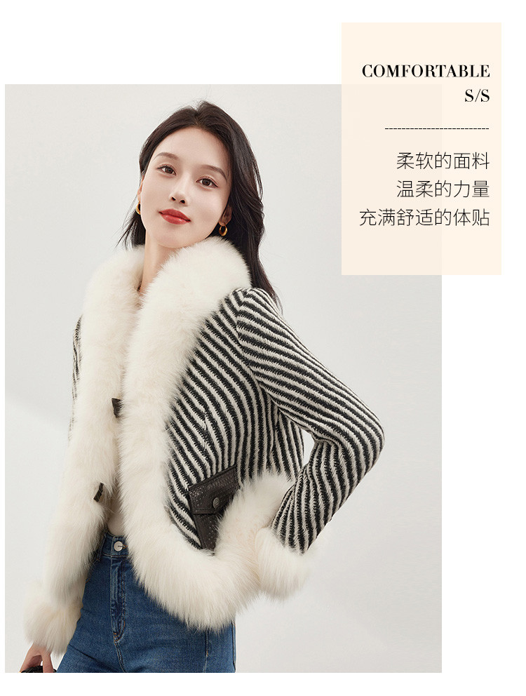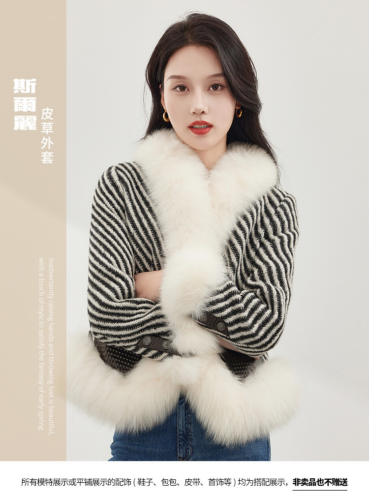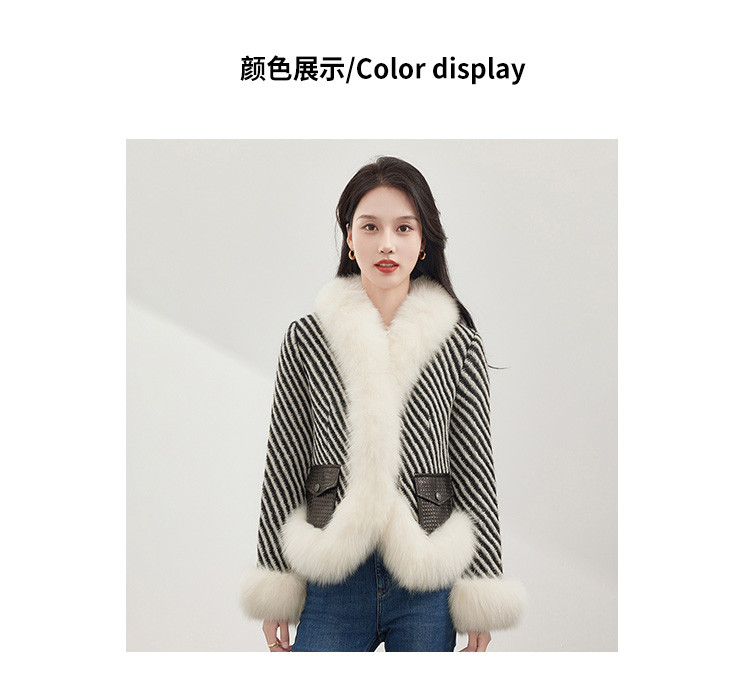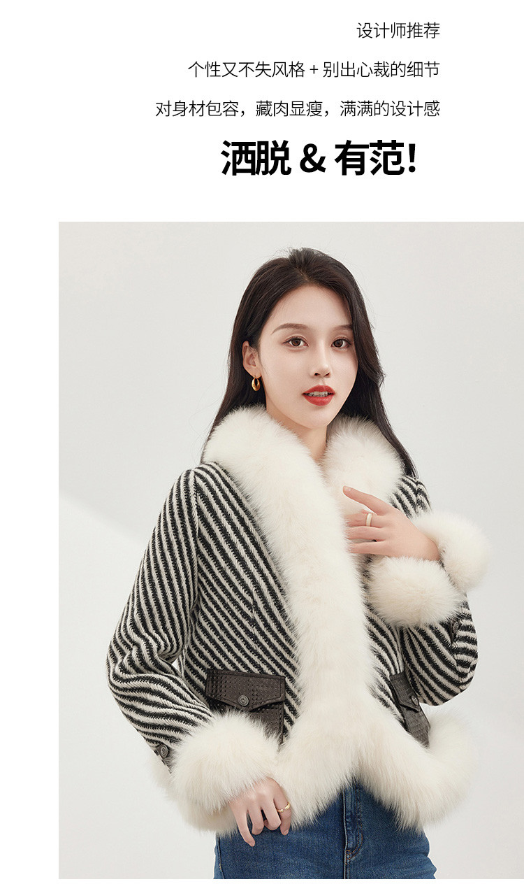 商品名称:冬季短款小香风绵羊皮拼接狐狸毛皮外套女式气质优雅休闲仿皮草 376095