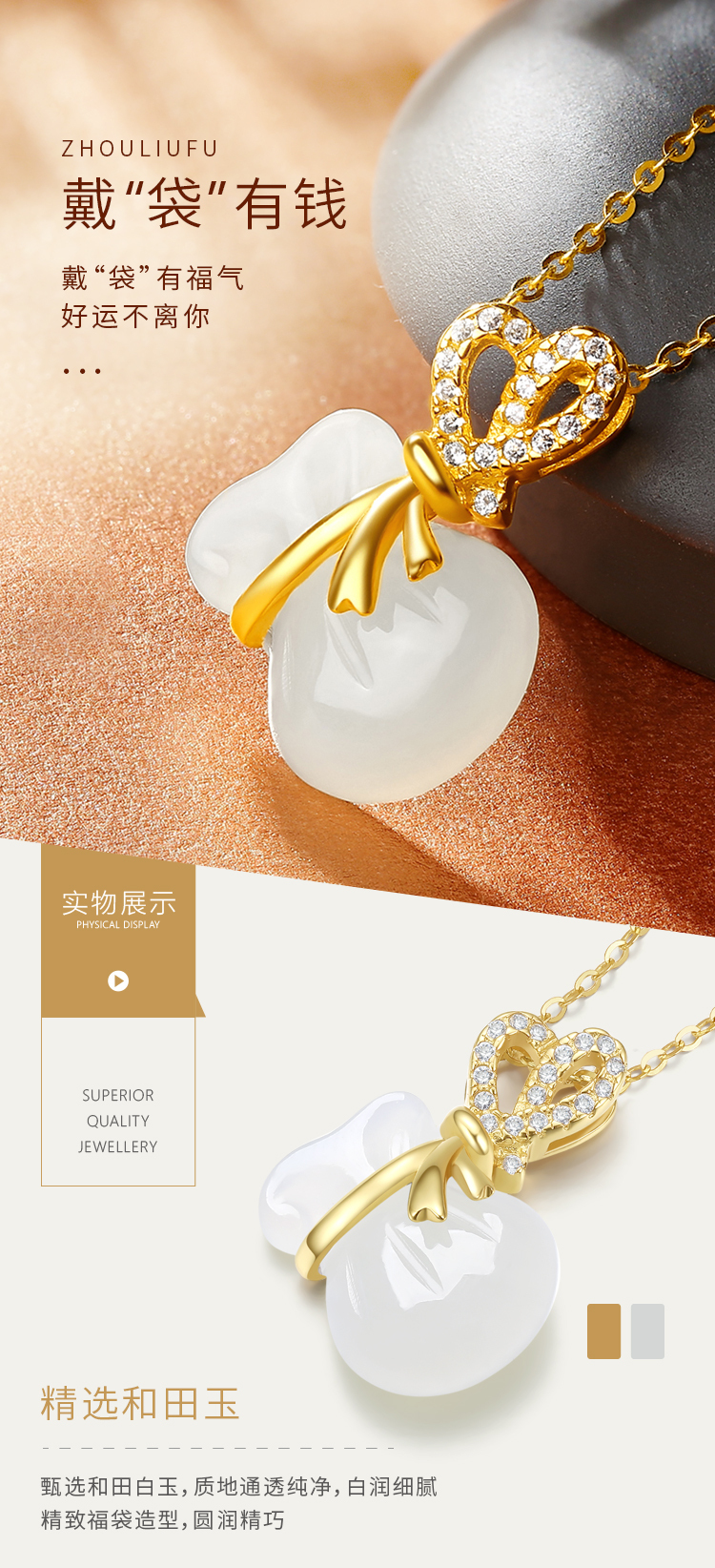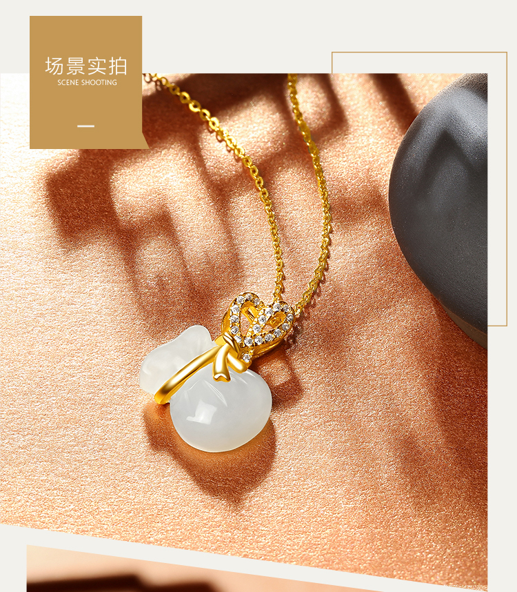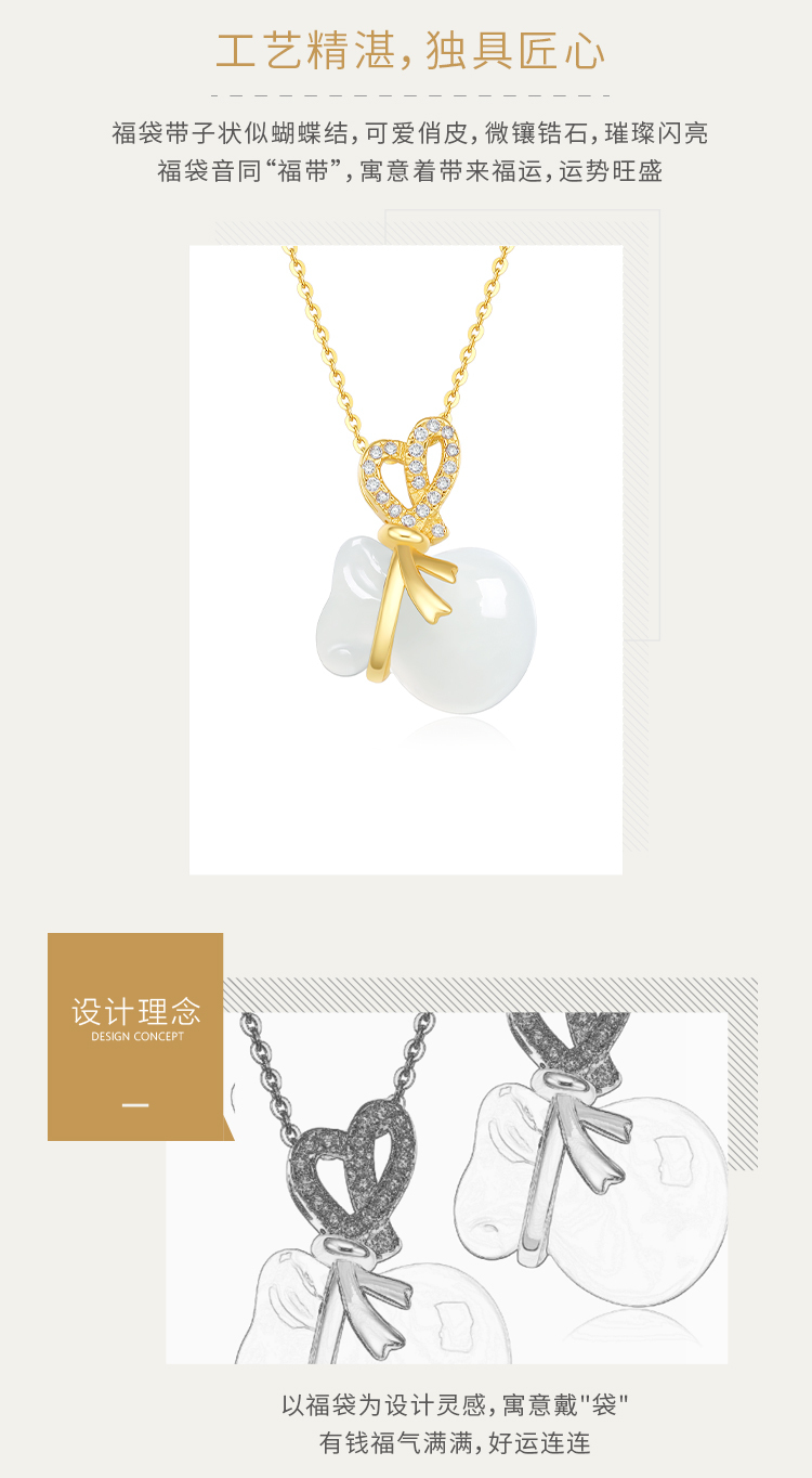 周六福S925银和田白玉戴袋有钱吊坠项链