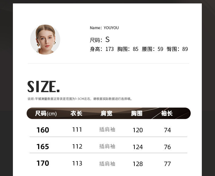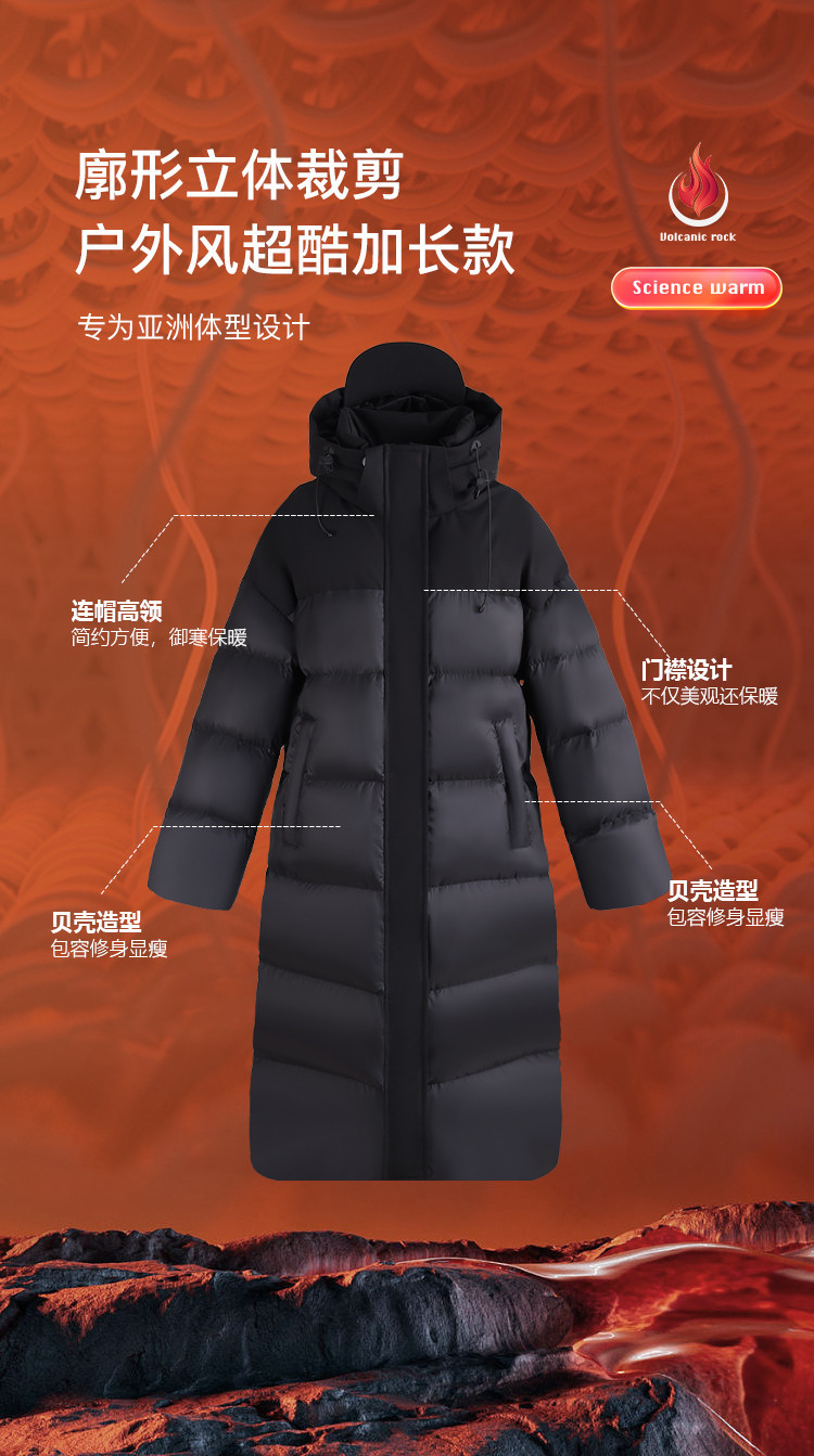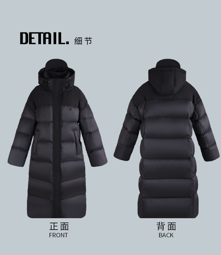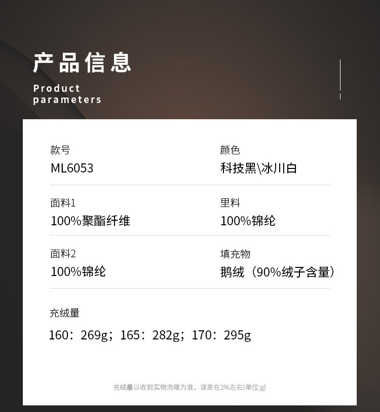| 尺码 | 衣长(cm) | 肩宽(cm) | 袖长(cm) | 充绒量(g) | 胸围(cm) | 下摆围(cm) | 号型 |