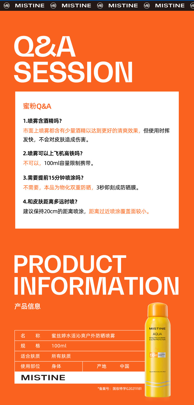 商品名称:Mistine/蜜丝婷 小黄喷防晒喷雾 100ml