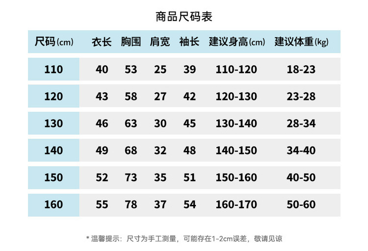 | 尺码 | 衣长(cm) | 肩宽(cm) | 身高(cm) | 袖长(cm) | 适合年龄 | 胸围(cm) | 号型 |
