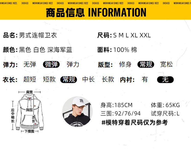 商品名称:Dickies秋季男式纯棉休闲连帽套头卫衣 DK007305 580816