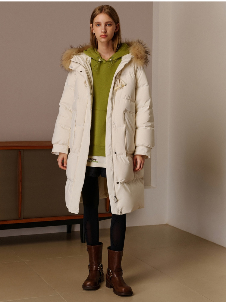 小熊女式蓬松大毛领羽绒服冬季简约中长款连帽保暖加厚羽绒外套女 546433
