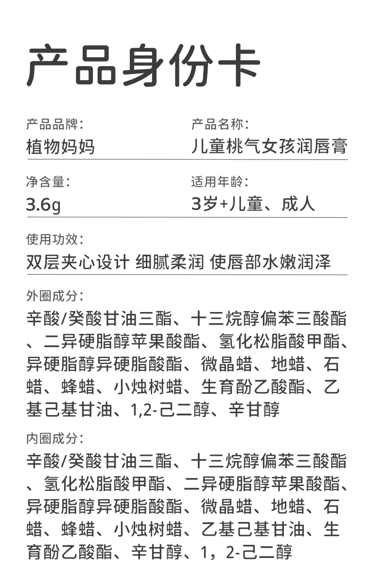 商品名称:植物妈妈桃气女孩润唇膏3.6g小女孩专用宝宝润唇膏滋润保湿防干裂孕妇可用