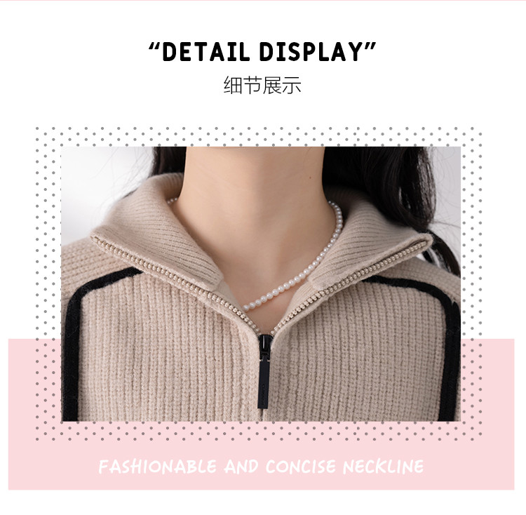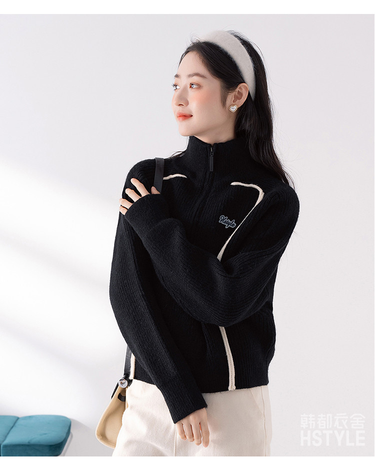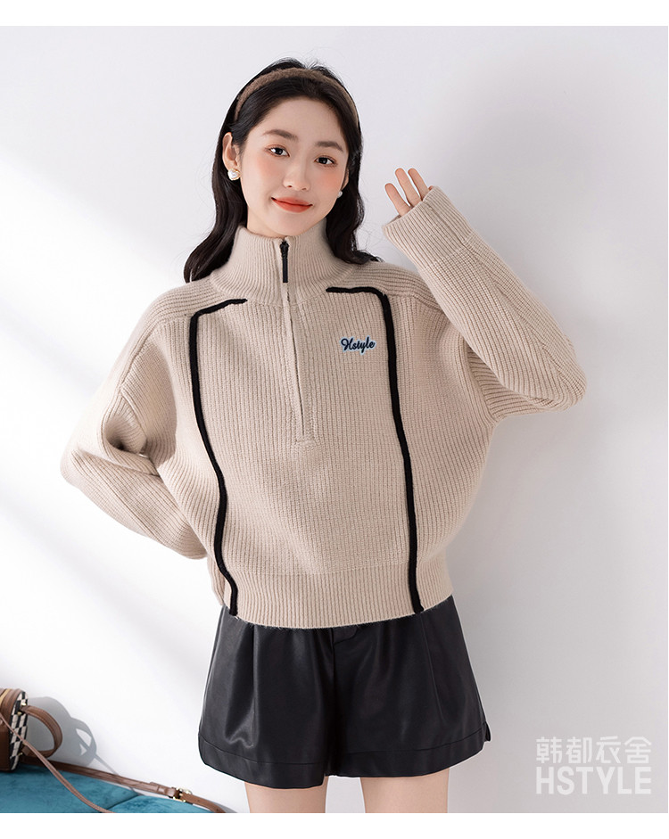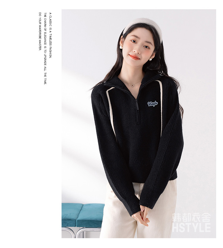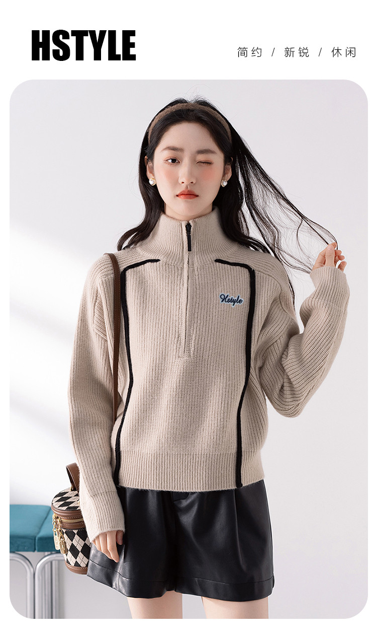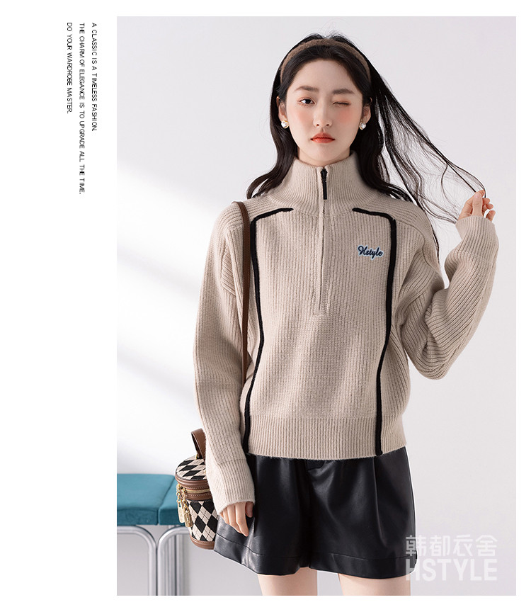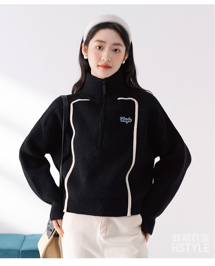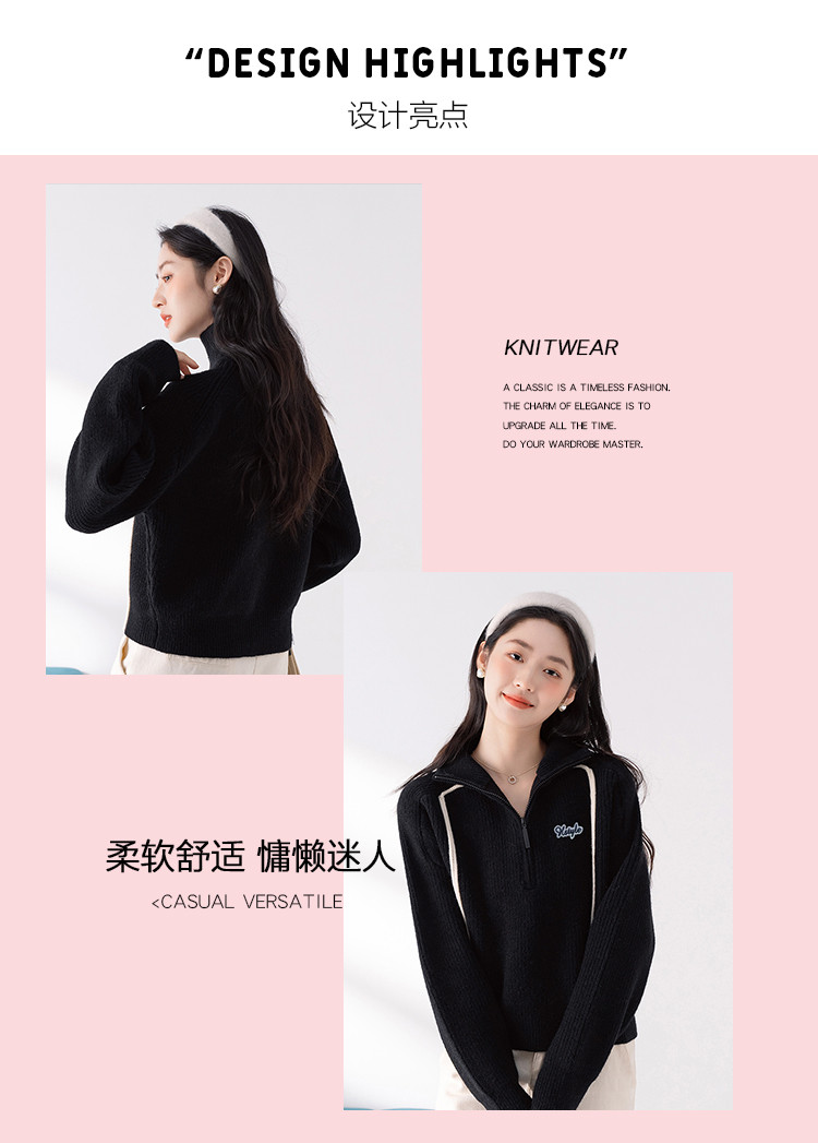 商品名称:【半拉链立领套头衫】早春款条纹拼色设计感长袖上衣女式针织衫 606603